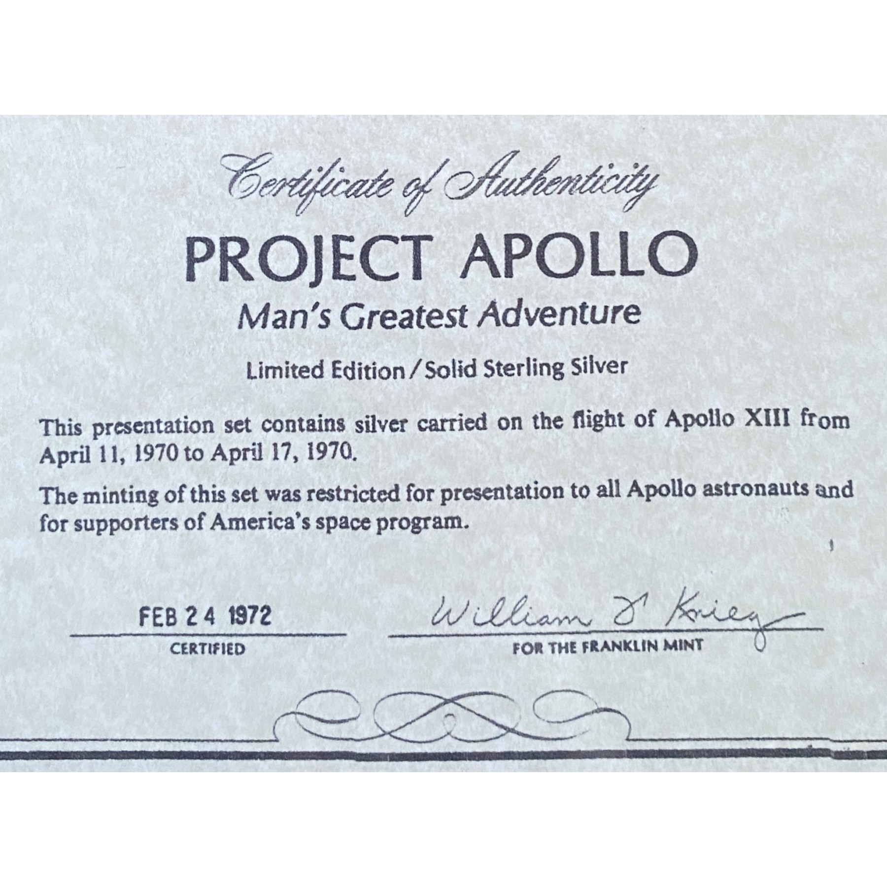 This limited edition solid sterling silver coin was minted from silver that traveled aboard the Apollo XIII mission. Measuring 1 3/16” in diameter, the coin bears the inscription “Man’s Greatest Adventure”, commemorating one of NASA’s most dramatic & heroic missions. Framed for display, it is accompanied by a Certificate of Authenticity from the Franklin Mint.