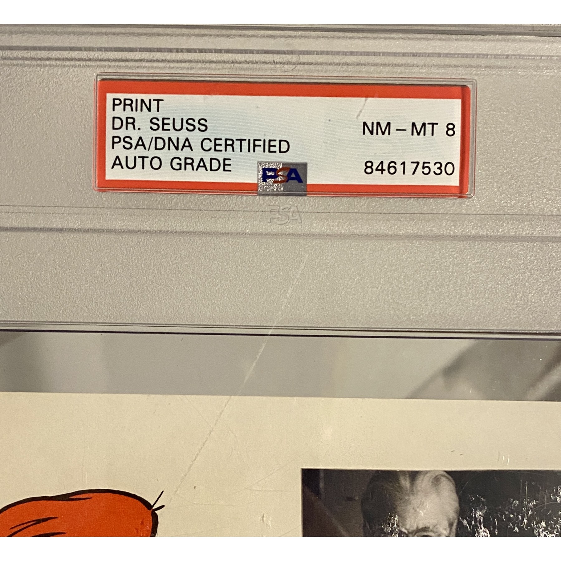This delightful Dr. Seuss signed thank you note, featuring The Cat In The Hat character, measures approximately 5" x 8" and is signed boldly in his iconic style. The piece is encapsulated with an Auto Grade of 8 and comes with a PSA Letter of Authenticity. Dr. Seuss, beloved for his whimsical rhymes and imaginative characters, enchanted readers of all ages with classics like The Cat in the Hat and Green Eggs and Ham.