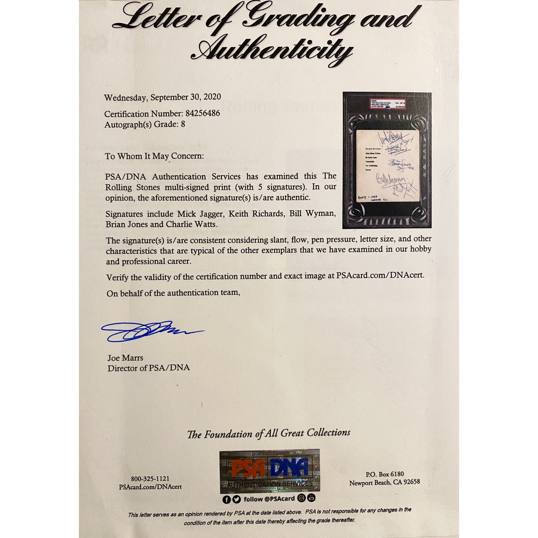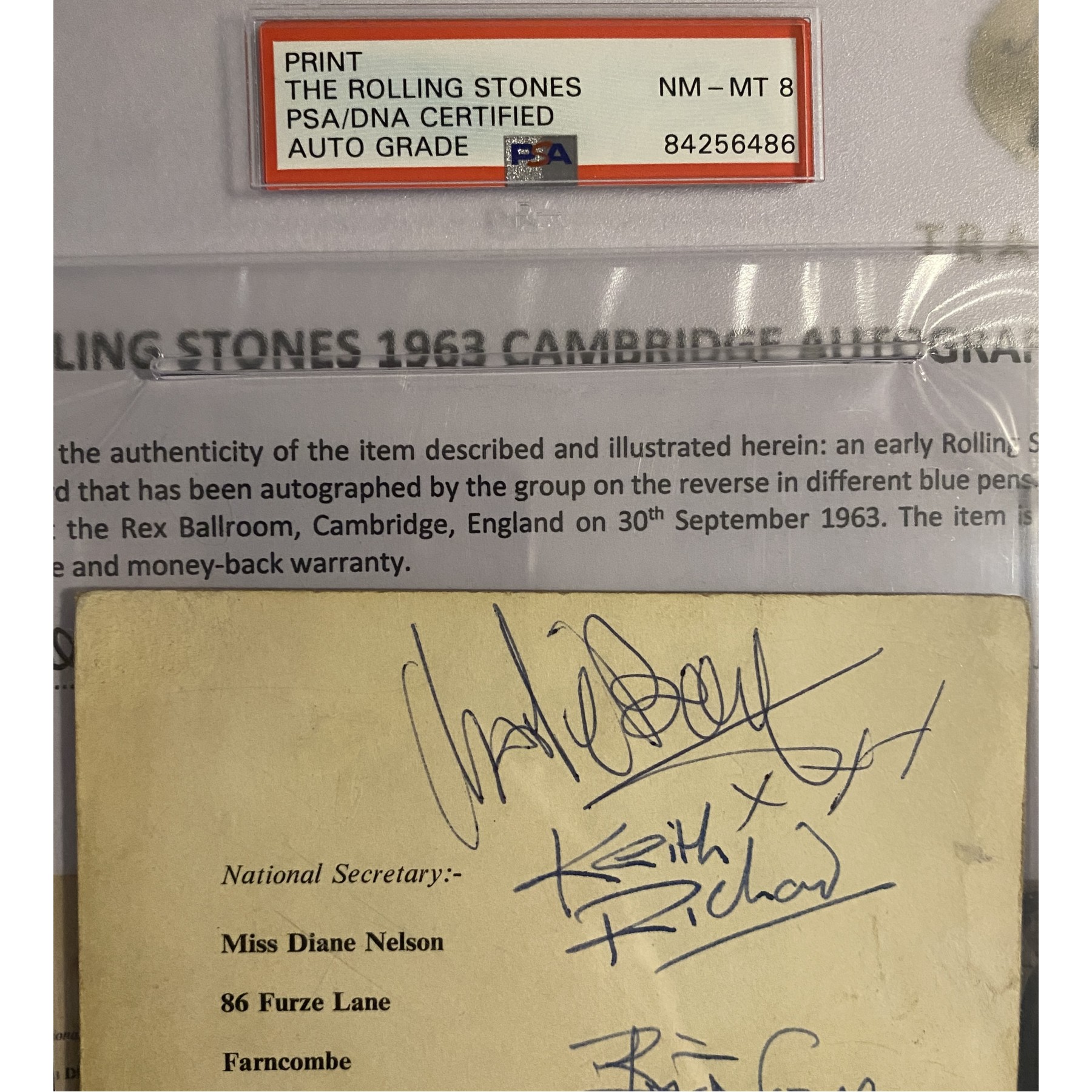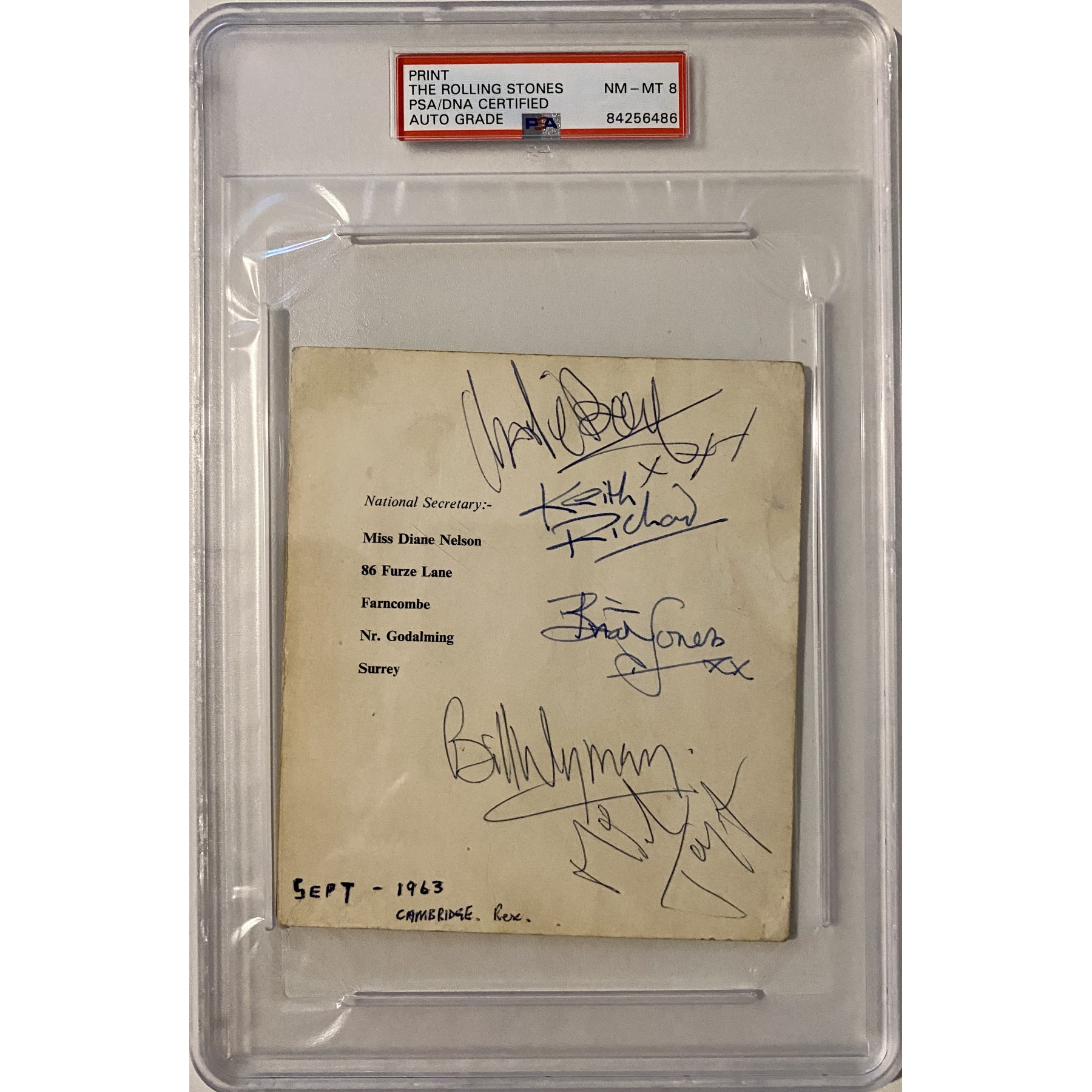 This 1963 Rolling Stones fan club card was signed by the entire band - Mick Jagger, Keith Richards, Charlie Watts, Brian Jones, & Bill Wyman - during their early days at the Rex Ballroom in Cambridge, England. Often hailed as the "Greatest Rock and Roll Band in the World," the Rolling Stones revolutionized music with their raw energy and iconic hits. The signatures are encapsulated with a PSA auto grade of 8 and come with PSA and Paul Wane letters of authenticity, making this a must-have piece for collectors of rock history!