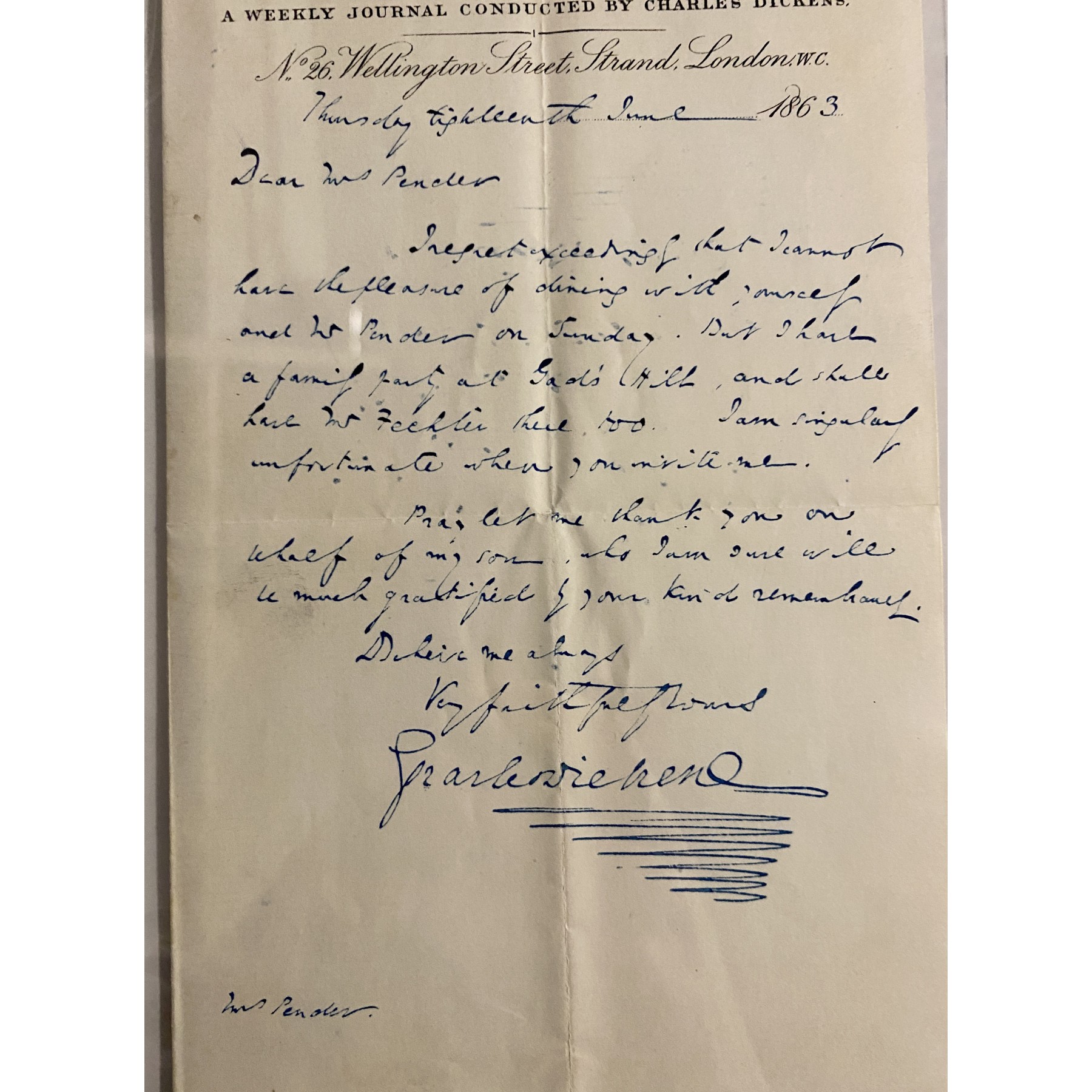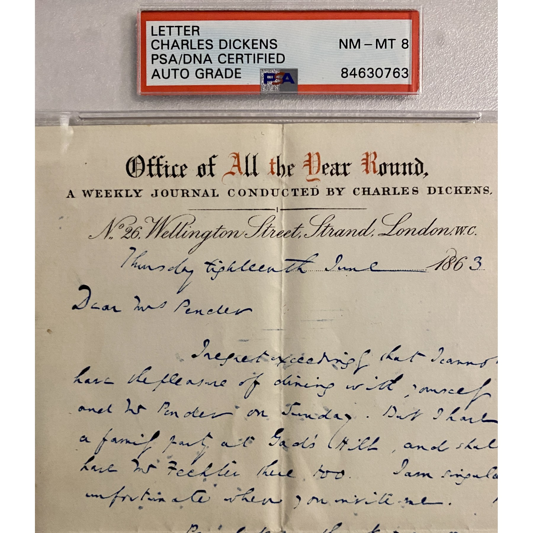 This signed, handwritten letter by Charles Dickens is written on the letterhead of his publication, "All The Year Round." In this letter, Dickens politely declines a dinner engagement invitation from Emma Pender, the second wife of Scottish textile merchant Sir John Pender. The signature is encapsulated with a PSA letter of authenticity & auto grade of 8. Charles Dickens, one of the most celebrated English novelists, is best known for works such as "A Christmas Carol" and "Great Expectations," shaping the literary landscape of the 19th century.