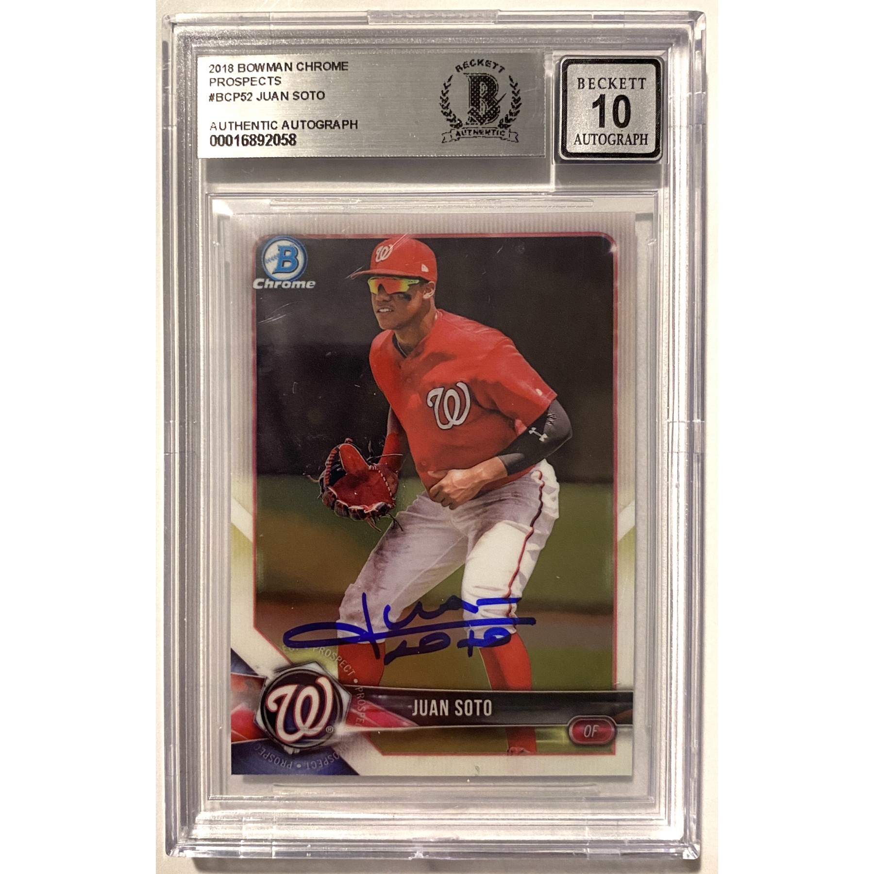 This Juan Soto 2018 Bowman Chrome Prospects baseball card is boldly signed in blue ink - Beckett authenticated & encapsulated with an Auto Grade of 10.