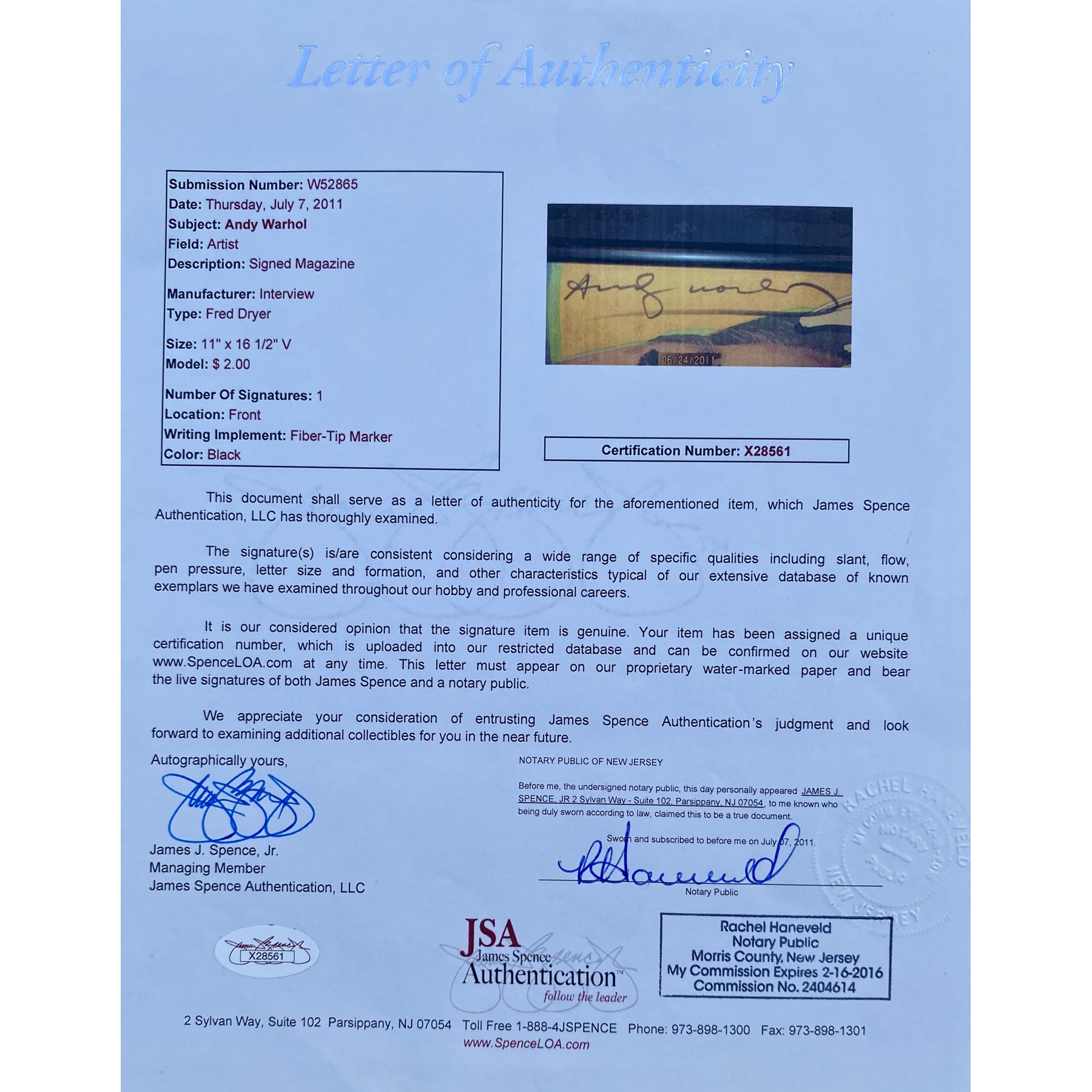 Item #0489 Andy Warhol Signed Interview Magazine - PSA/DNA