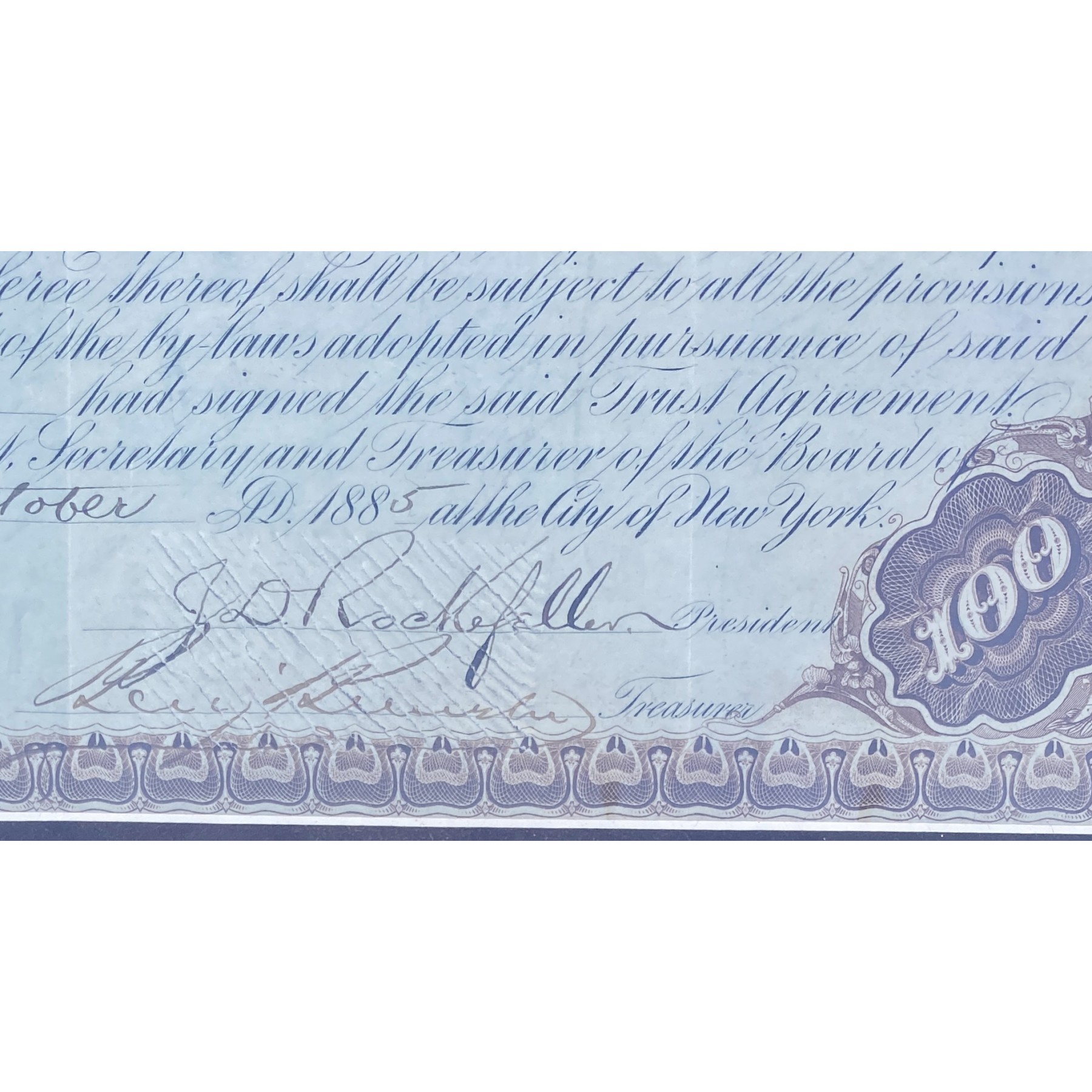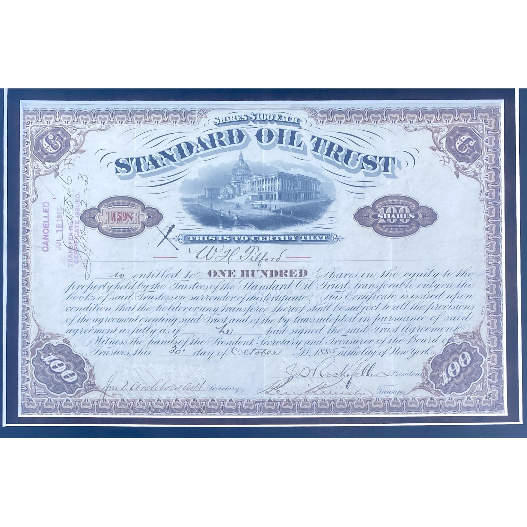 This historically significant 1885 stock certificate for a “W.H. Tilford” to receive 100 shares in the Standard Oil Trust is boldly signed in fountain pen by industrial titan John D. Rockefeller. As founder of Standard Oil, Rockefeller revolutionized the petroleum industry and became the nation’s first billionaire, shaping modern capitalism. Comes complete with a PSA/DNA letter of authenticity.