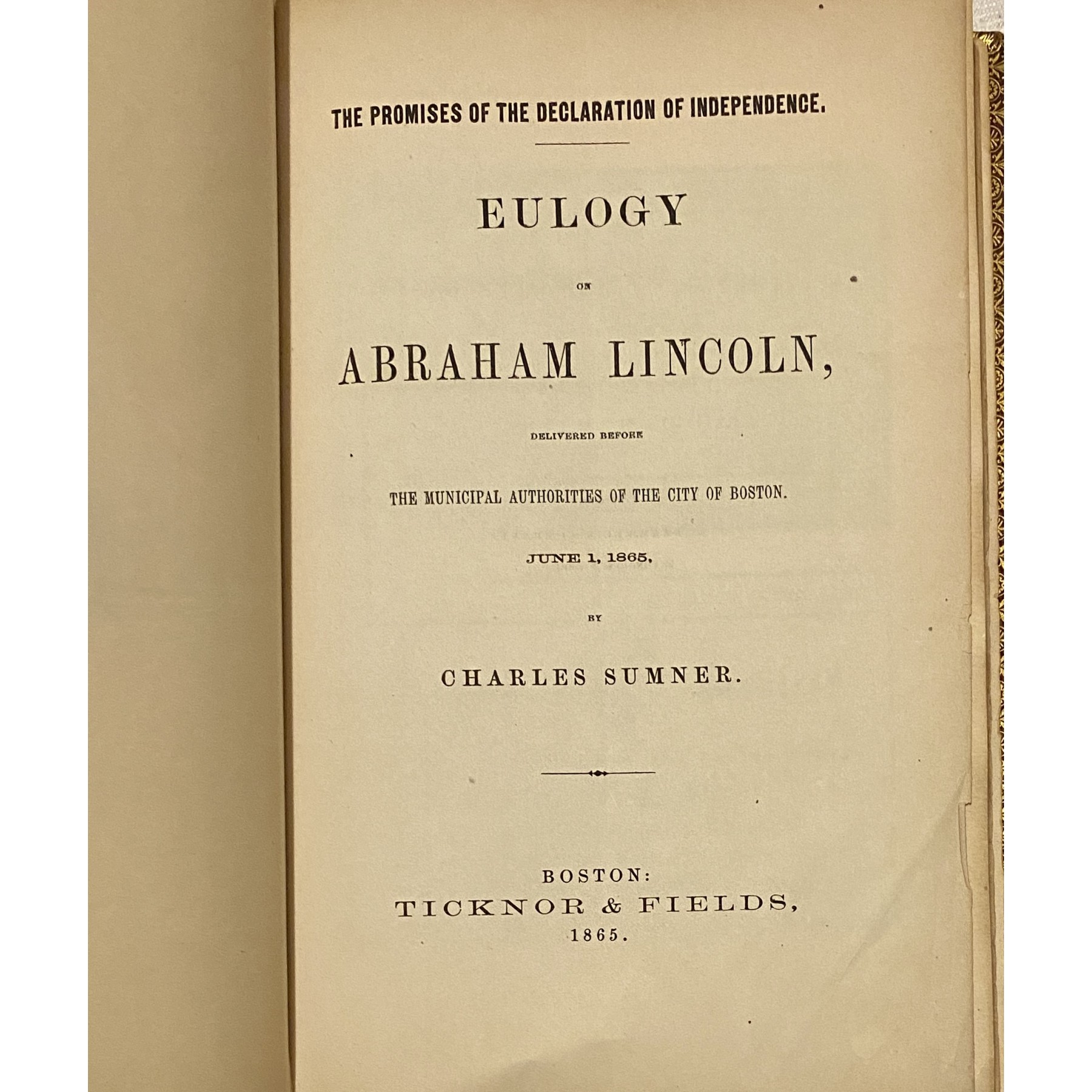 Unique extra-illustrated book: Promises of the Declaration of Independence: Eulogy on Abraham Lincoln by Charles Sumner. Boston: Ticknor & Fields, 1865.