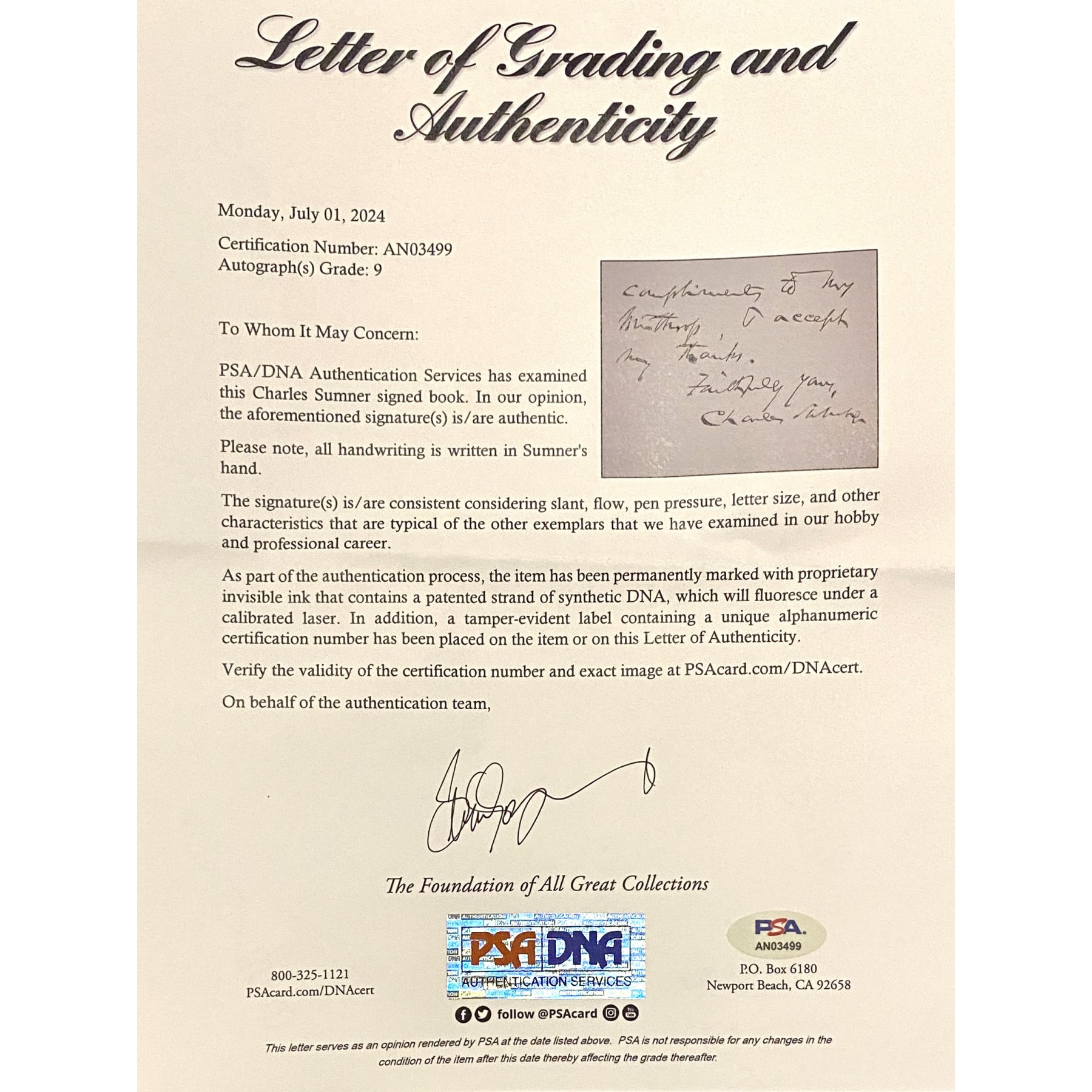 Authentication: PSA/DNA Letter of Authenticity