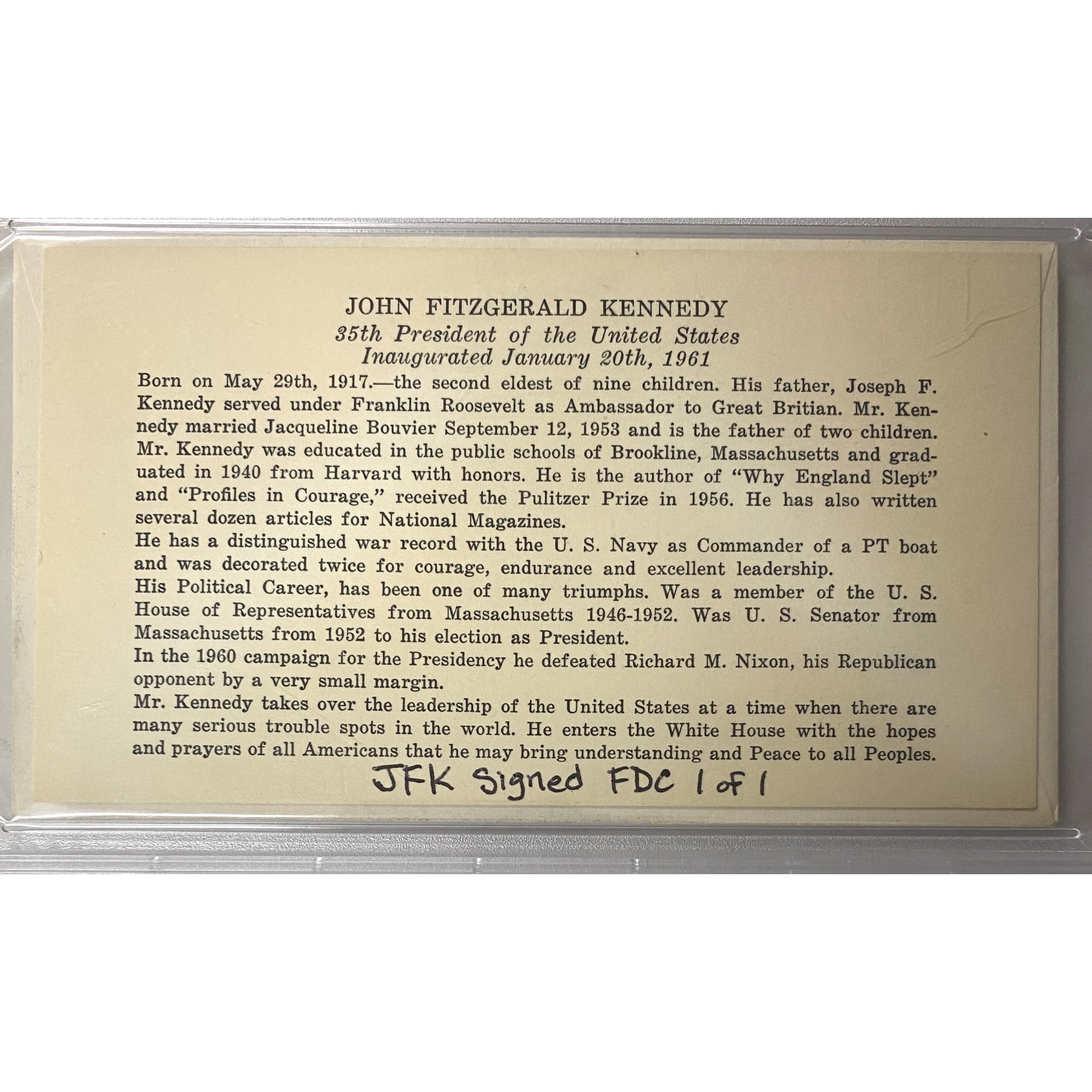 John F. Kennedy Signed Inauguration Day First Day Cover & Bio Card in PSA DNA Encapsulation - Notated 1 of 1! This incredible piece of U.S. history is an Inauguration Day first day cover signed by the 35th President of the United States, John F. Kennedy. The cover has been authenticated and encapsulated by PSA/DNA, along with the biography card which would have been housed inside the envelope. The envelope is signed by the President in black ink in the lower right-hand corner. Although these first day covers are fairly common in today's market, it is nearly impossible to find a hand signed and certified specimen such as this.