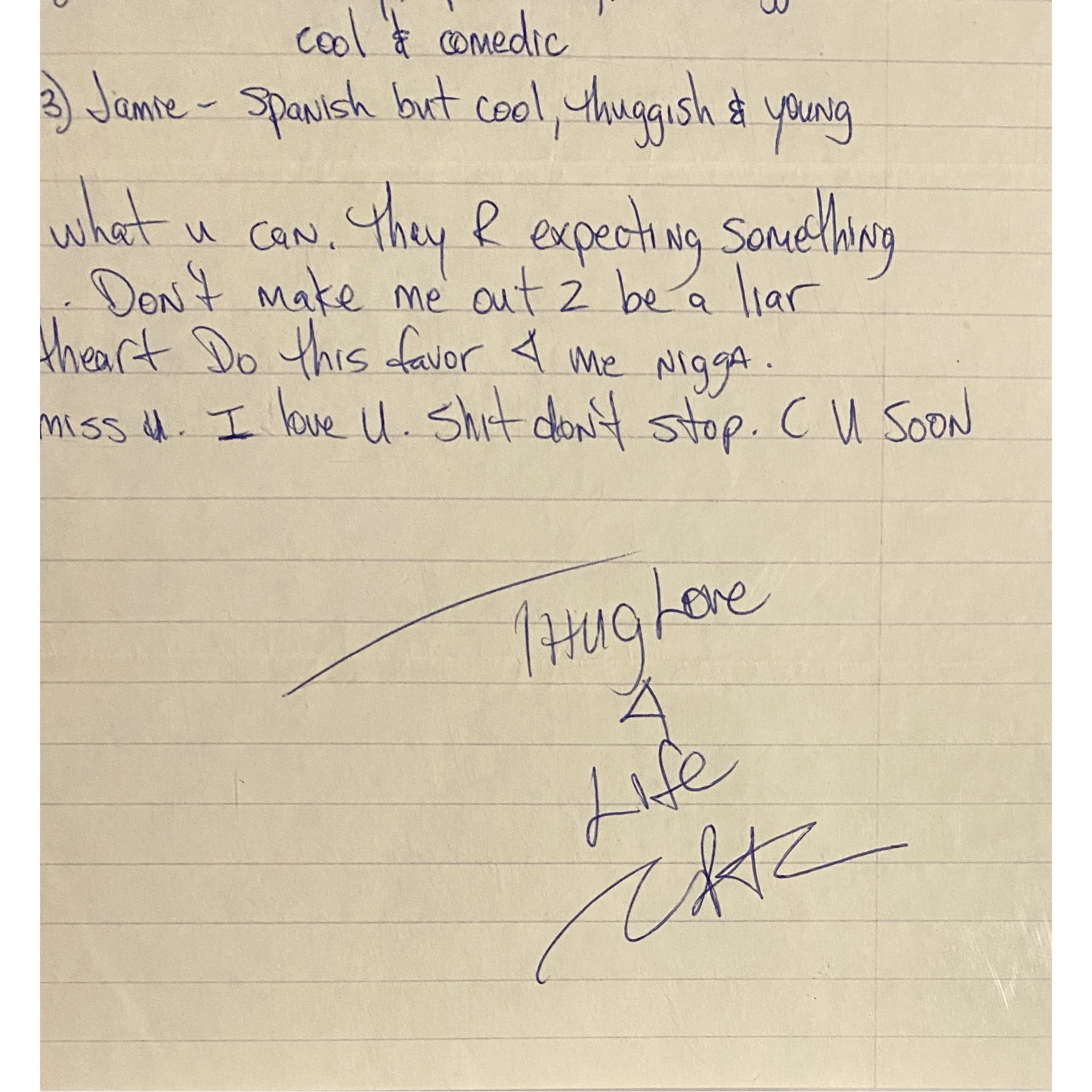 This scarce and handwritten letter from Tupac Shakur, boldly signed “Thug Love 4 Life, 2Pac,” dated September 17, 1995, and penned from Clinton Correctional Facility. Written to close friend Desiree Smith, the one-page letter offers candid instructions and reflections.