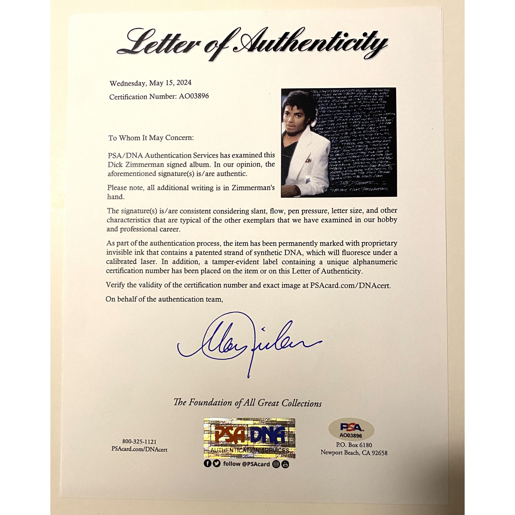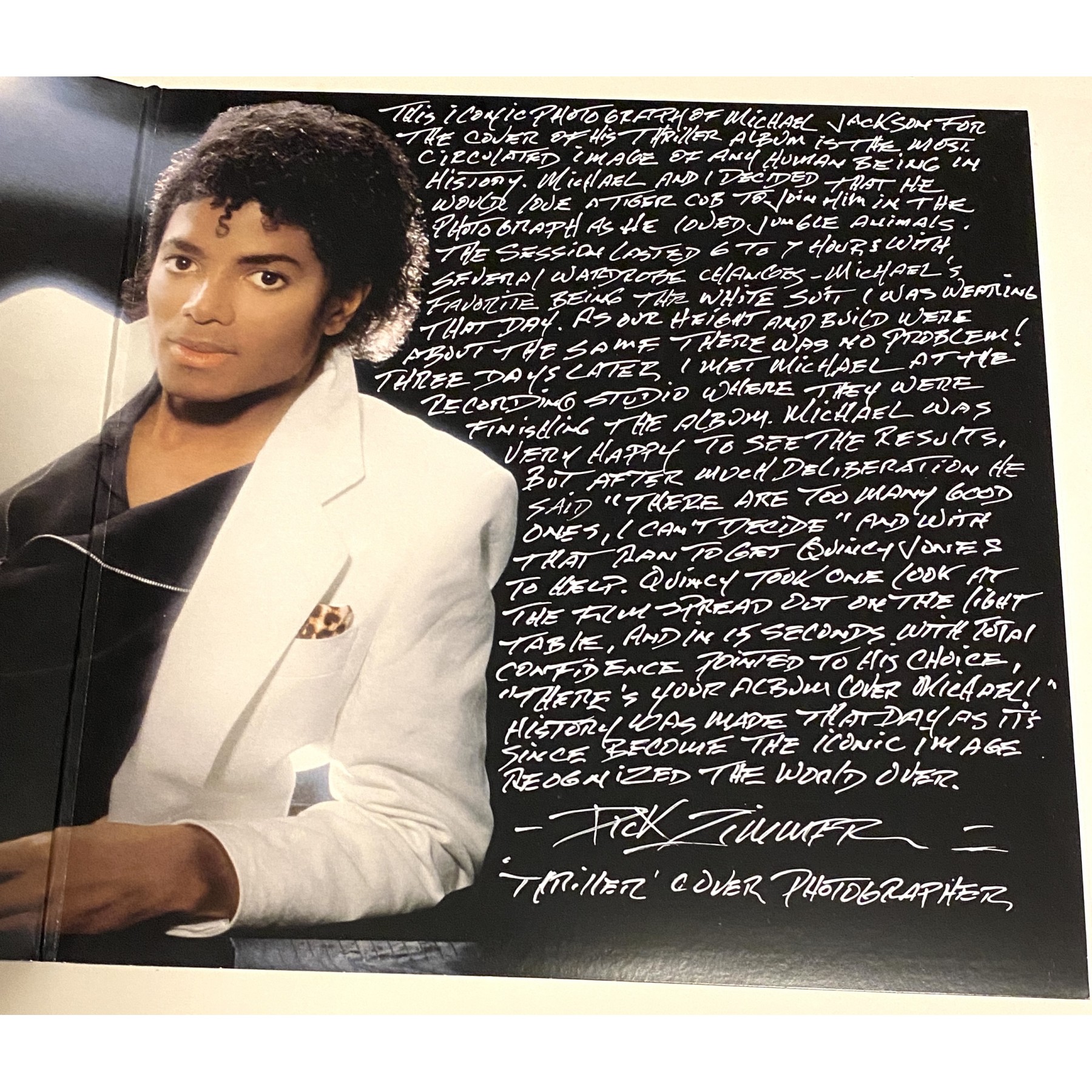 Also included in this set is a second copy of the album signed by Dick Zimmerman who captured the iconic "Thriller" cover & gatefold photos. Zimmerman includes a handwritten memory of how the famous photos were taken. Comes complete with photo of signing & PSA/DNA LOA.