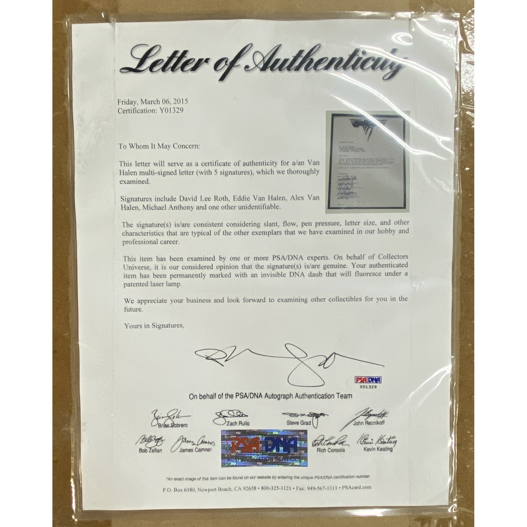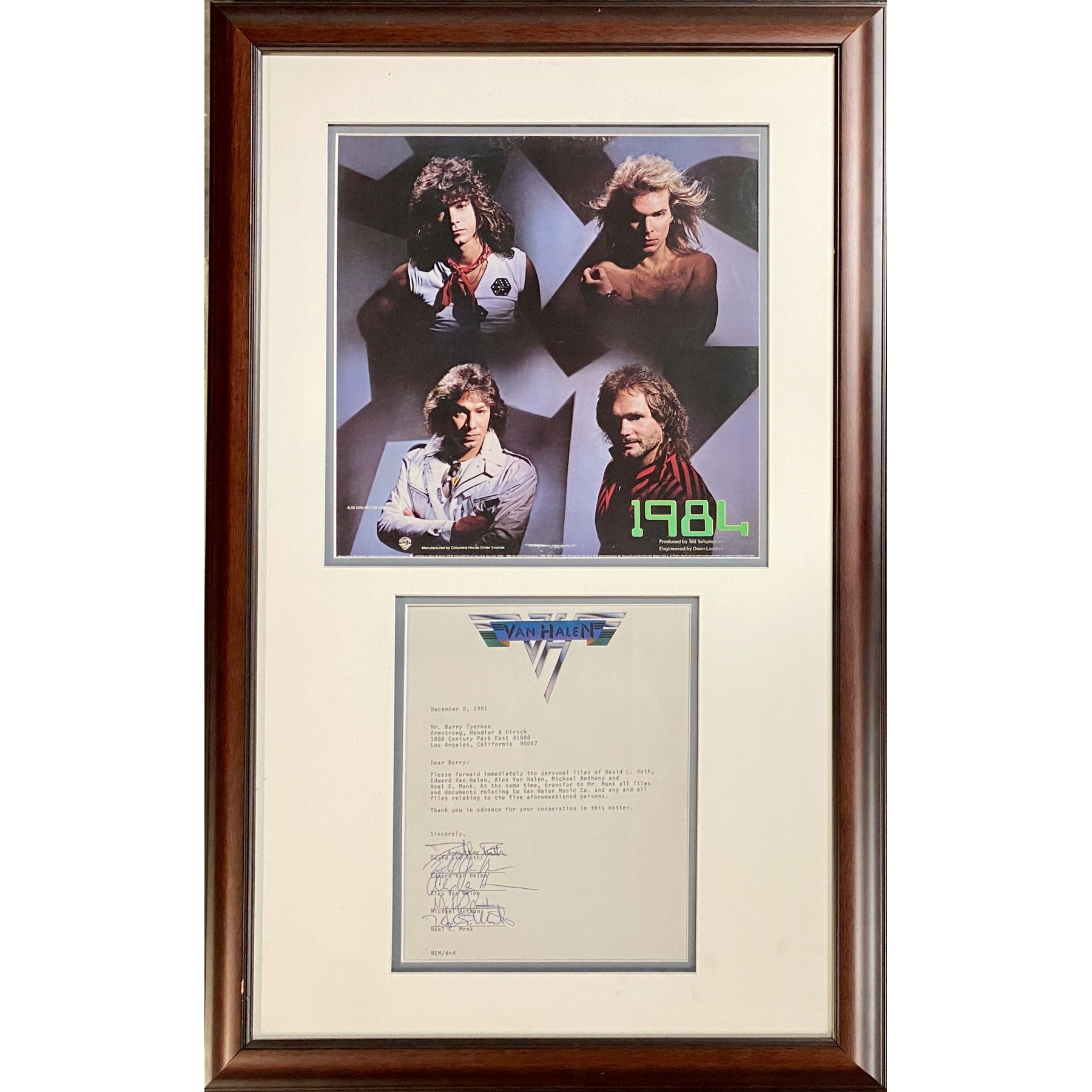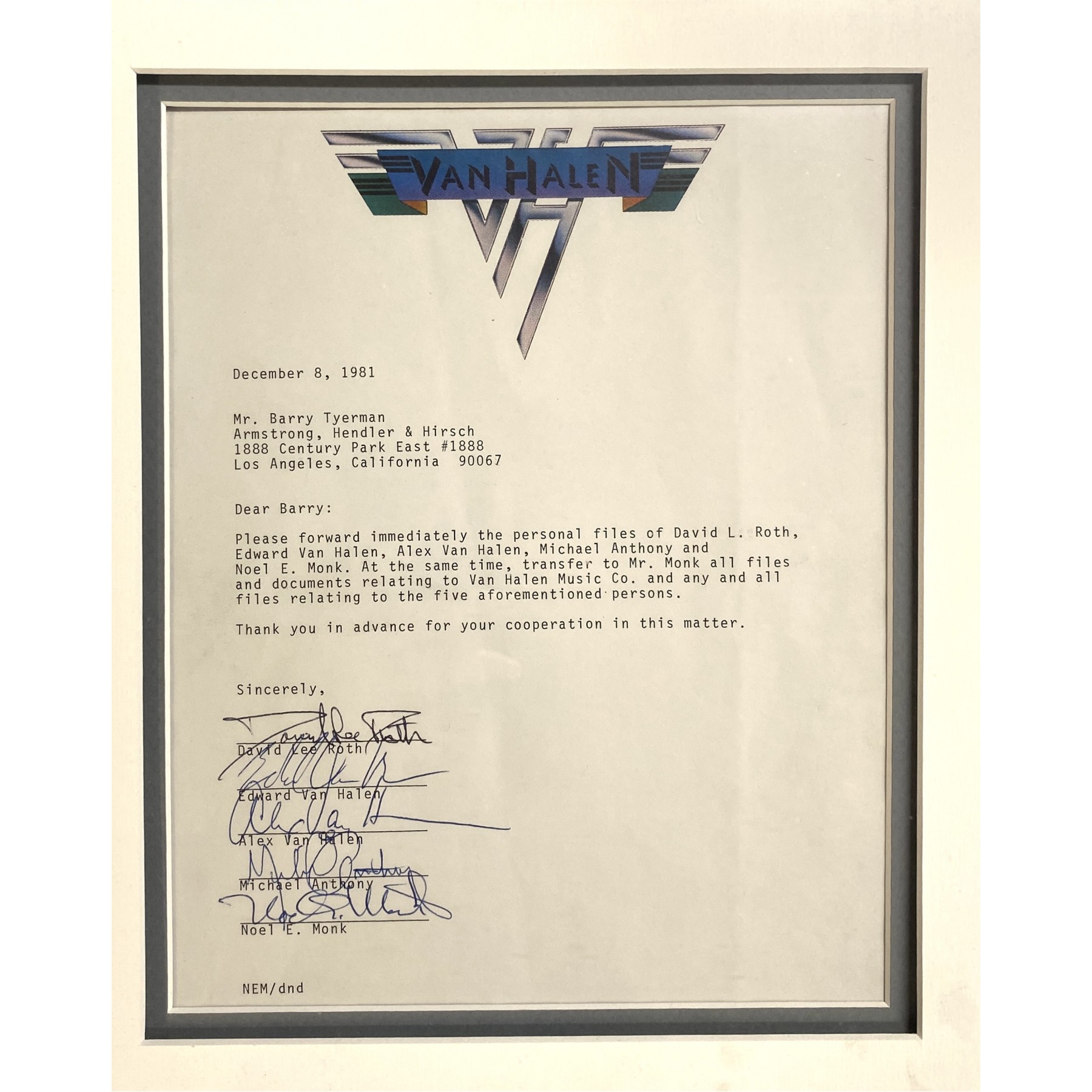 Presented is a framed display featuring an original 1981 Van Halen management contract on official band letterhead, boldly signed by all four classic members - David Lee Roth, Eddie Van Halen, Alex Van Halen, and Michael Anthony - along with manager Noel Monk. The contract measures 8" x 10" and is matted within a 31" x 19.5" frame. Comes complete with a PSA/DNA letter of authenticity. Van Halen defined an era with their high-energy performances, virtuosic guitar work, and chart-topping hits. A rare and impressive piece of rock history ready for display.