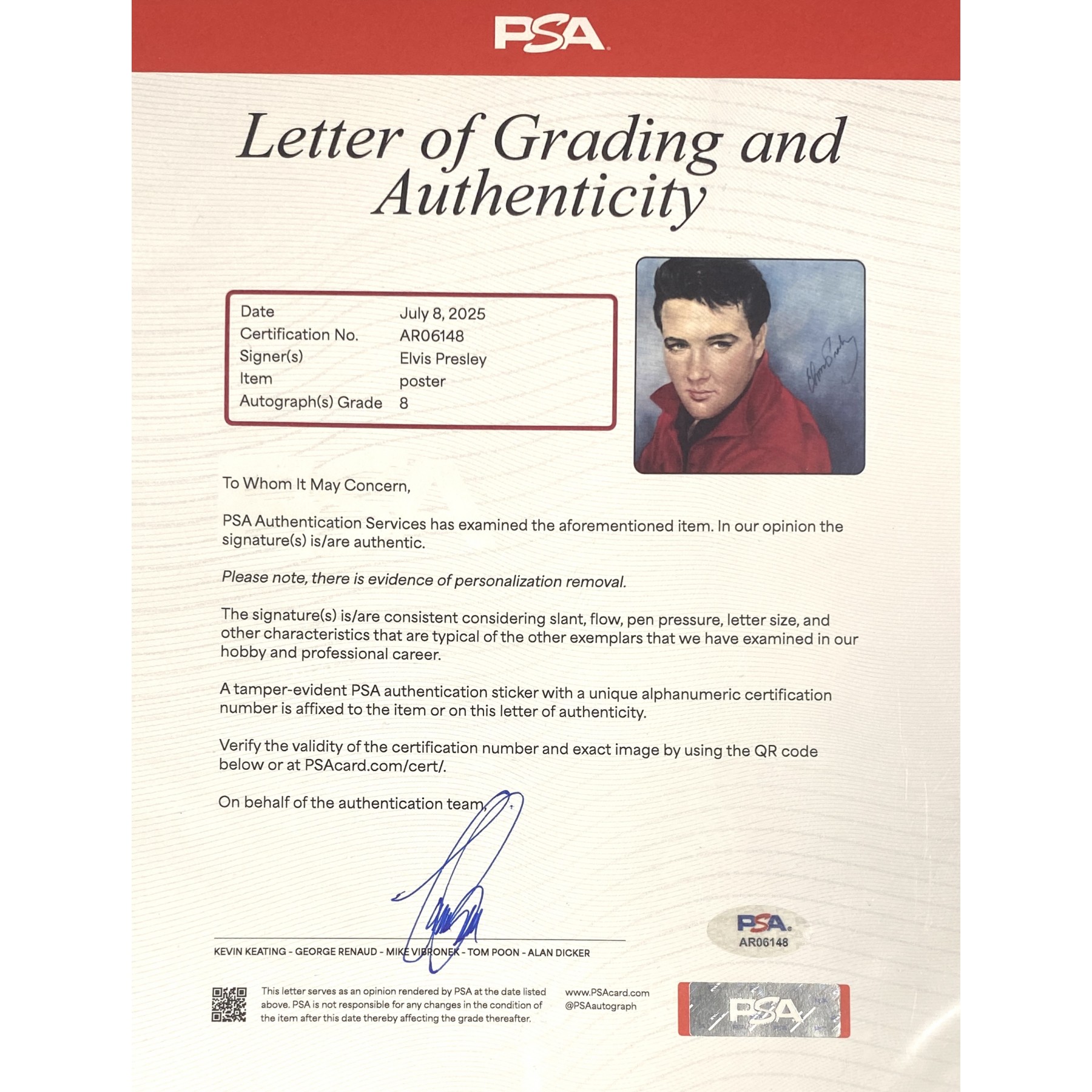 This original 16" x 20" promotional print of Elvis Presley by June Kelly, produced by RCA in 1964/1965 to promote the “Roustabout” soundtrack, is boldly signed by Elvis Presley in black felt tip. This piece features the now-iconic image of Elvis in a red shirt, and was later reused by record stores during the release of “Girl Happy” in early 1965. The autograph comes with a PSA Letter of Authenticity and a PSA Auto Grade of NM-MT 8. These original RCA promo posters are highly sought after, and examples signed by Elvis himself are quite rare.