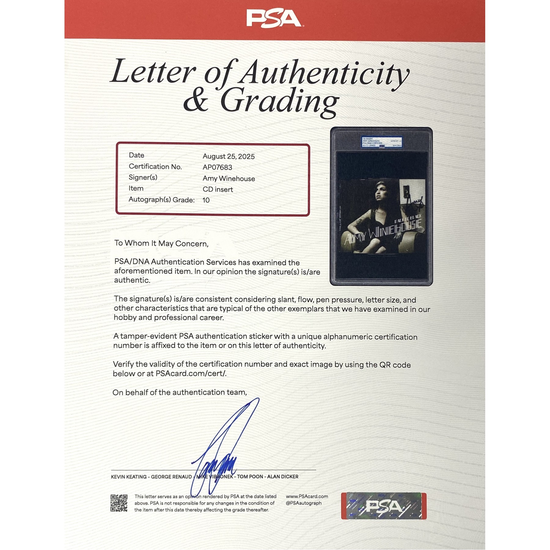 Item #0608 Amy Winehouse Signed “Back to Black” CD Single Cover - PSA Gem Mint 10