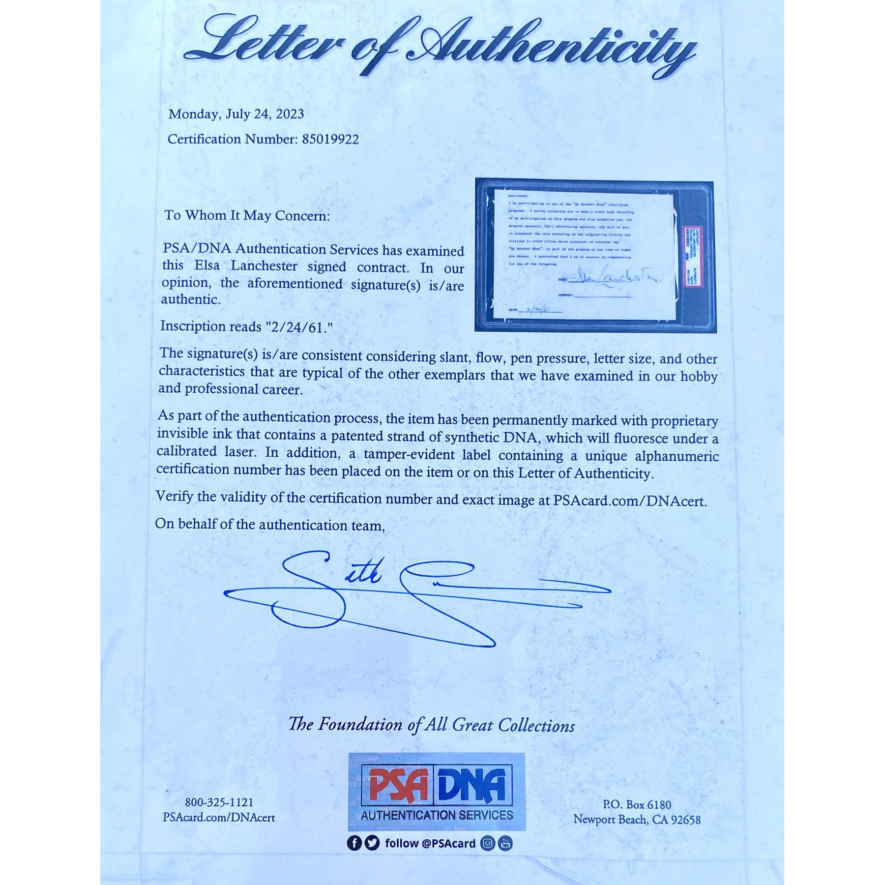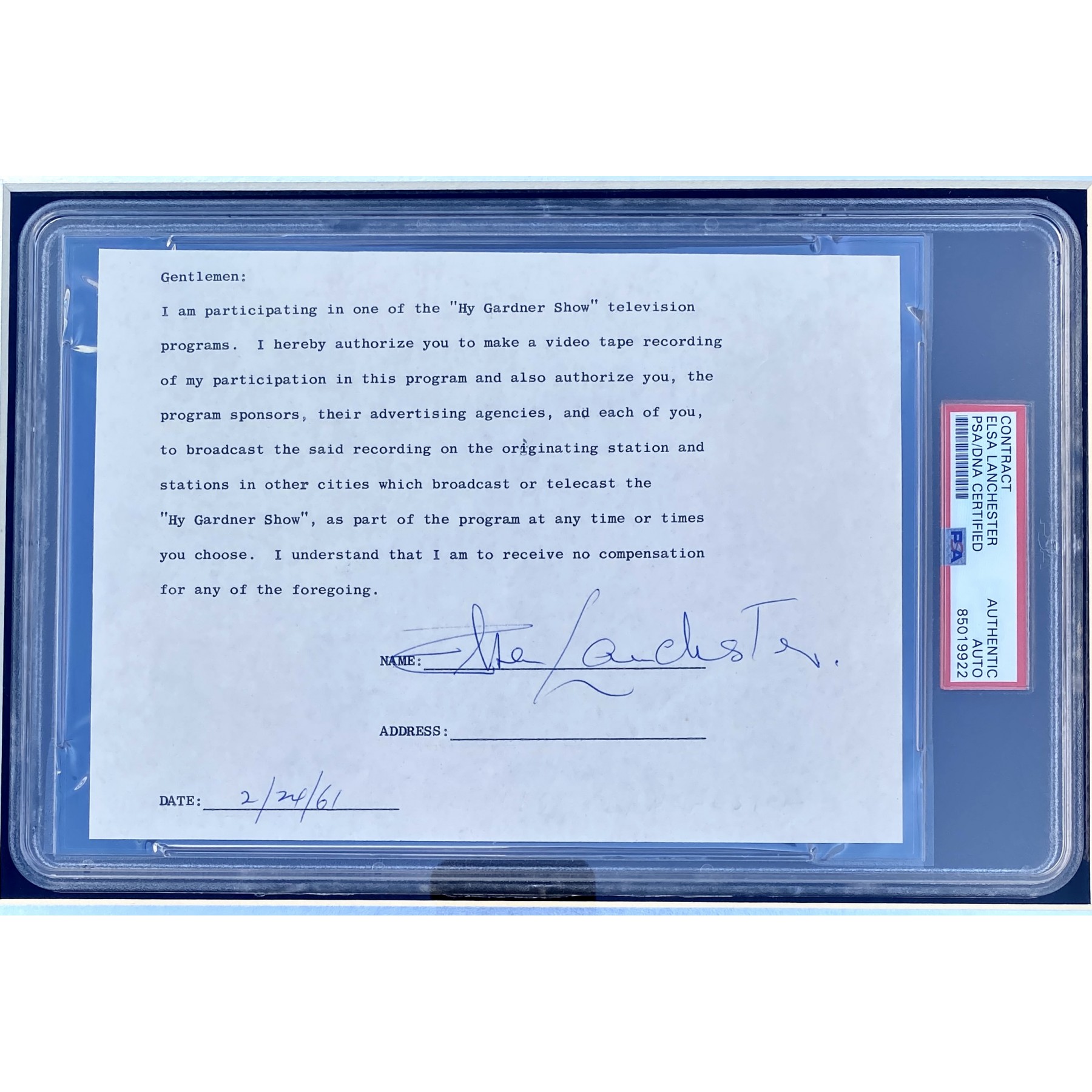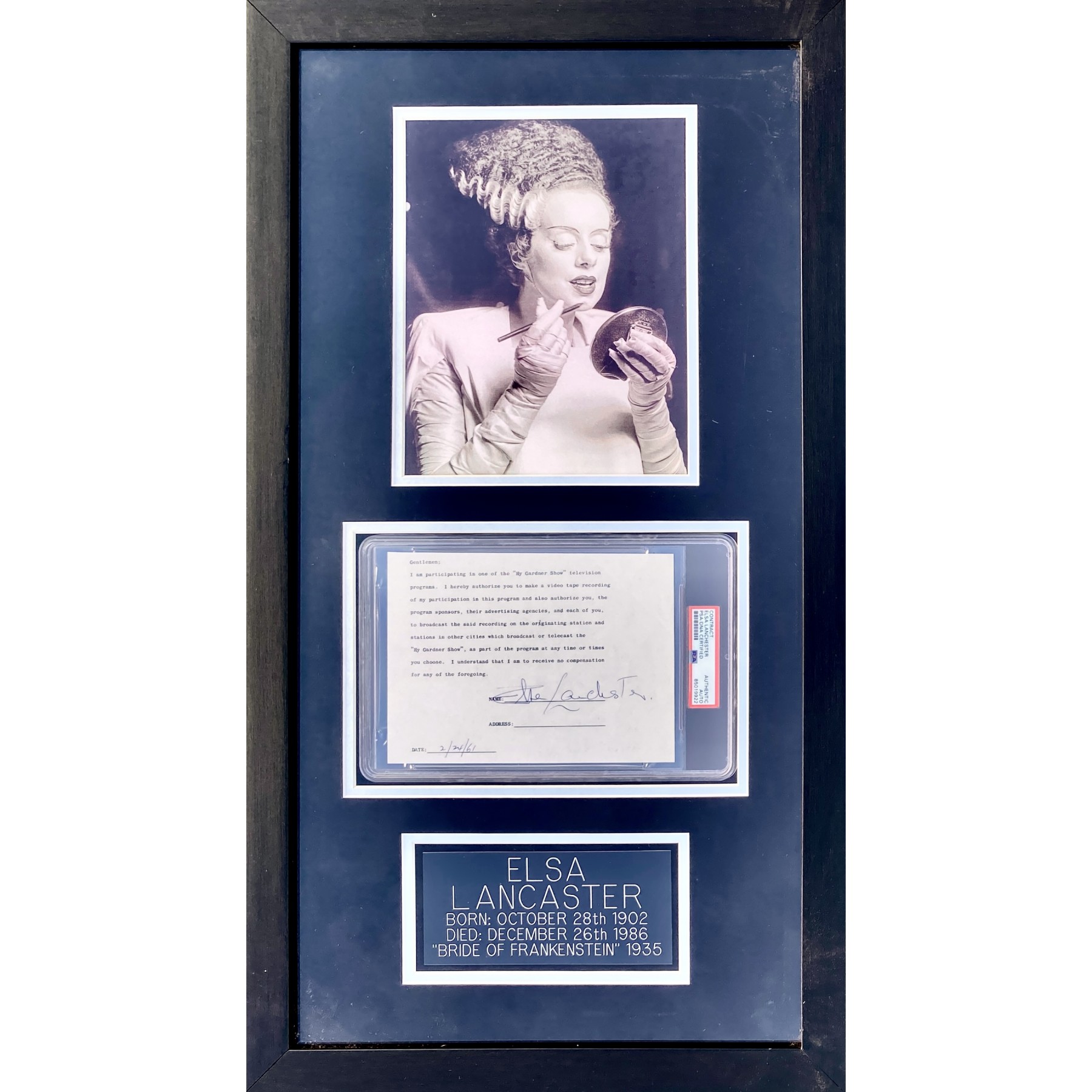 This framed display features a 1961 contract signed by Elsa Lanchester for her appearance on The Hy Gardner Show. Boldly signed in blue ink, the contract captures a moment from the celebrated career of Lanchester, best known for her unforgettable role as the Bride in The Bride of Frankenstein (1935). Includes a PSA/DNA letter of authenticity.
