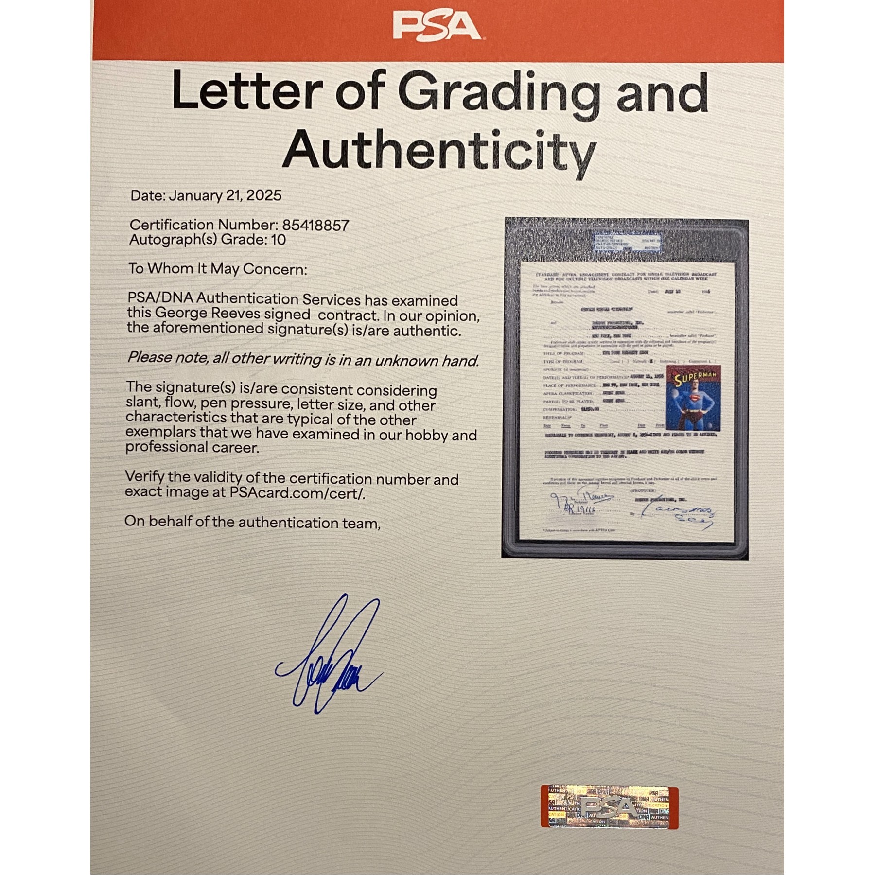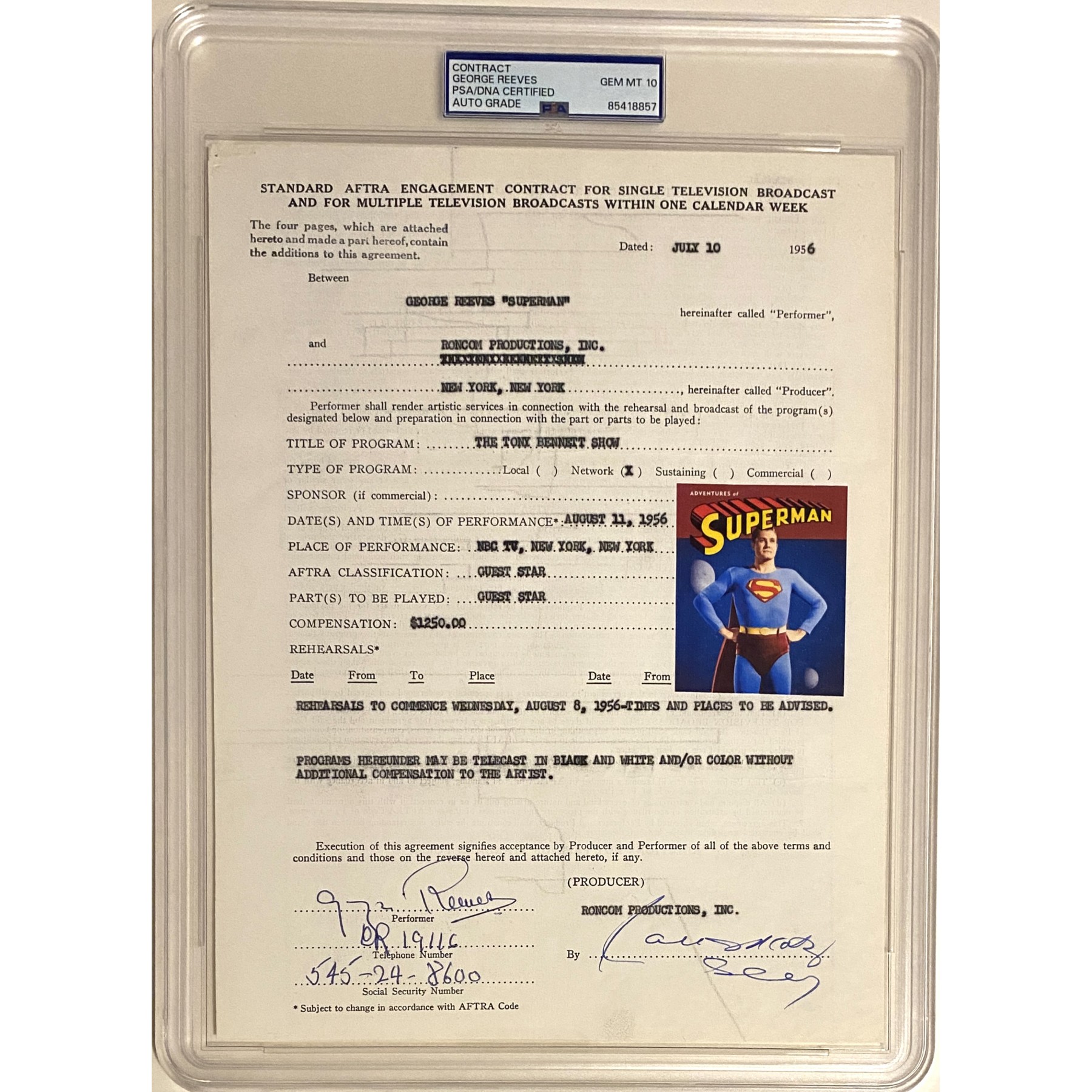 This original 1956 television contract is signed by George Reeves for his guest star appearance on The Tony Bennett Show. Boldly signed in blue ink, the autograph has been encapsulated by PSA and awarded a perfect GEM MINT 10 grade. This contract is uniquely titled 'George Reeves "Superman"'. Includes a full PSA Letter of Authenticity. A rare and pristine example tied to one of his television appearances during his portrayal as the Man of Steel: Superman.