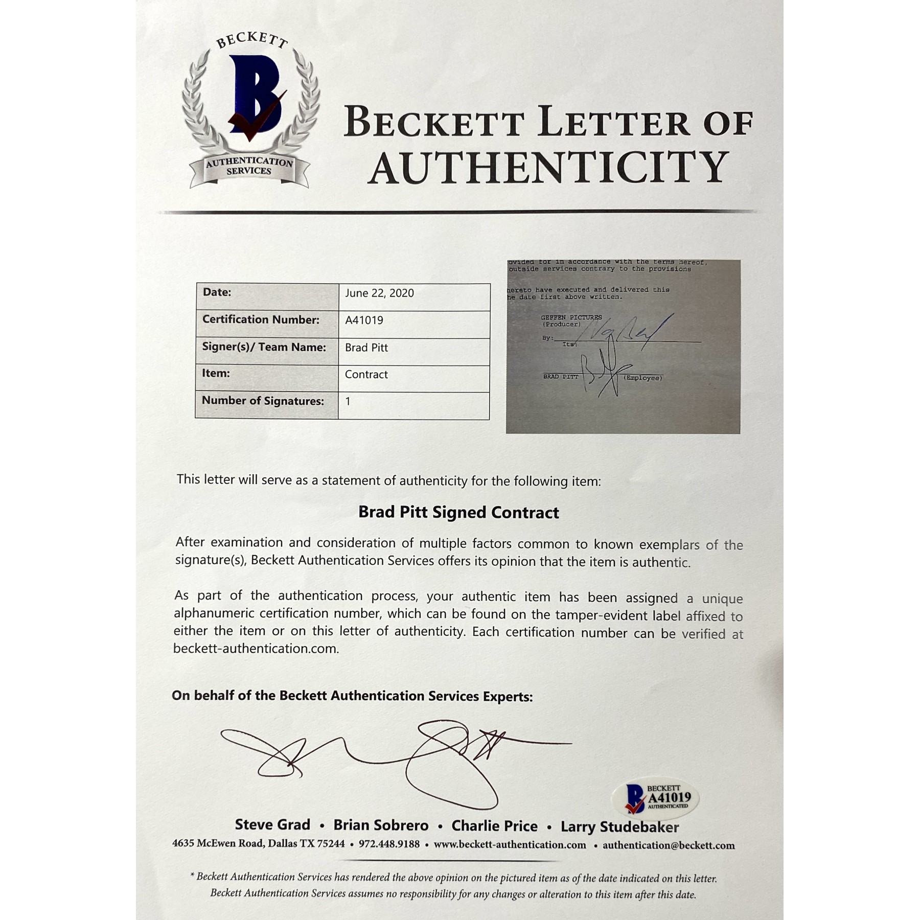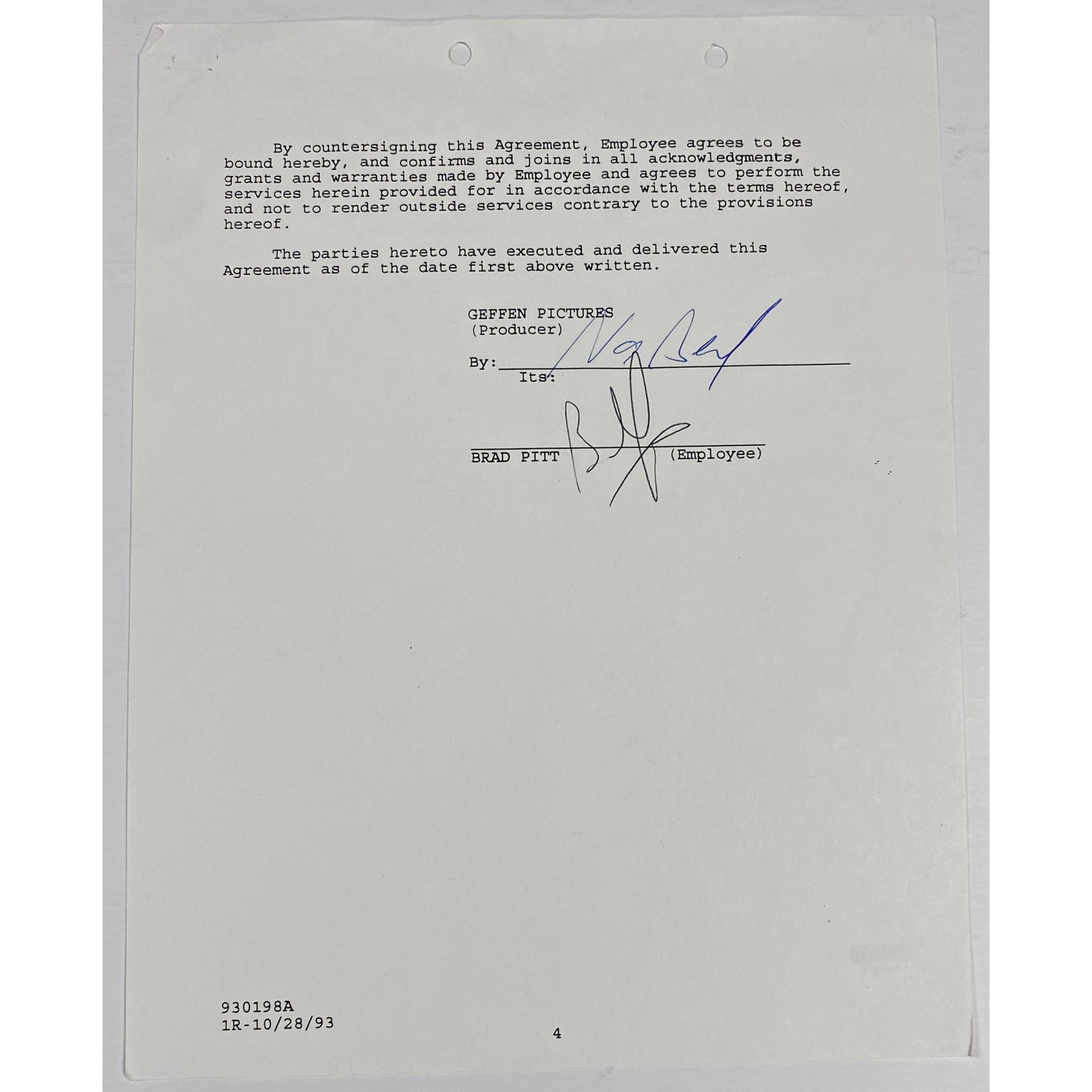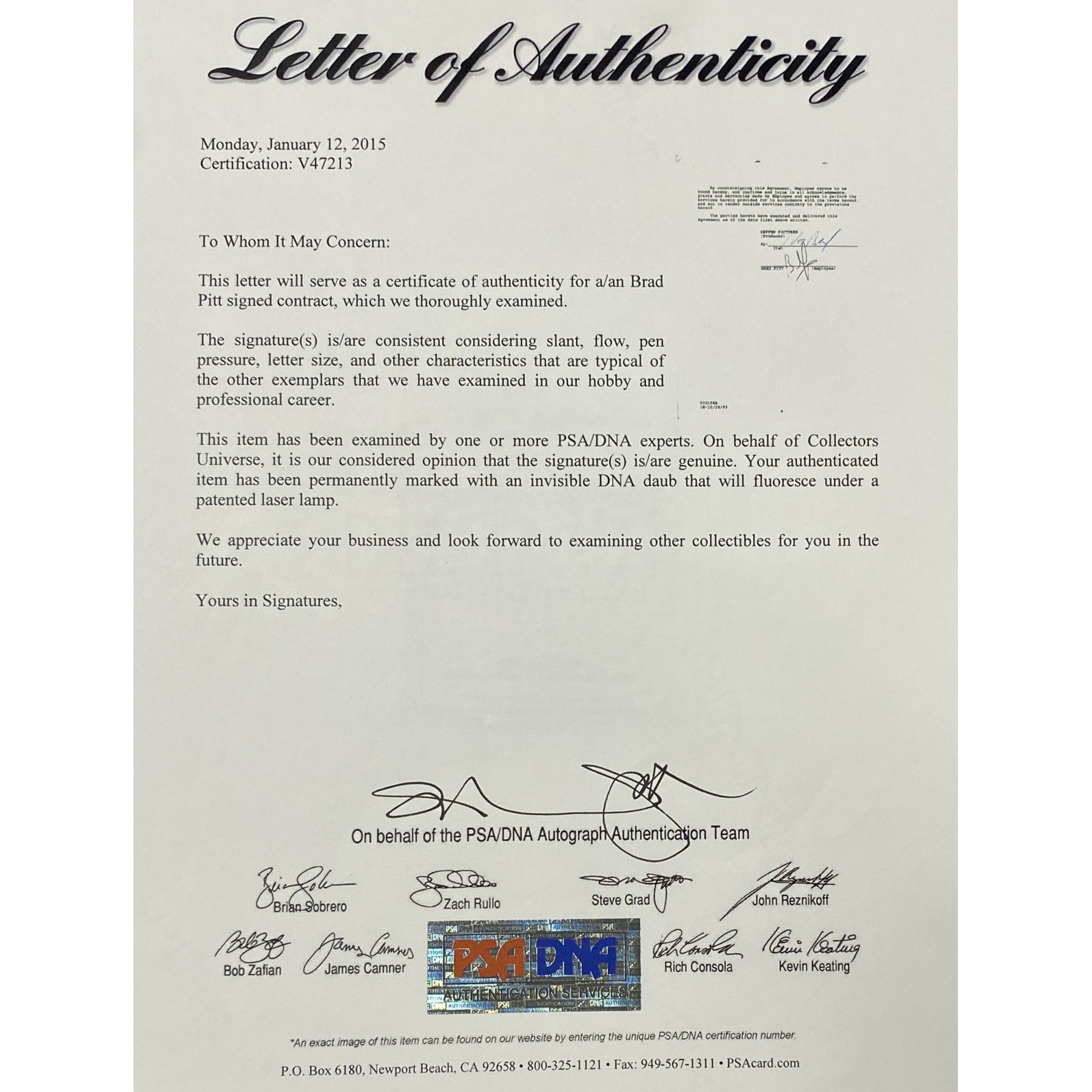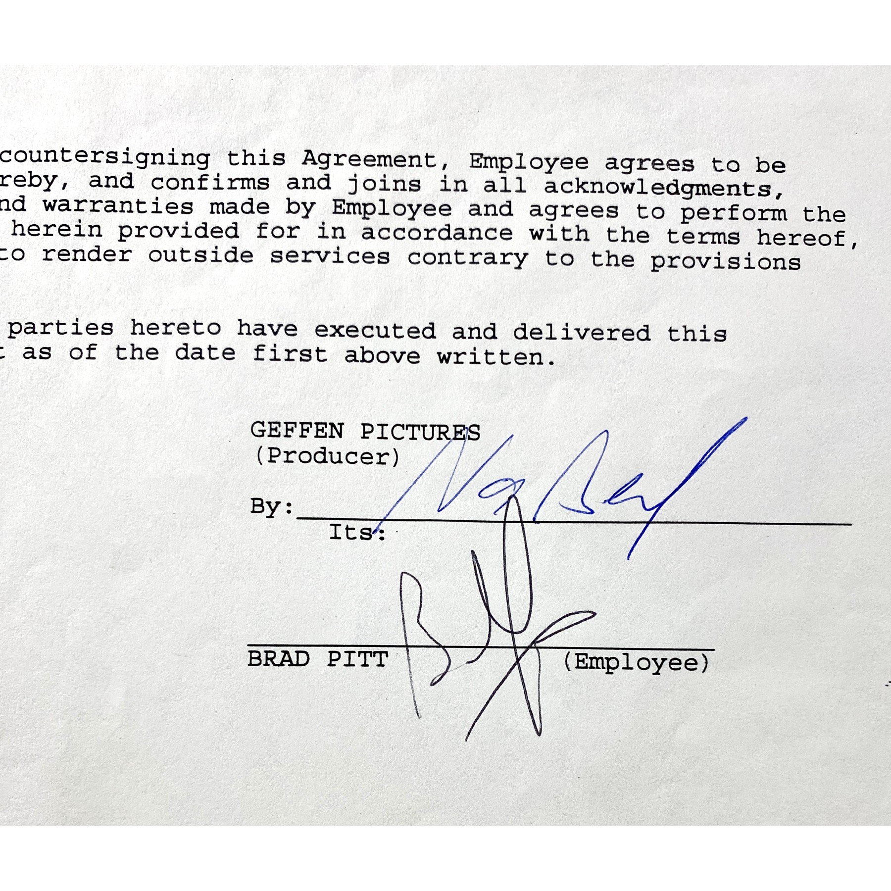 Item #0569 Brad Pitt Signed 1993 "Interview with the Vampire" Contract + Pitt & Kirsten Dunst Signed 8x10 – Beckett, PSA/DNA & JSA