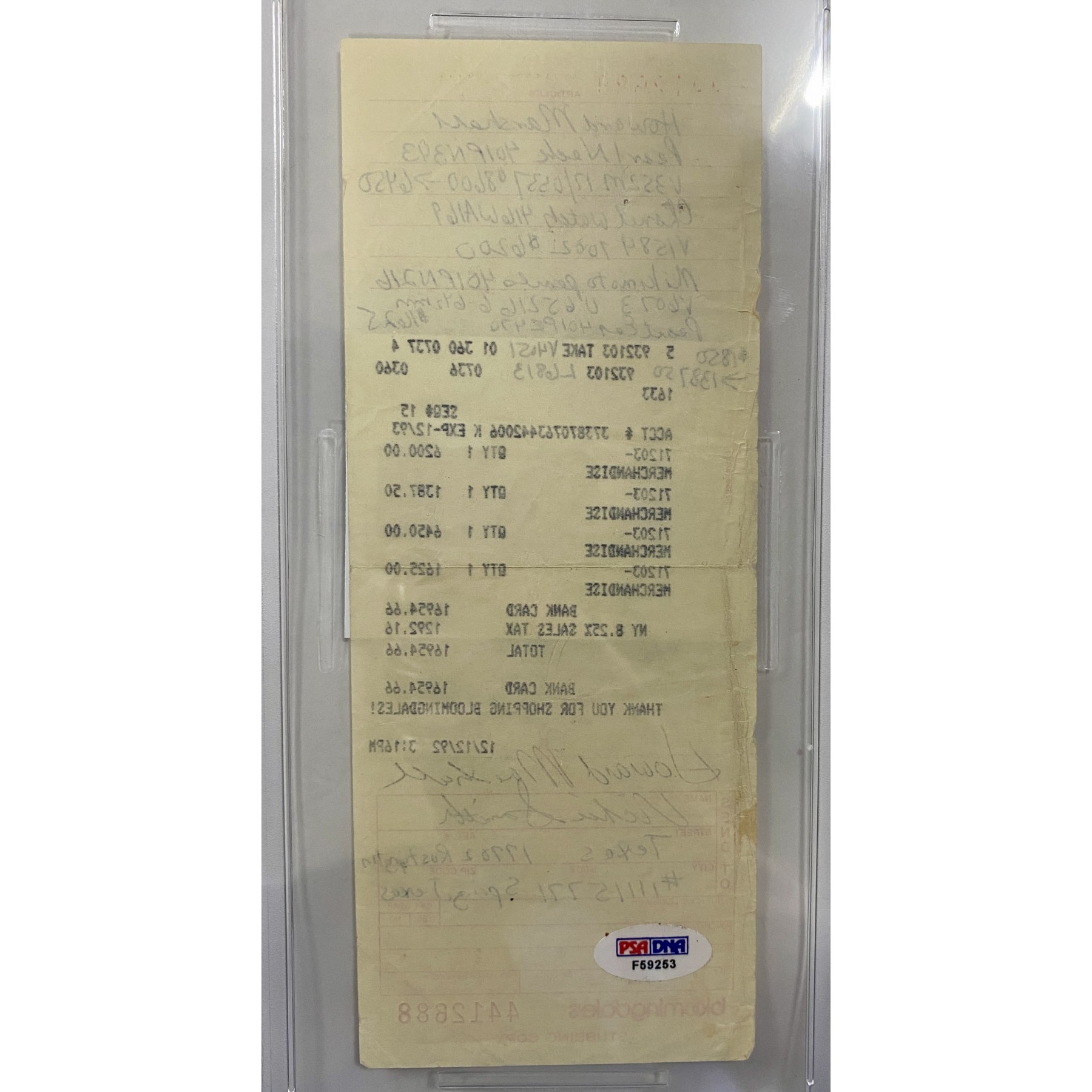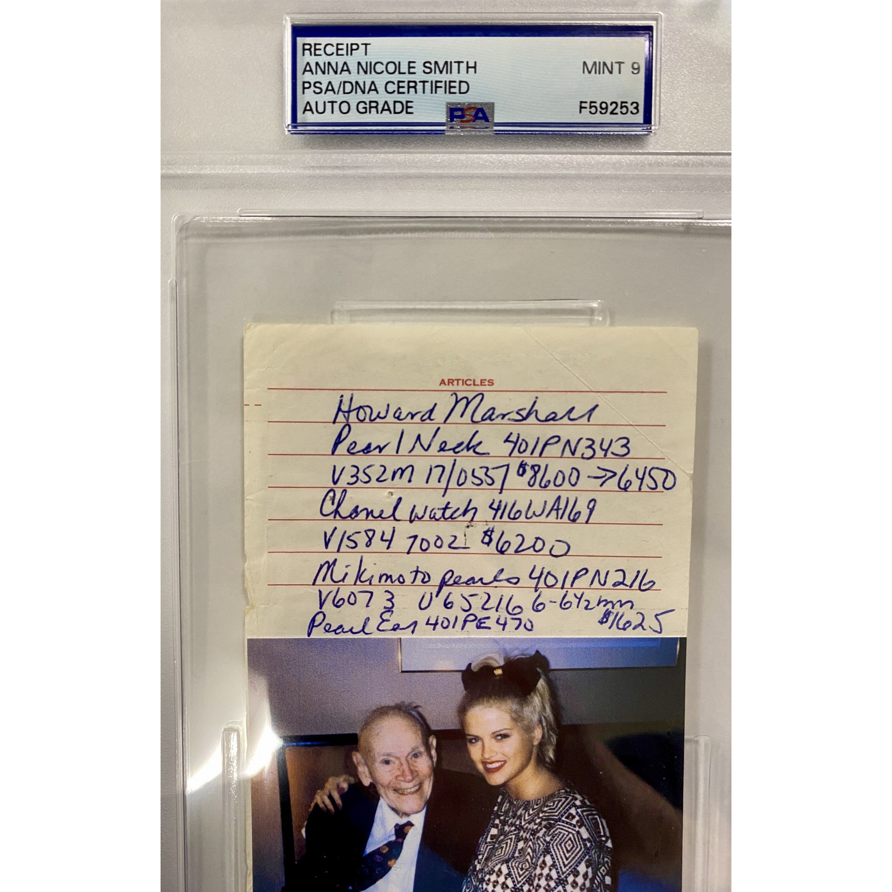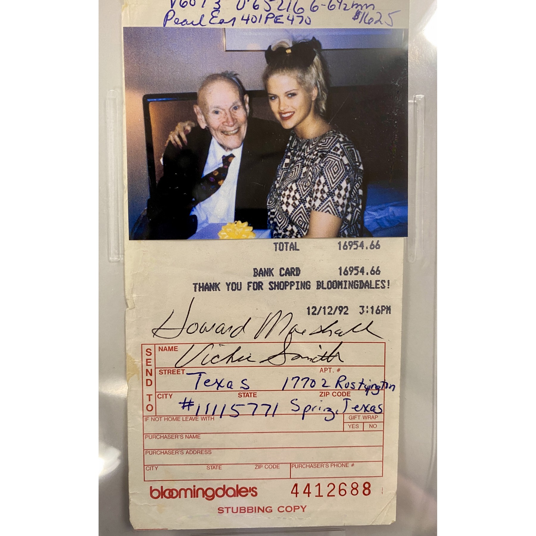 This incredible, one of kind piece of pop culture features an original Bloomingdales receipt from the account of famous billionaire Howard Marshall for his sugar baby starlet Anna Nicole "Vickie" Smith. This receipt dated 12/12/92 pertains to one of Anna Nicole's infamous daily shopping sprees, showing the purchase of an $8600 pearl necklace, a $6200 Chanel watch, among other items. This piece comes PSA encapsulated with a photo of the happy 90 year old groom with his 25 year old bride smiling. The receipt is signed boldly in black ink pen & graded Mint 9 by PSA/DNA.