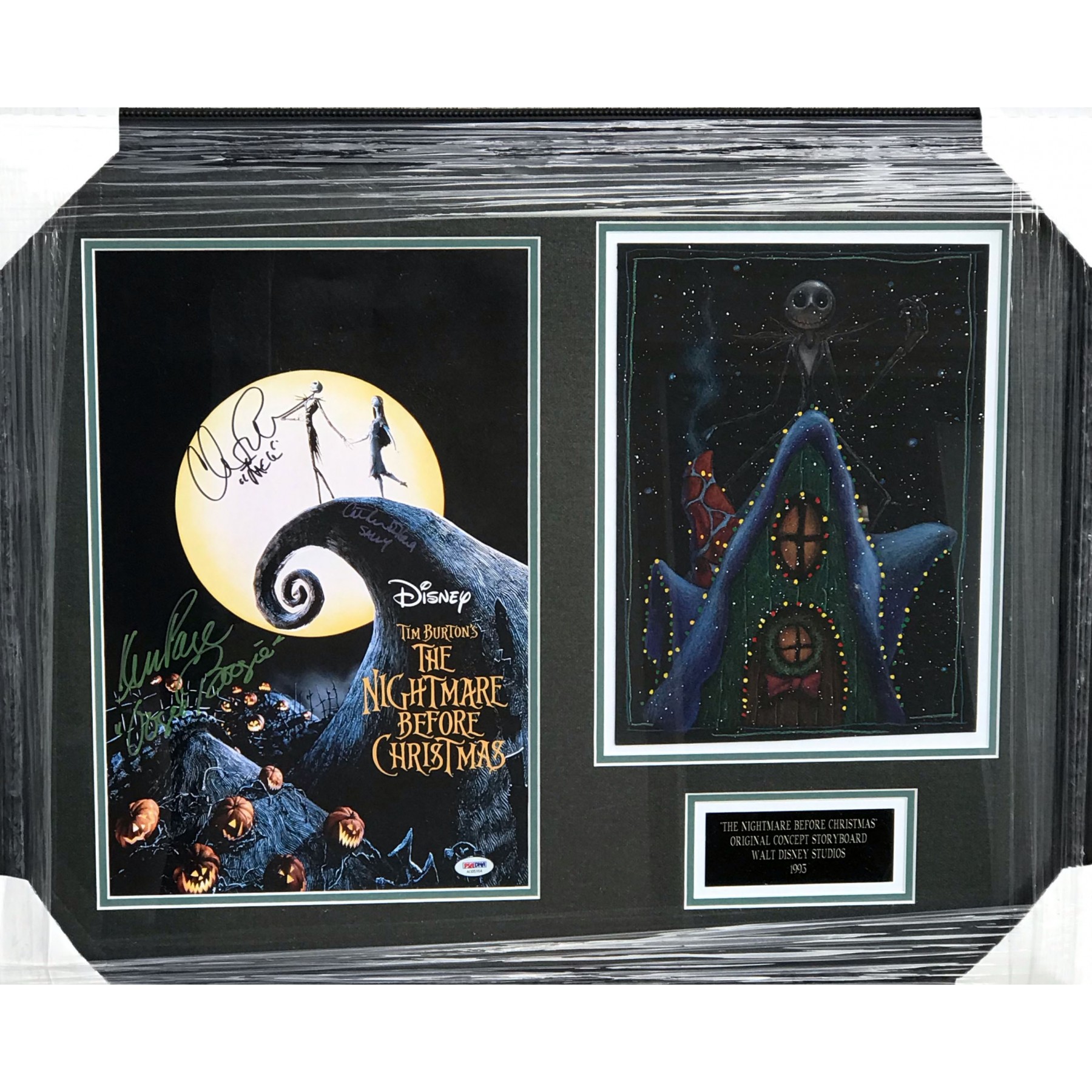 This amazing display features Disney's 1993 cult classic "The Nightmare Before Christmas," Jack Skellington concept storyboard original art accomplished in pastel and colored pencil on black 9.5"x13" artist storyboard and a multi-signed 11"x17" lithograph featuring the signatures of principal voice cast members Chris Sarandon (voice of Jack Skellington), Catherine O'Hara (voice of Sally), and and Ken Page (voice of Oogie Boogie). Comes with an auction house LOA for the storyboard original art and an extra LOA for the cast members signatures on the lithograph from the world's number one authenticators PSA/DNA.