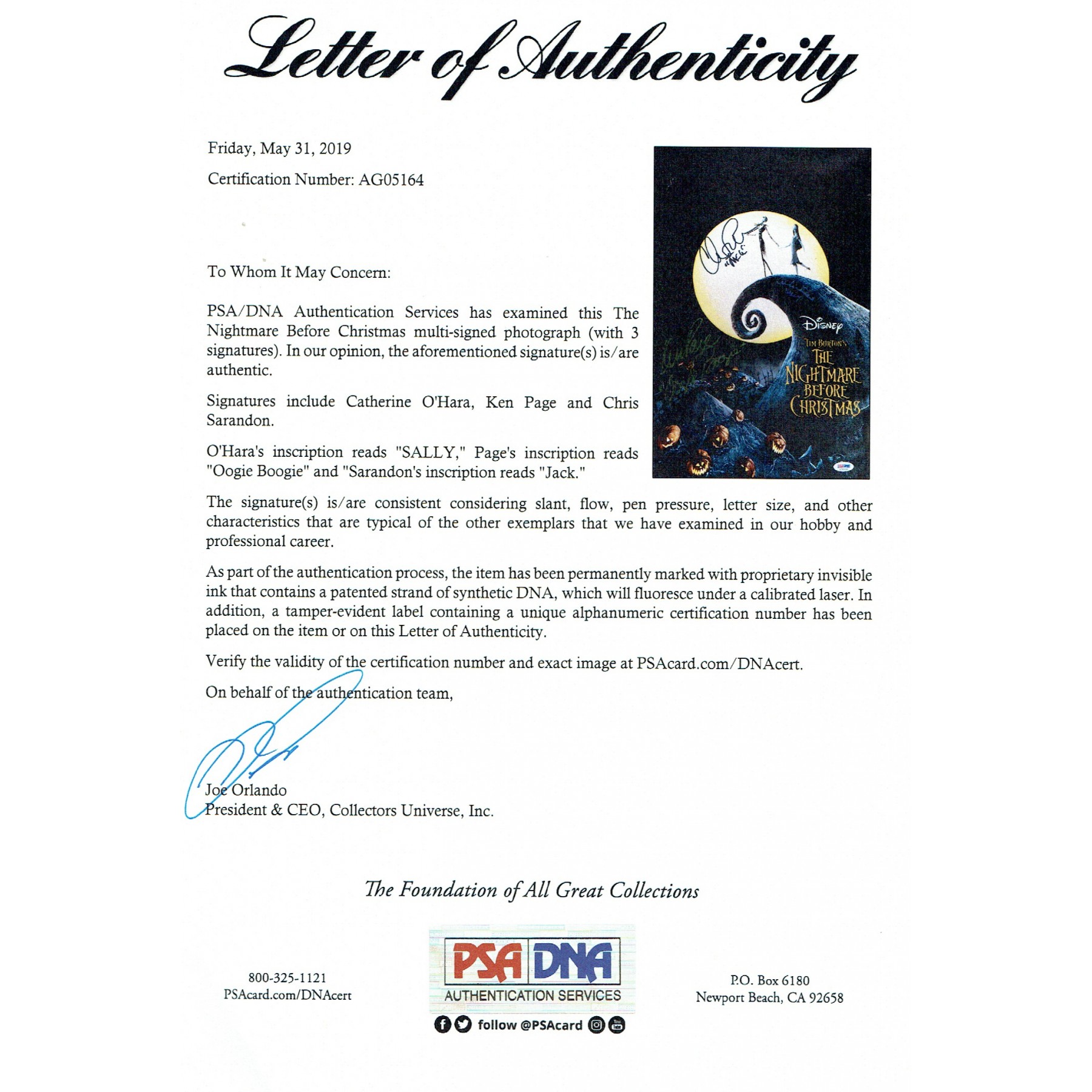 Size: Approx. 29" x 23" framedAuthentication: PSA/DNA Signed Letter of AuthenticitySignatures: Chris Sarandon (black sharpie), Catherine O'Hara (purple marker), Ken Page (green marker)