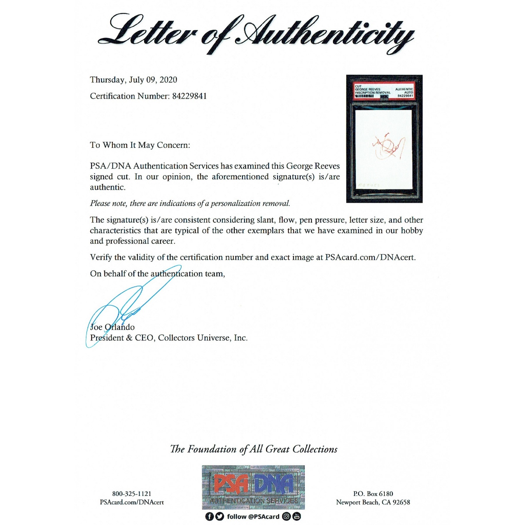 Framed George Reeves Remnant piece of his Superman Cape from the "Adventures of Superman" and signed card. The remnant piece comes with a letter of authenticity from a top Superman expert. The encapsulated signature comes with an LOA from the world's number one authenticator's PSA/DNA.