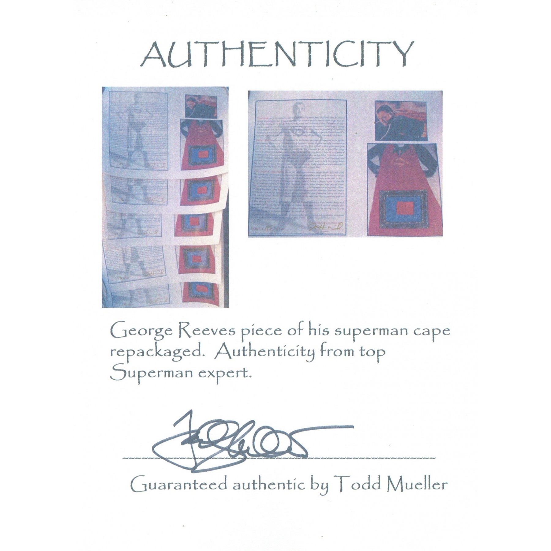 Item #0243 - George Reeves - "Adventures of Superman" - Framed Remnant Piece of his Superman Cape and Signed Card - SOLD