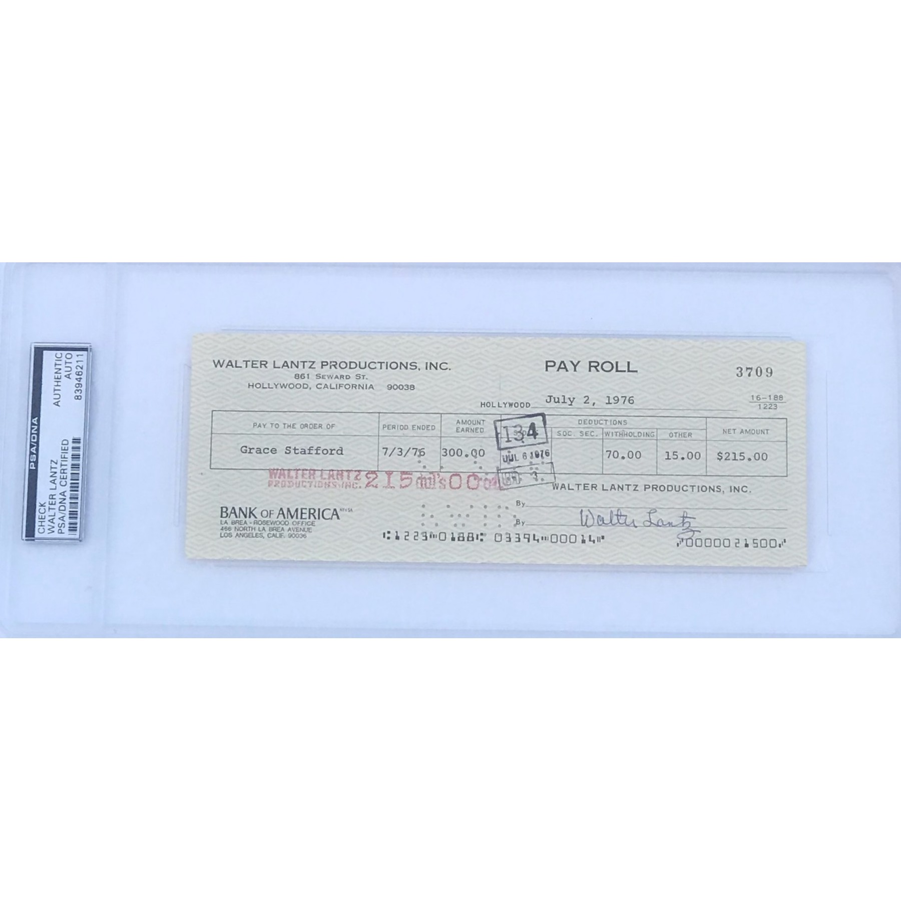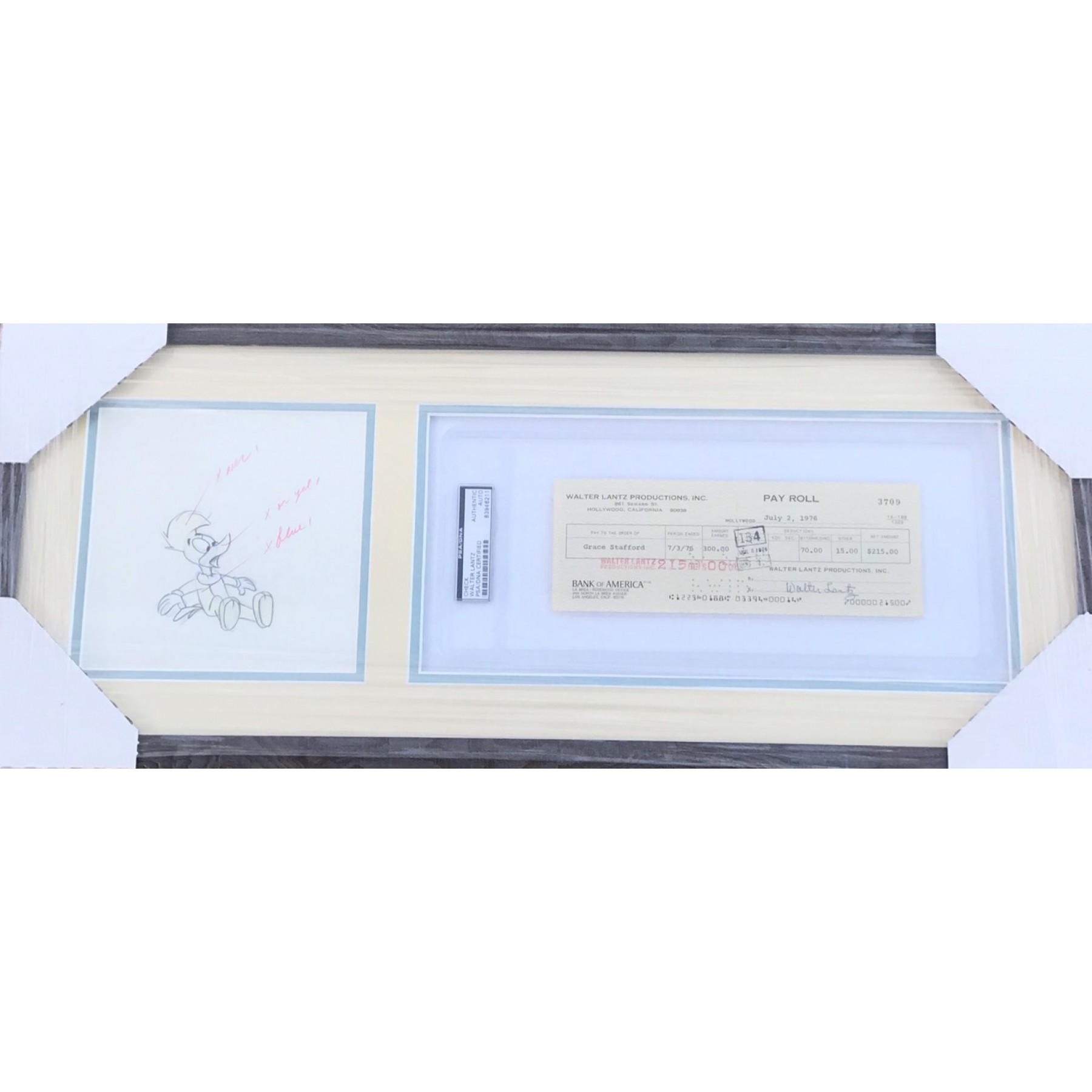This display piece features an original ”Woody Woodpecker" sketch & Walter Lantz Productions company payroll check. The "Walter Lantz Productions, Inc." check is paid to the order of "Grace Stafford" dated July 2, 1976, and signed by Walter Lantz. The check is PSA/DNA encapsulated & certified, & comes with a remarkable Results Auction Certificate.