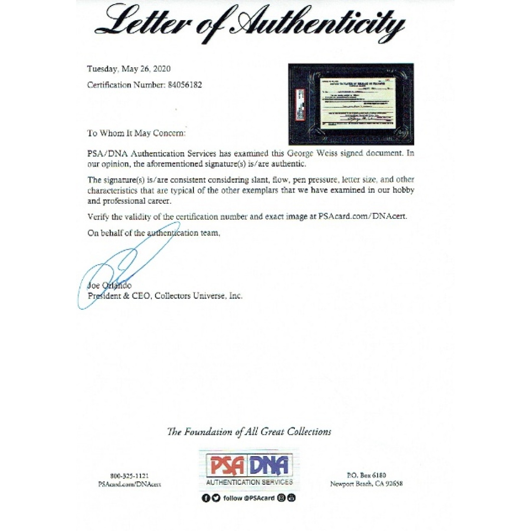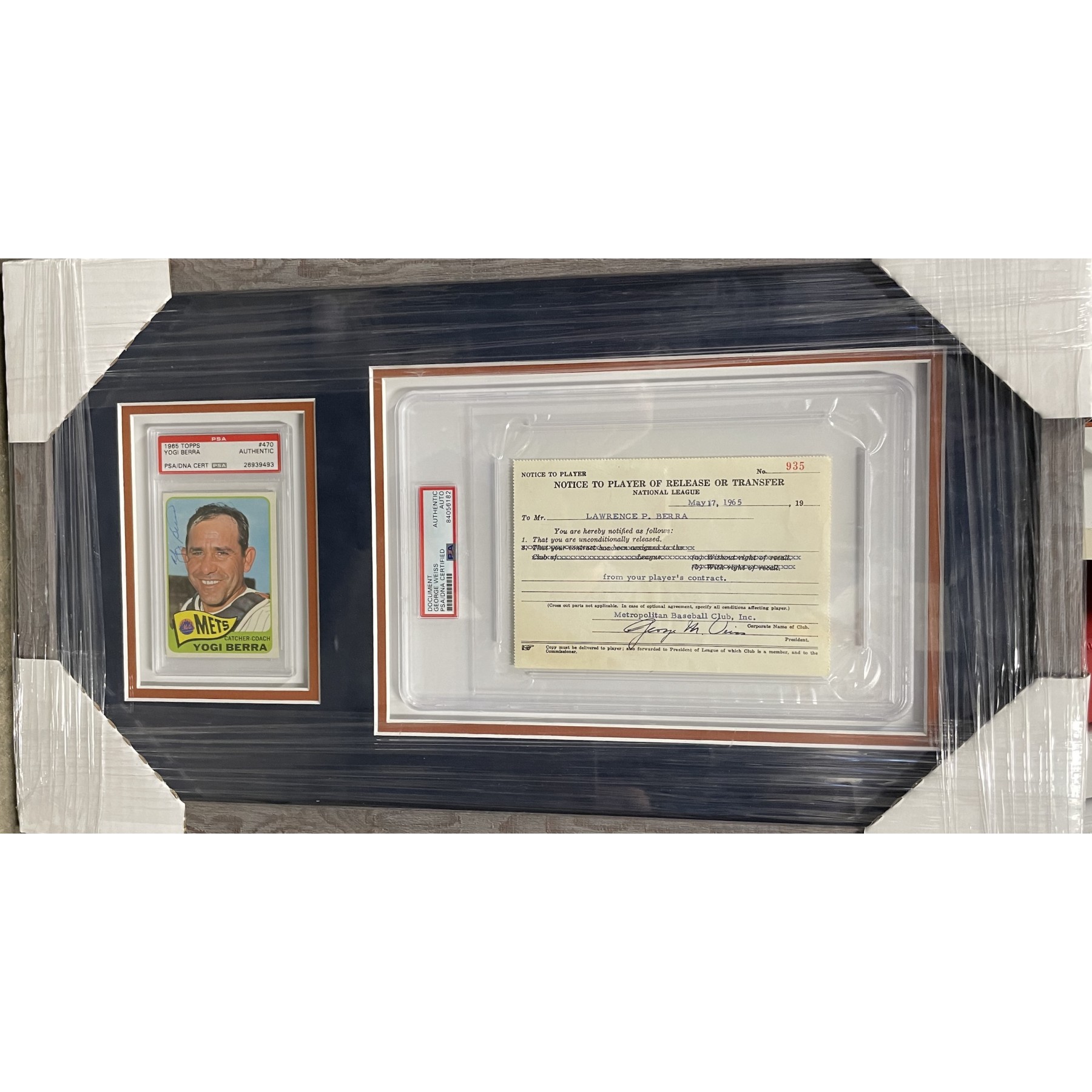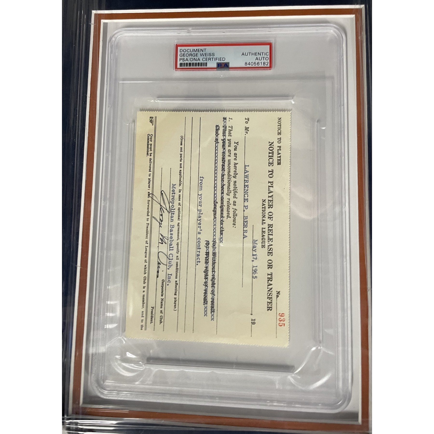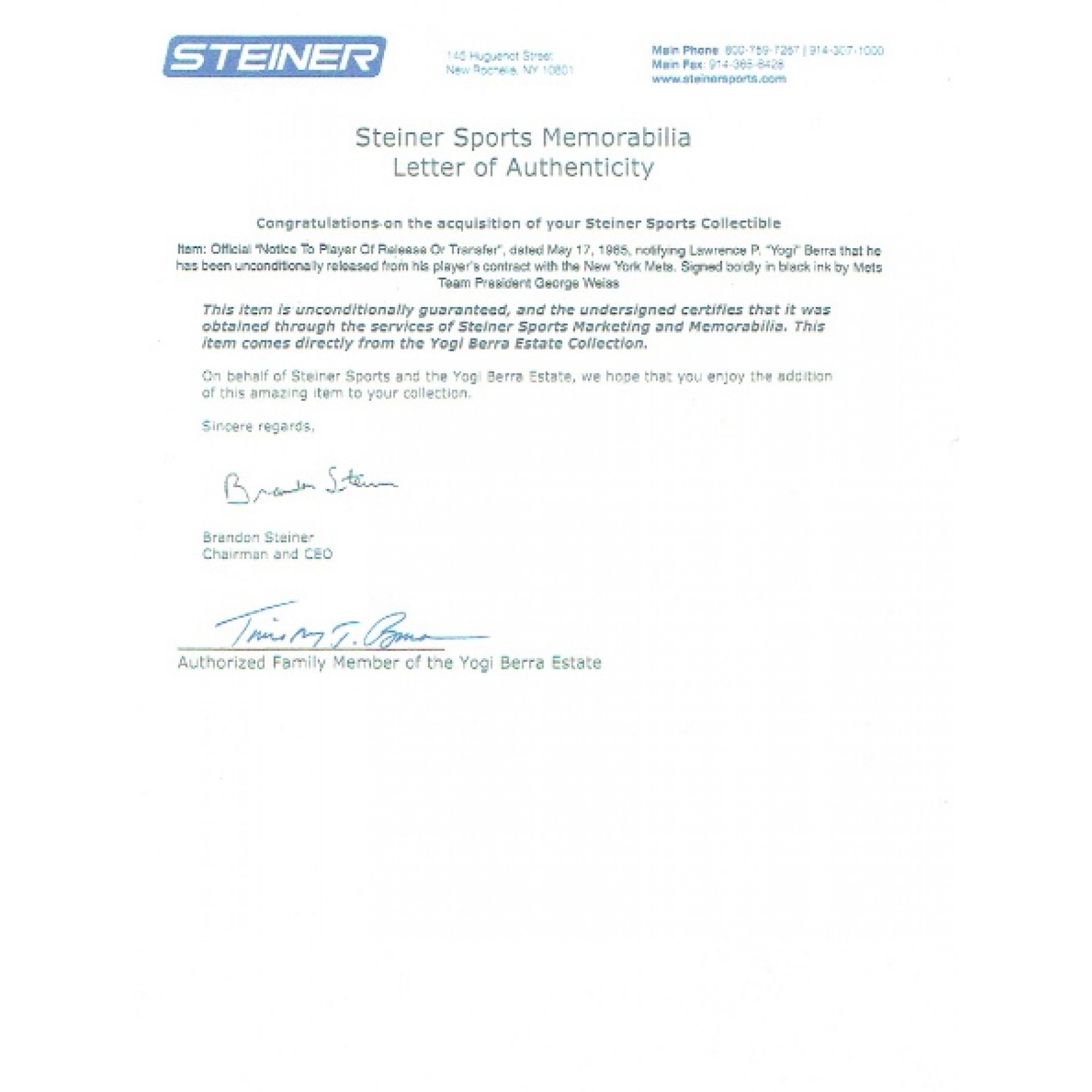 This one-of-a-kind piece of baseball history issued by the New York Metropolitan Baseball Club, Inc (METS) features a "Notice to Player of Release or Transfer" dated May 17, 1965, unconditionally releasing Berra as a player of the New York Mets. Signed in black ink by Mets Team President George Weiss & includes a 1965 Topps card signed by Yogi Berra in blue ink. Comes complete with Steiner Sports Memorabilia LOA & PSA/DNA Signed Letter of Authenticity.