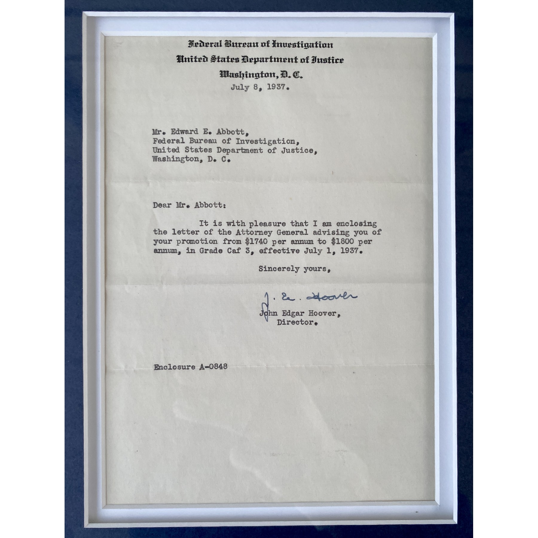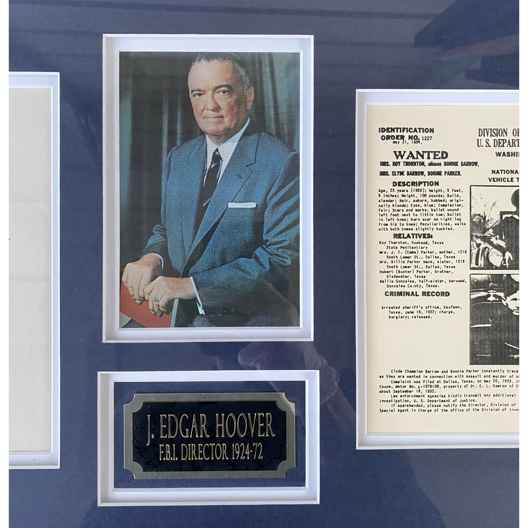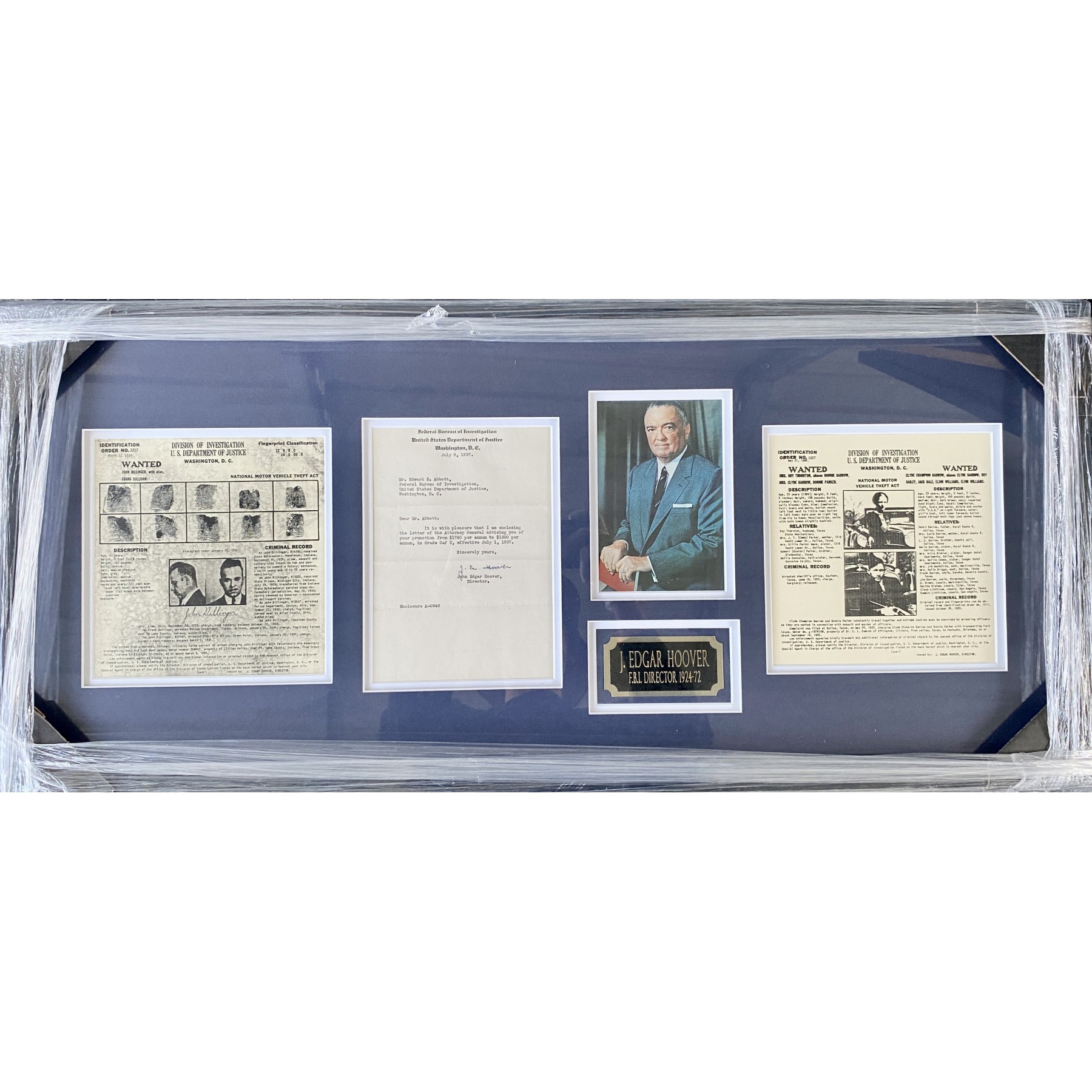 This original July, 1937 letter is signed by J. Edgar Hoover (Signed “J. E. Hoover”) in bold black ink on official F.B.I. letterhead. This unique document is PSA/DNA certified & comes framed in a 16” x 36” display. The display includes a photo of Hoover alongside reproduction Wanted notices for infamous criminals John Dillinger and Bonnie & Clyde.
