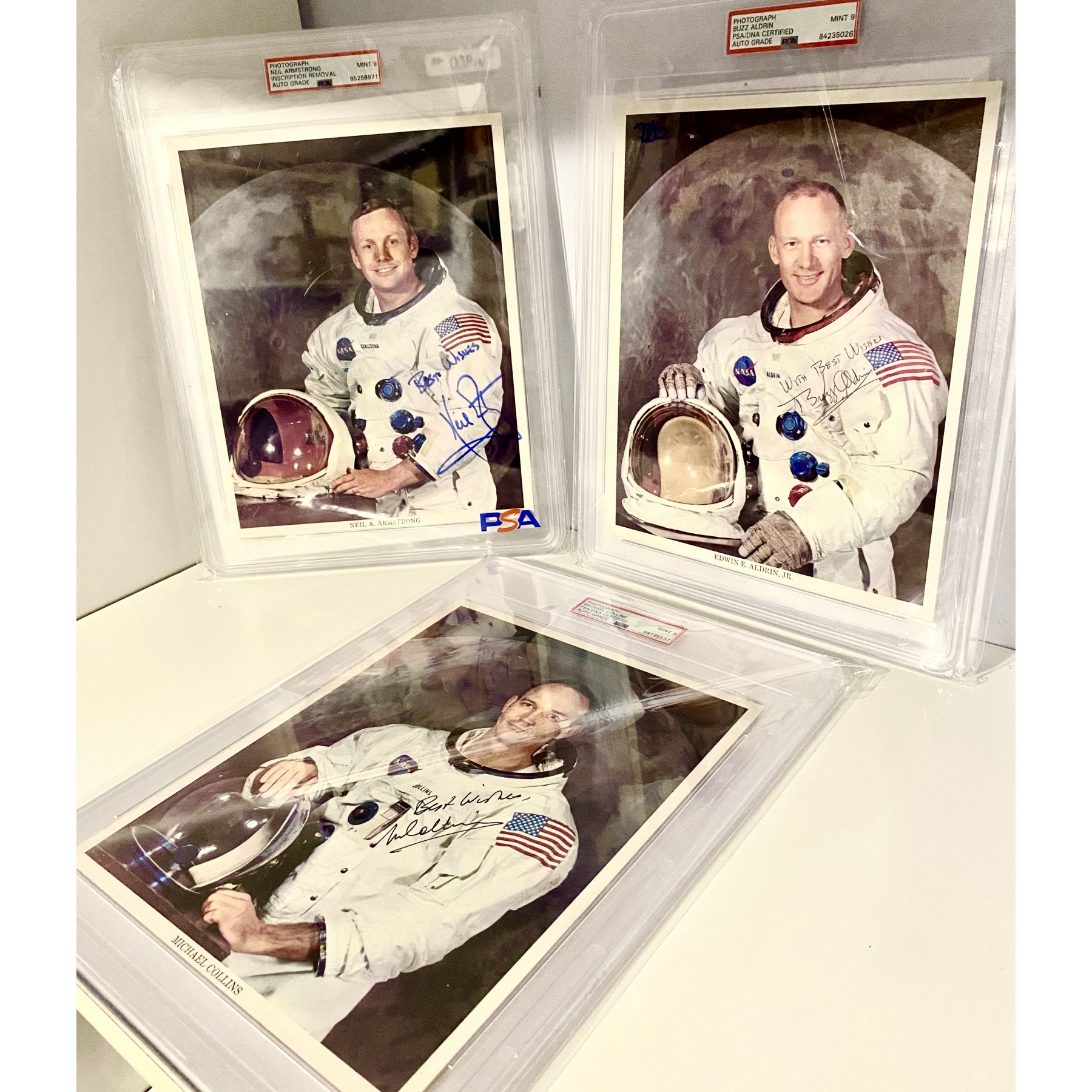This set of 3 signed NASA 8" x 10" photographs is out of this world! Featuring bold, Mint Grade 9 uninscribed signatures of the Apollo 11 crew members Neil Armstrong, Buzz Aldrin, & Michael Collins. These photos are rarely found uninscribed! Each photo comes encapsulated & with a PSA/DNA Letter of Authenticity.