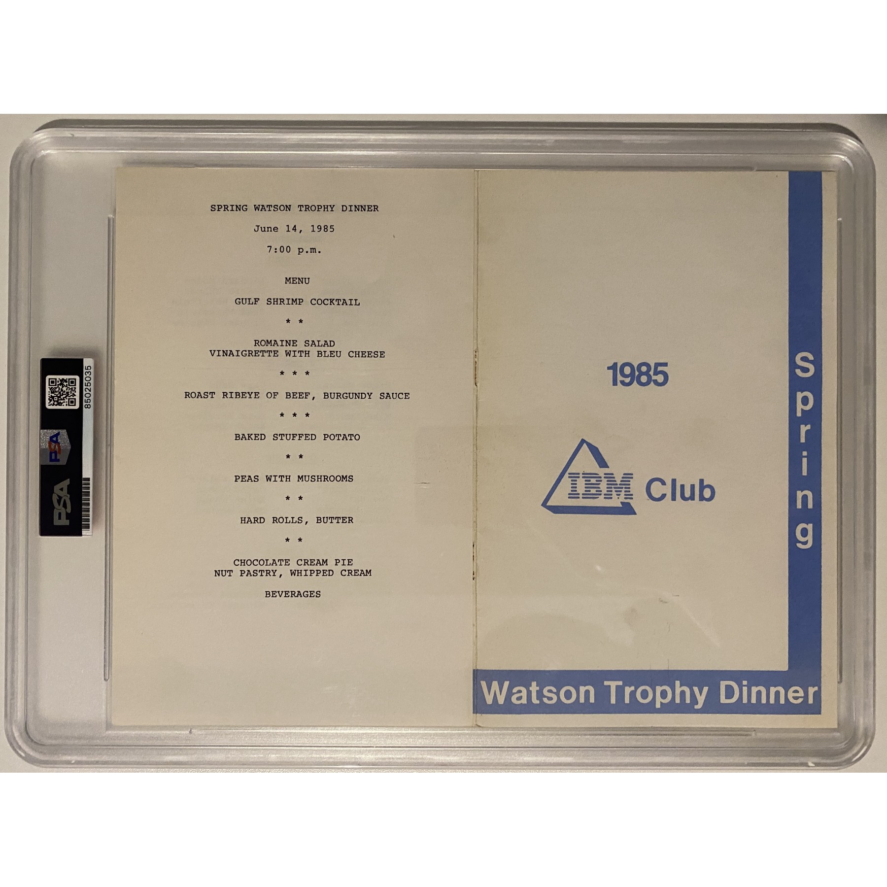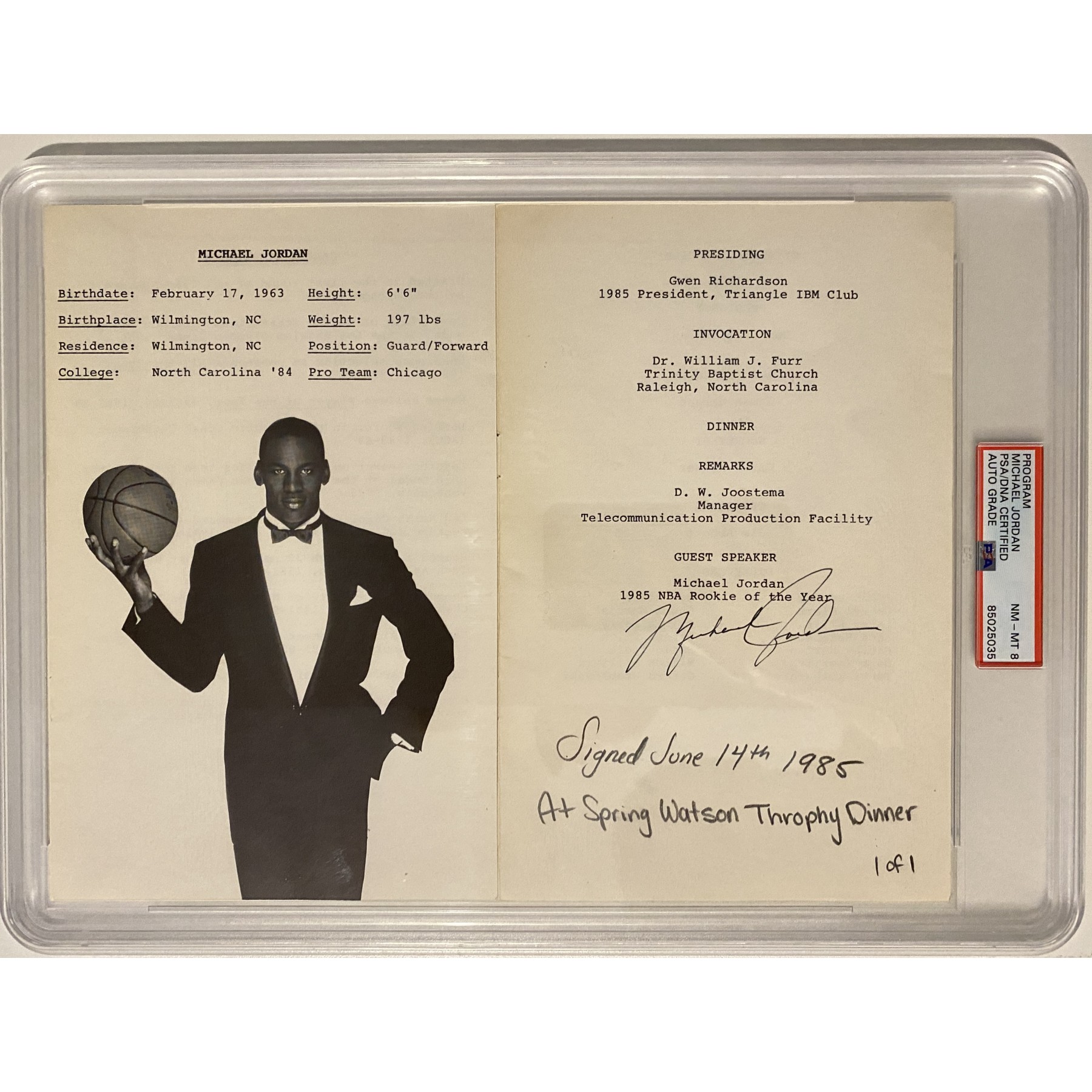 A slam dunk for collectors! This 1985 IBM Club Watson Trophy Dinner brochure is hand-signed by Michael Jordan, who was the guest speaker that year as the NBA Rookie of the Year. Encapsulated with an autograph grade of 8 and accompanied by a PSA/DNA Letter of Authenticity, this piece captures an early moment in MJ's legendary career, and is numbered 1 of 1!
