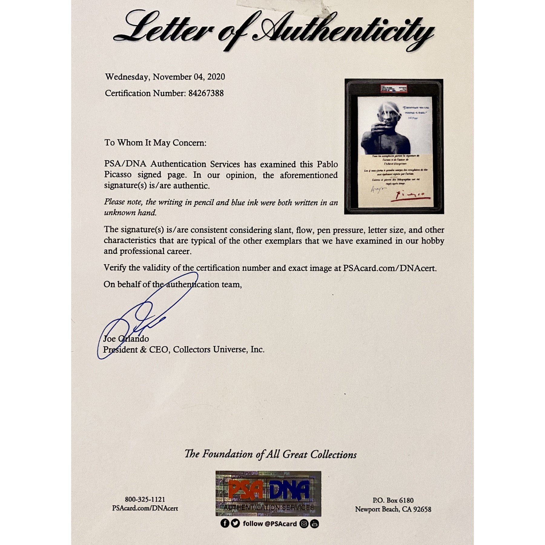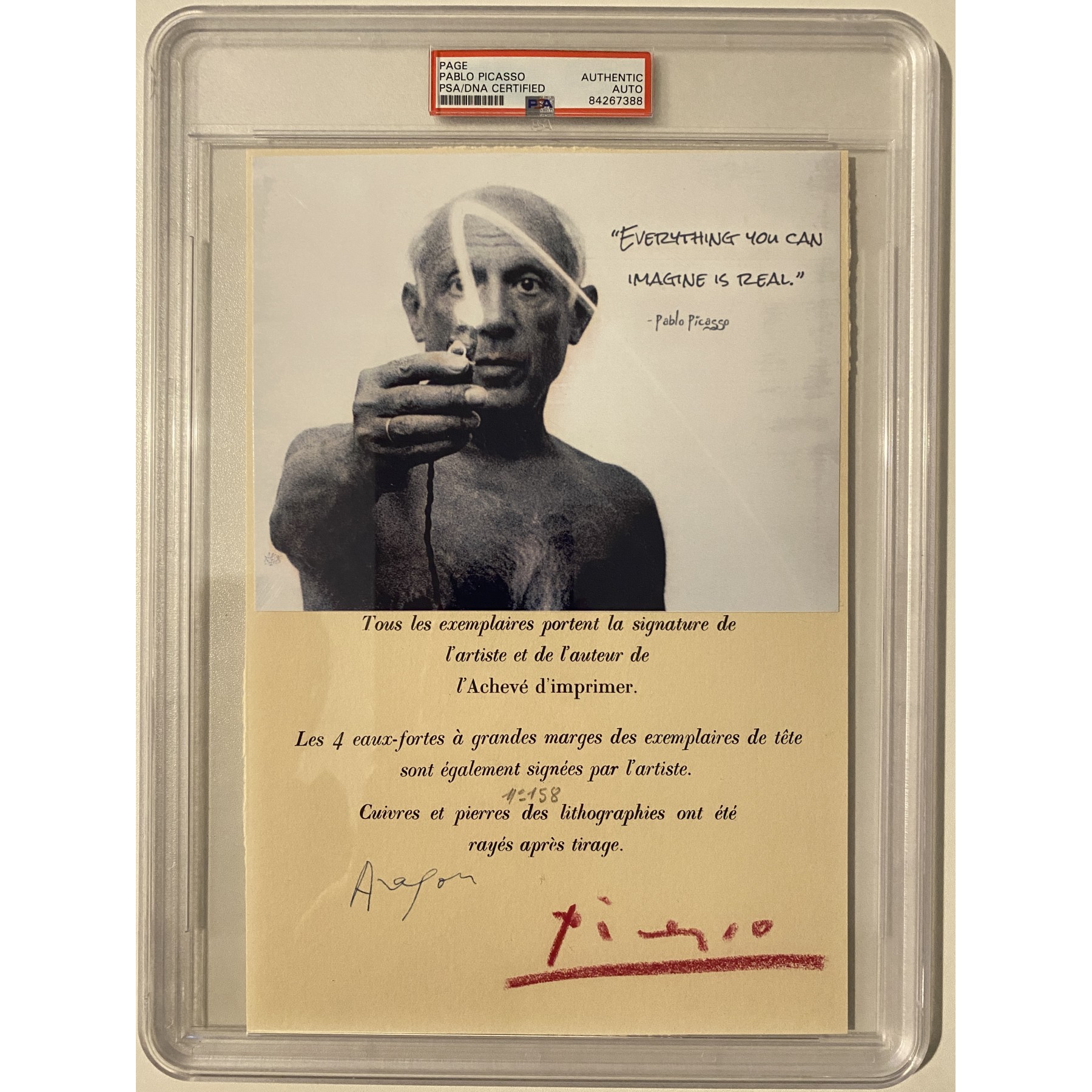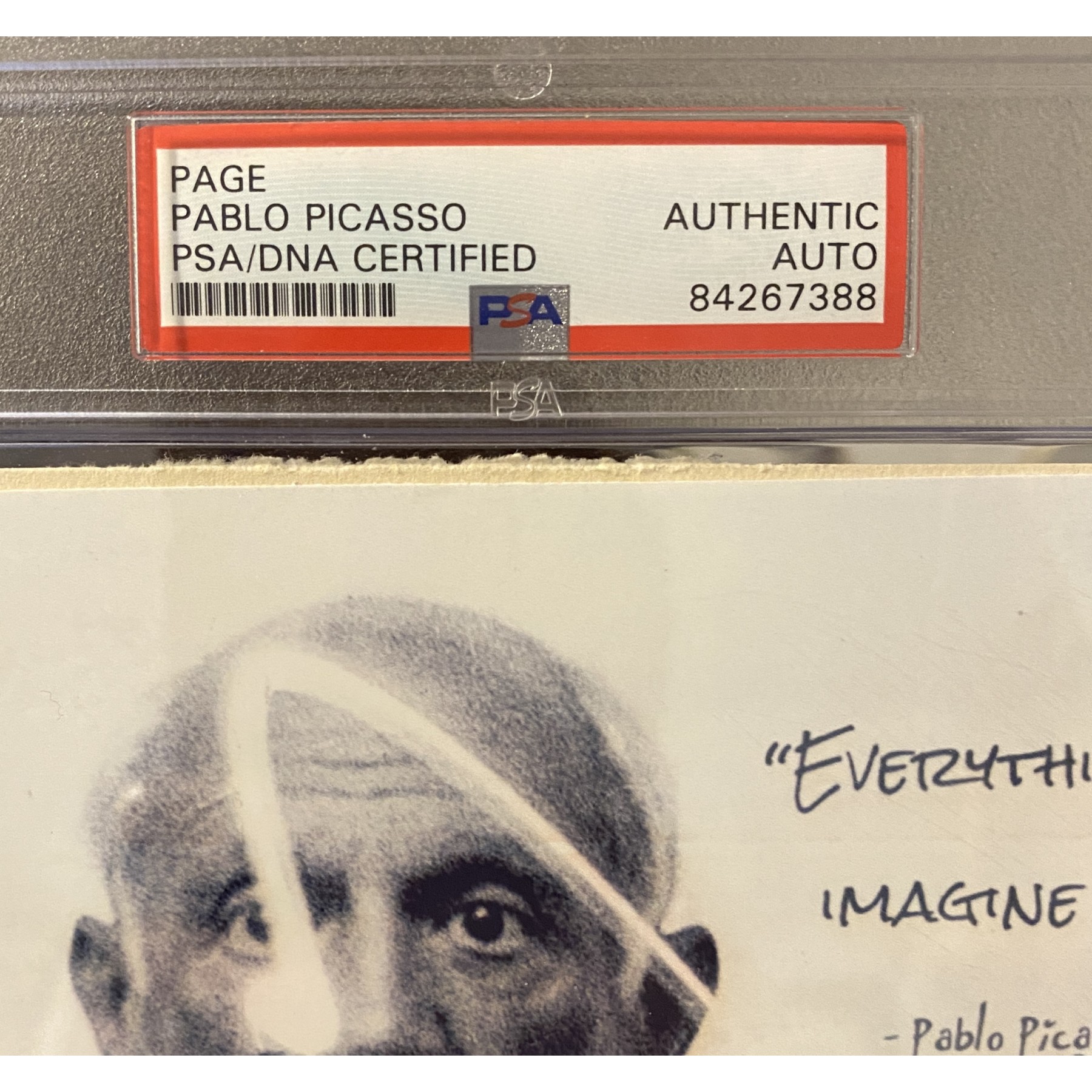 Item #0377 Pablo Picasso Signed Page - 7.5” x 11" - PSA Encapsulated w/ LOA