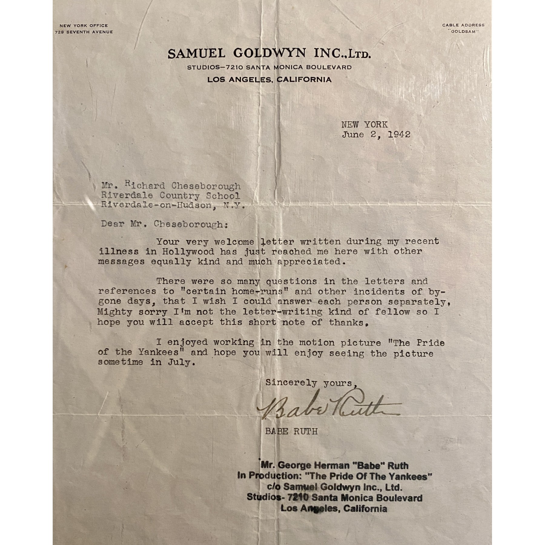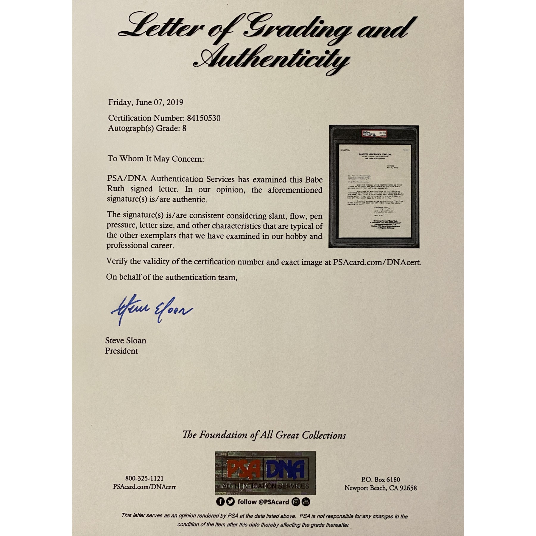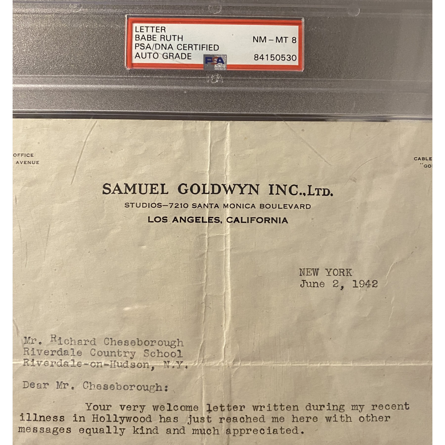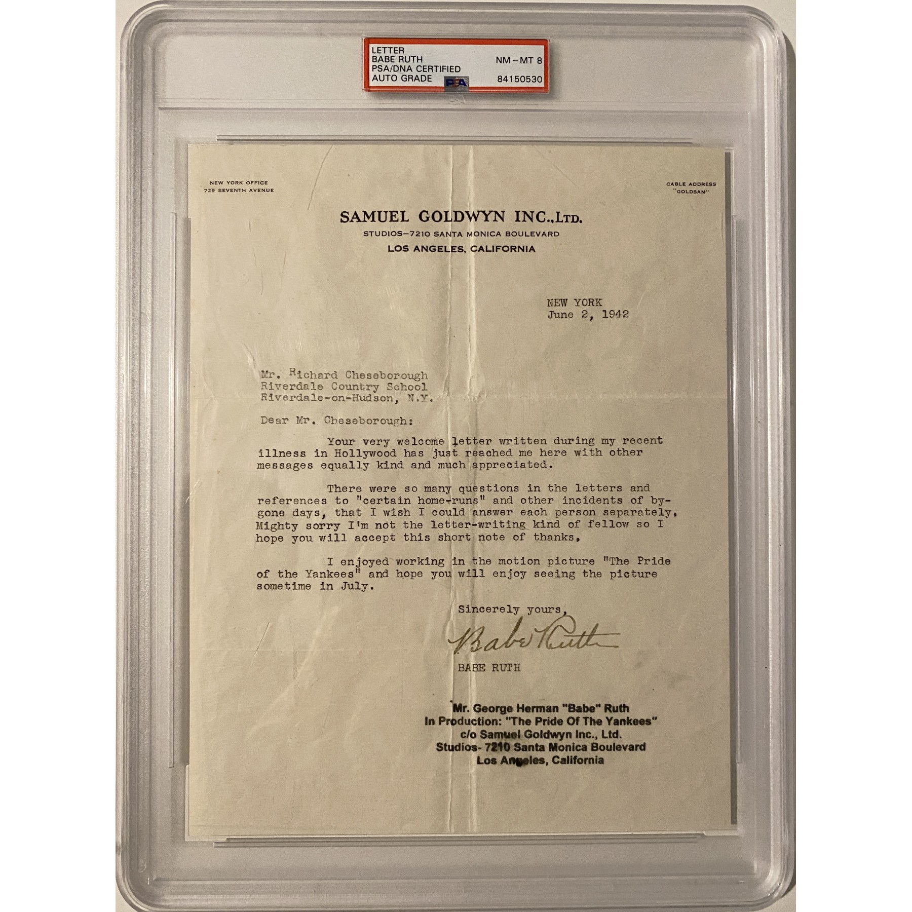 This 1942 letter, signed boldly by Babe Ruth on Samuel Goldwyn Inc letterhead, is in response to multiple fan questions shortly following his time working on the movie βThe Pride of The Yankees.β Encapsulated with an autograph grade of 8 and accompanied by a PSA/DNA Letter of Authenticity.