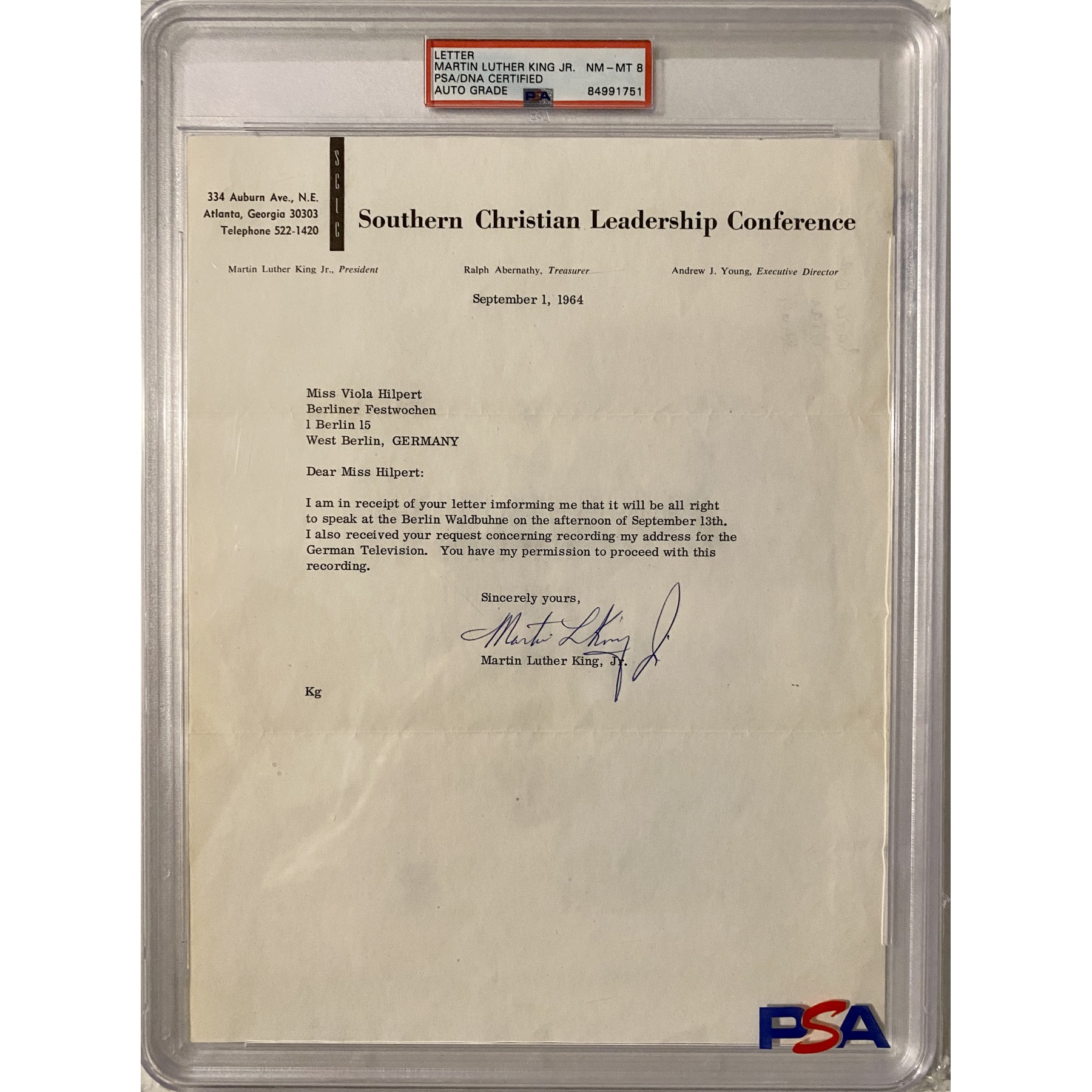 This 1964 letter, signed boldly in blue ink by Martin Luther King Jr., confirms his upcoming televised speech in Berlin, Germany. Encapsulated with an autograph grade of 8, it is a historic piece representing just a moment in the civil rights movement Dr. King was leading. Comes complete with a PSA/DNA Letter of Authenticity.