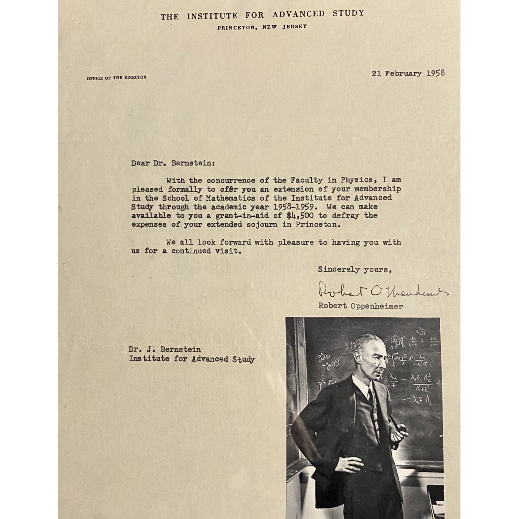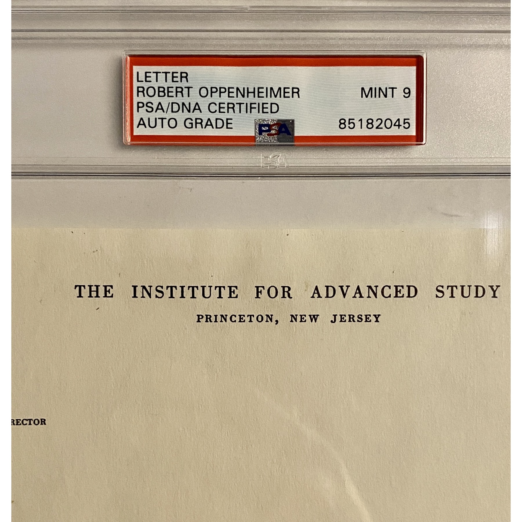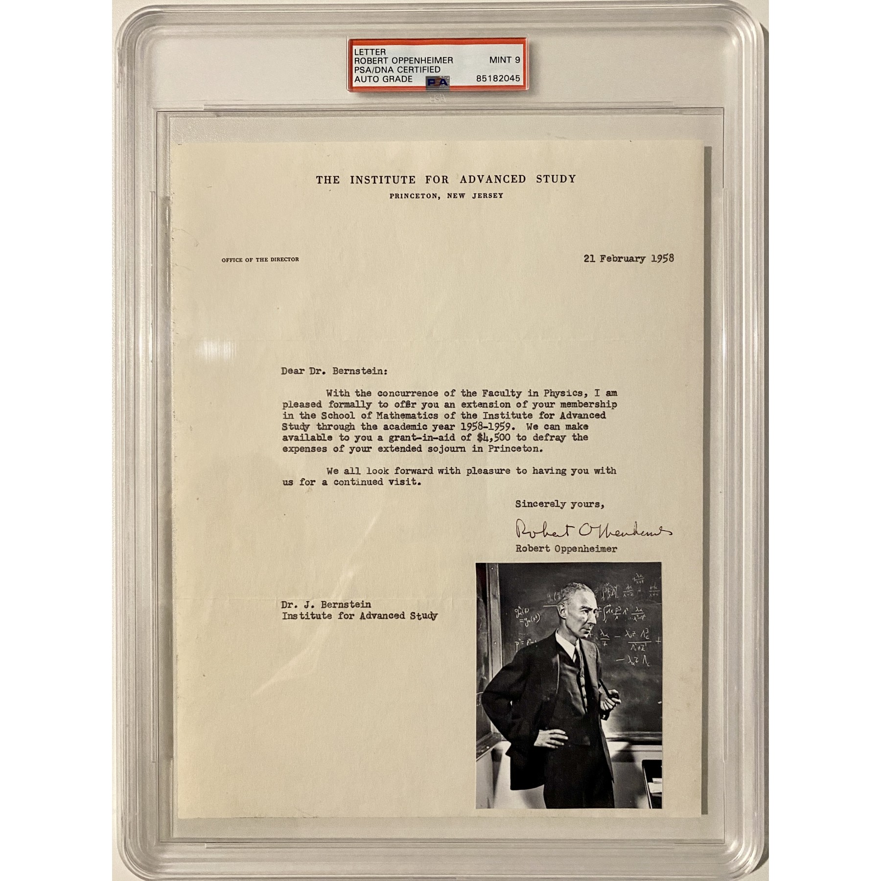 This 1958 signed letter by Robert Oppenheimer extends an offer of membership in the Mathematics Department at the Institute for Advanced Study to Dr. Jeremy Bernstein, a fellow Los Alamos alumnus and nuclear bomb researcher. Boldly signed in black pen, this historic piece captures a unique moment between two brilliant minds of the Atomic Age. The letter is encapsulated with a PSA letter of authenticity & auto grade of Mint 9.
