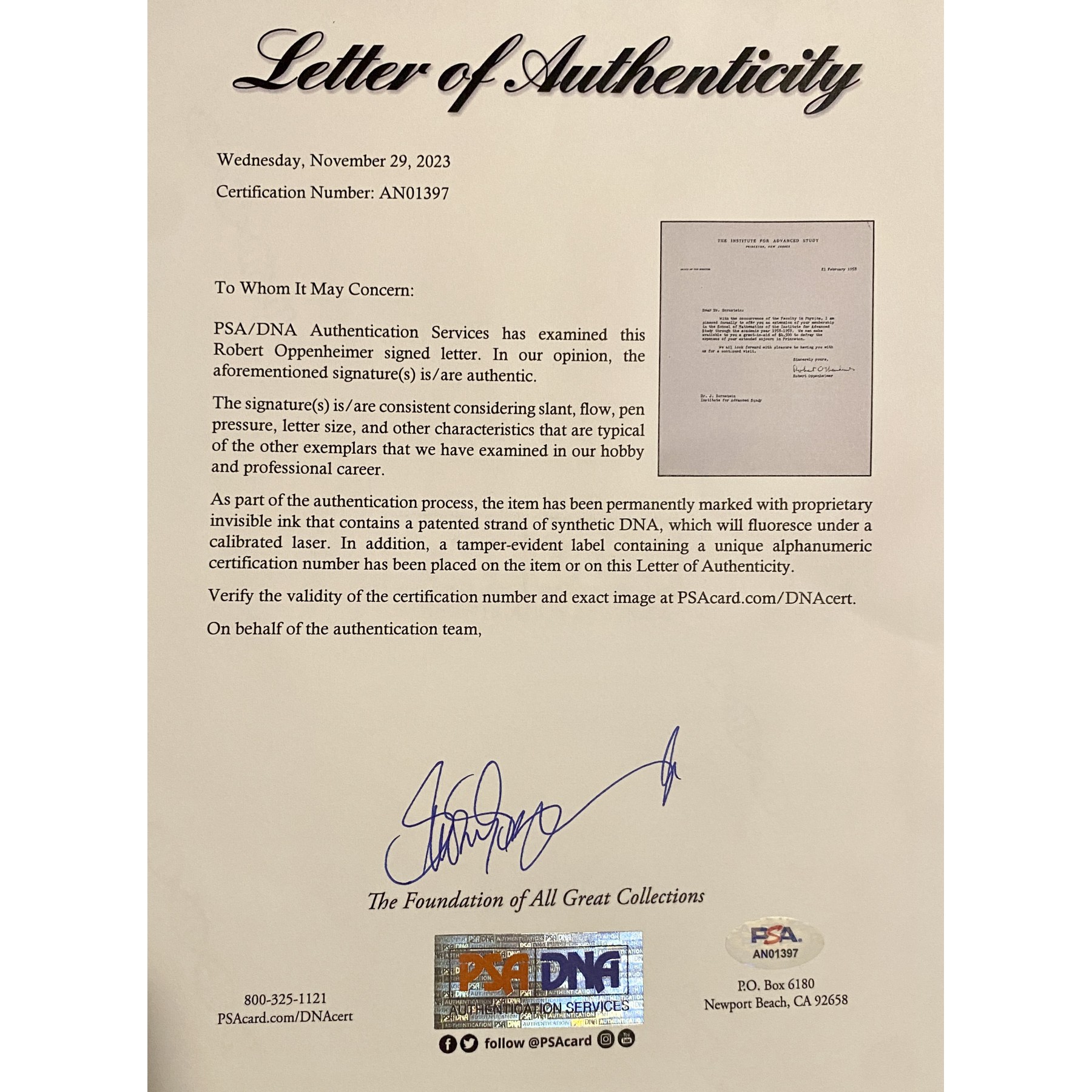 Authentication: PSA/DNA Letter of Authenticity