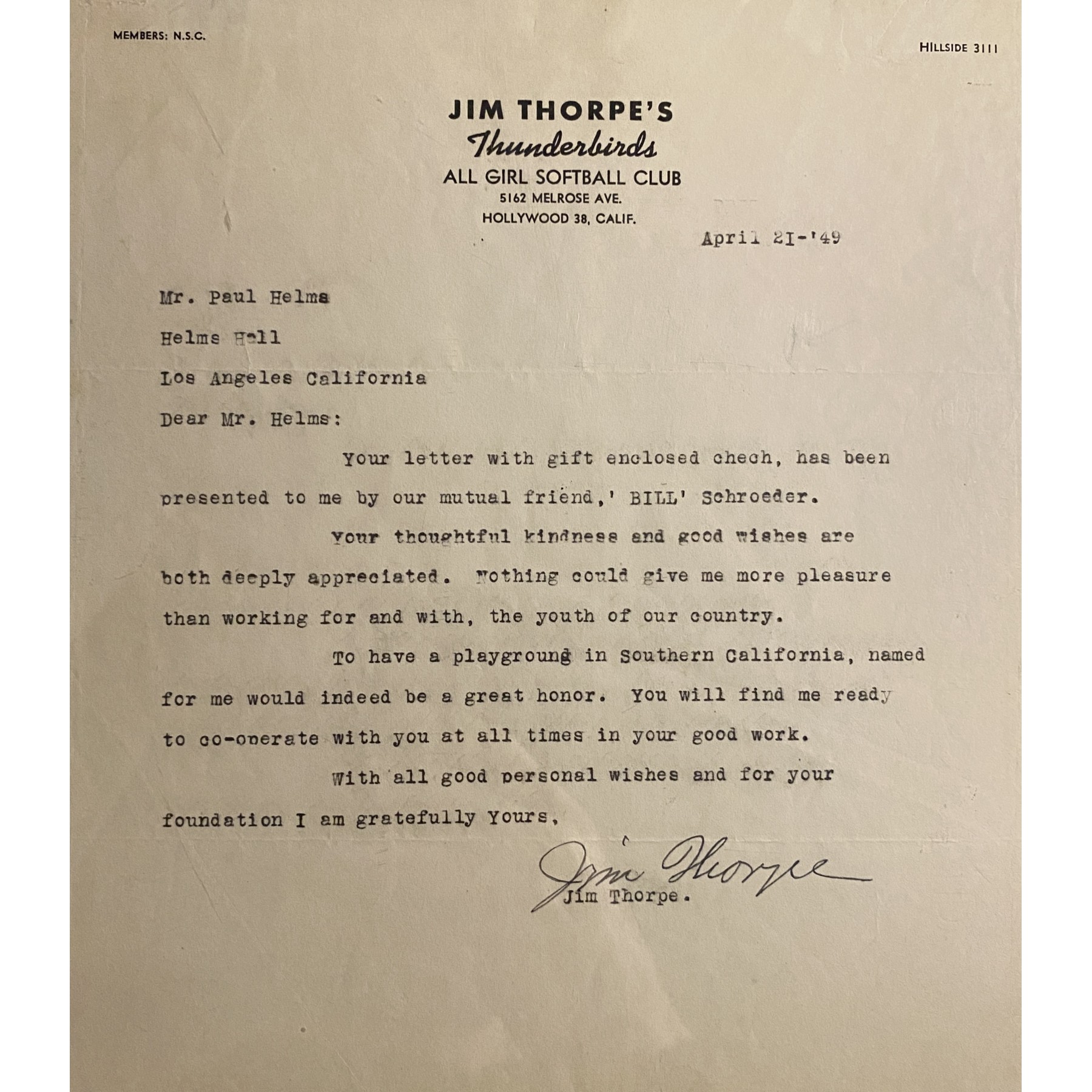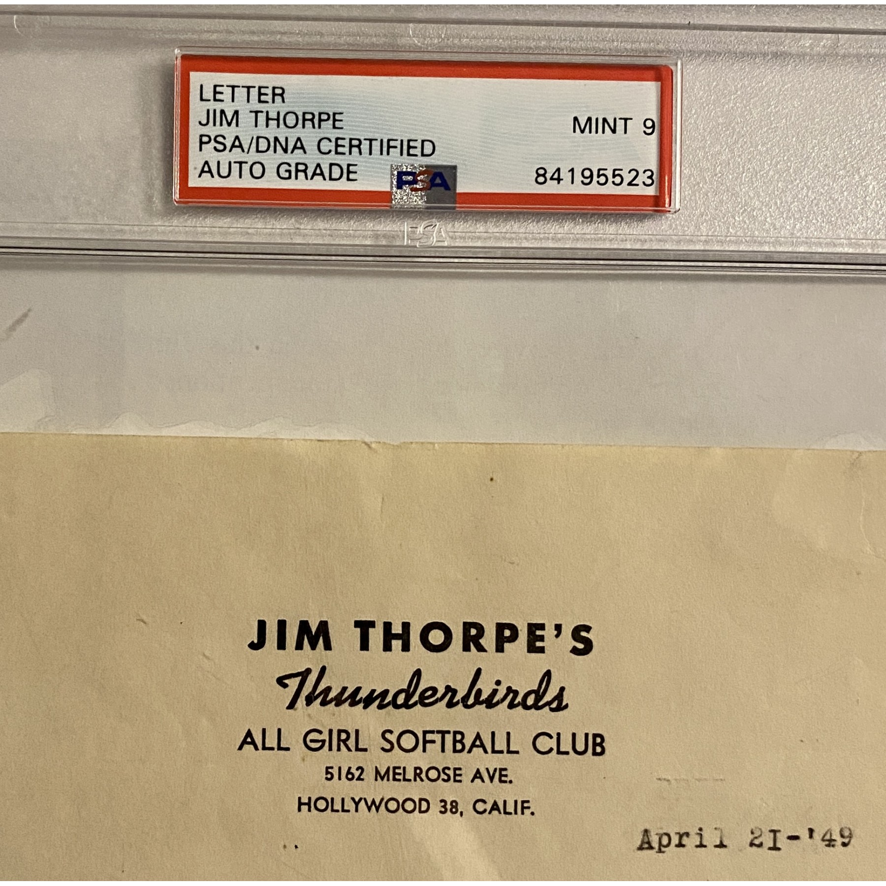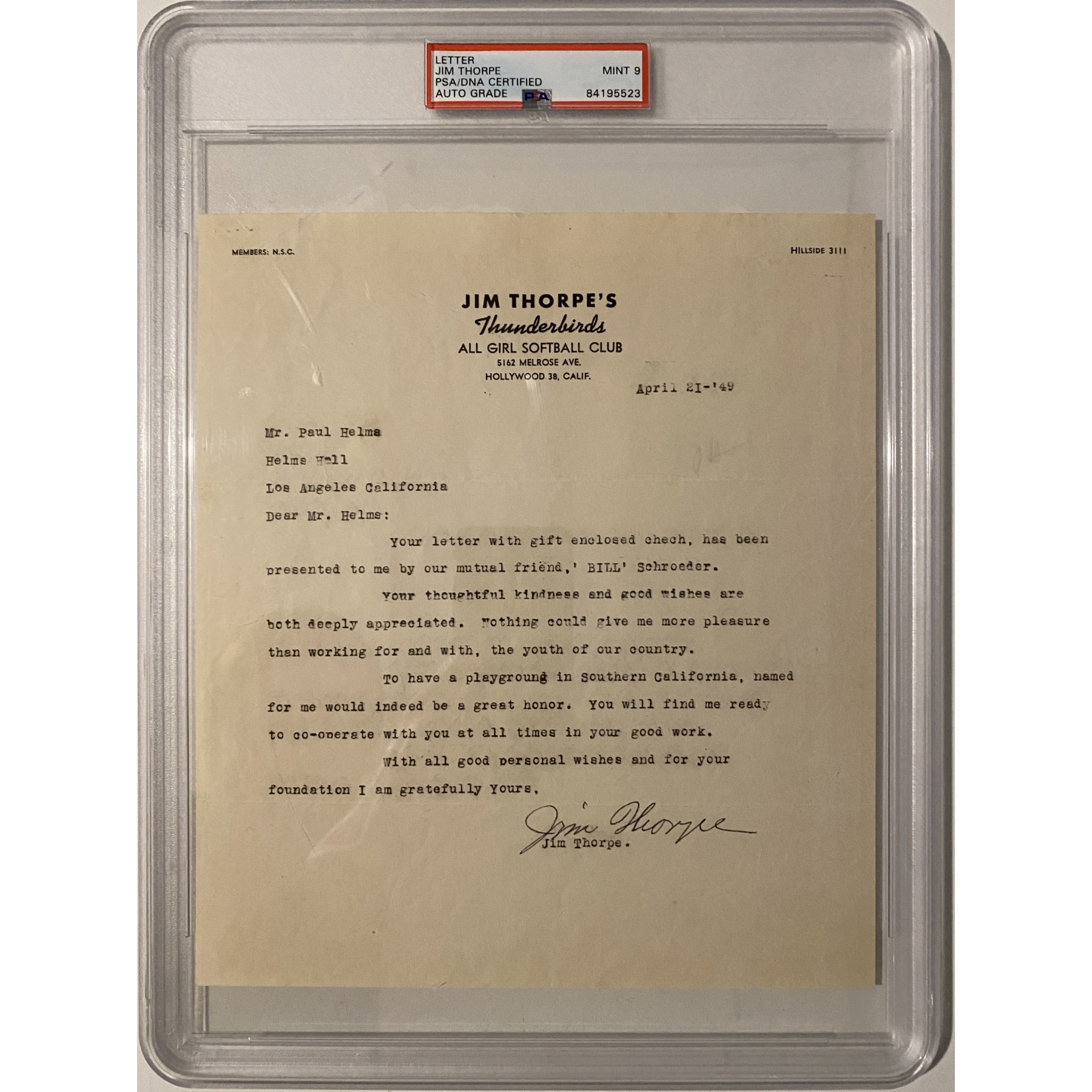 This 1949 signed letter by Jim Thorpe on "Jim Thorpe's Thunderbirds" letterhead, is a warm thank-you note, expressing appreciation for a donation to his All Girls Softball Club, with mention of a park named in his honor (Jim Thorpe Park is in Hawthorne, CA). Widely regarded as one of the greatest athletes in history, Thorpe excelled in football & baseball, and won gold medals in the 1912 Olympics. The letter is encapsulated with a PSA letter of authenticity & Mint 9 auto grade - a remarkable piece for any sports memorabilia collection.