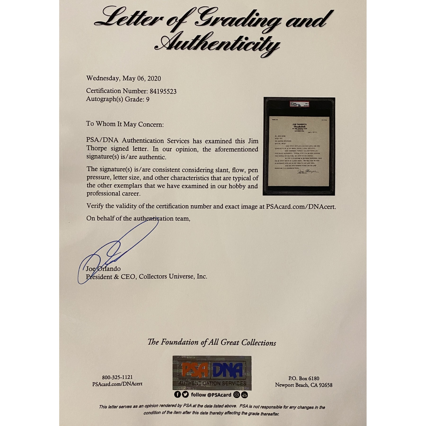Item #0397 Jim Thorpe Signed 1949 Letter - PSA Mint 9 Auto