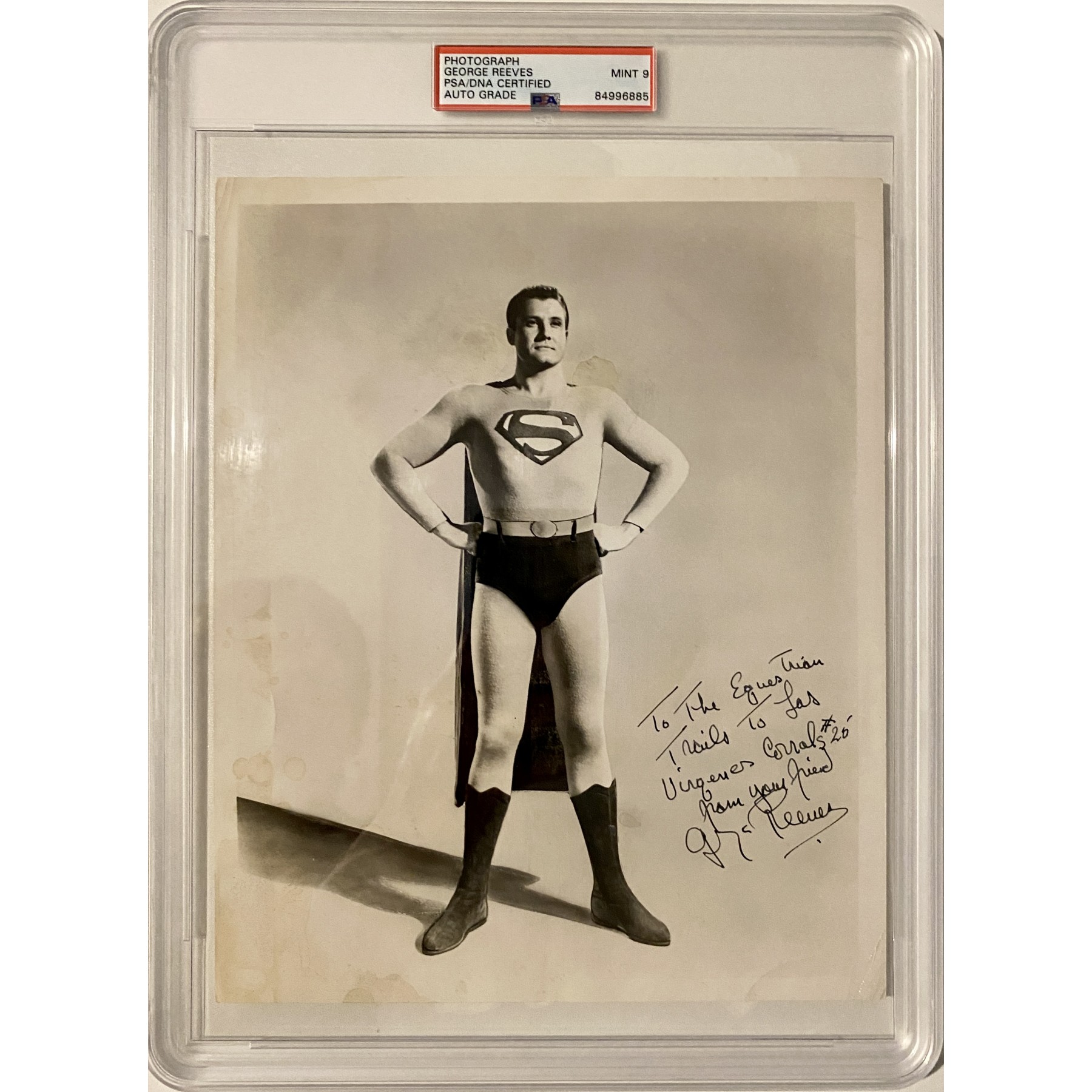This 8" x 10" photo of actor George Reeves as Superman is boldly signed, "To the Equestrian Trails to Las Virgines Corrals #20 / from your friend / George Reeves," presented as a gift to famed martial artist Bruce Tegner, who collaborated with Reeves on stunts for "Adventures of Superman." The signature is encapsulated with a PSA letter of authenticity & Mint 9 auto grade.