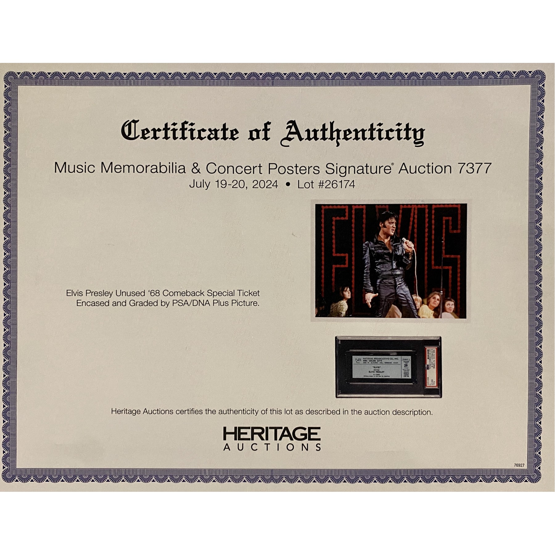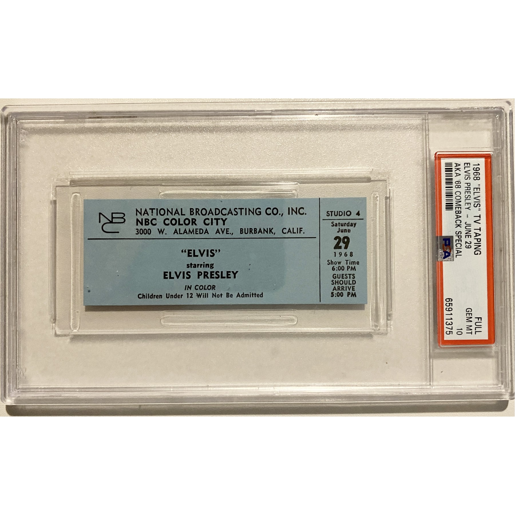 This pristine ticket from Elvis Presley’s 1968 Comeback Special is a rare collector's item and is encapsulated with a PSA Gem Mint 10 grade. The iconic '68 Comeback Special, aired on December 3, marked Elvis's triumphant return to live performance after years in Hollywood focusing on films, showcasing his raw talent and captivating stage presence. This special, often considered one of his greatest performances, revived his career and became a milestone in music history. Photo included.