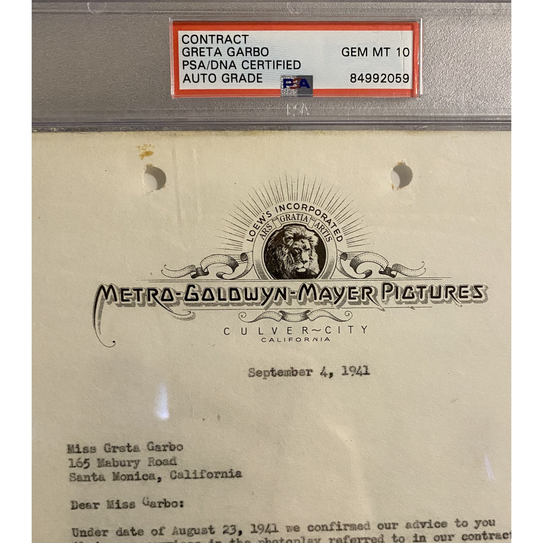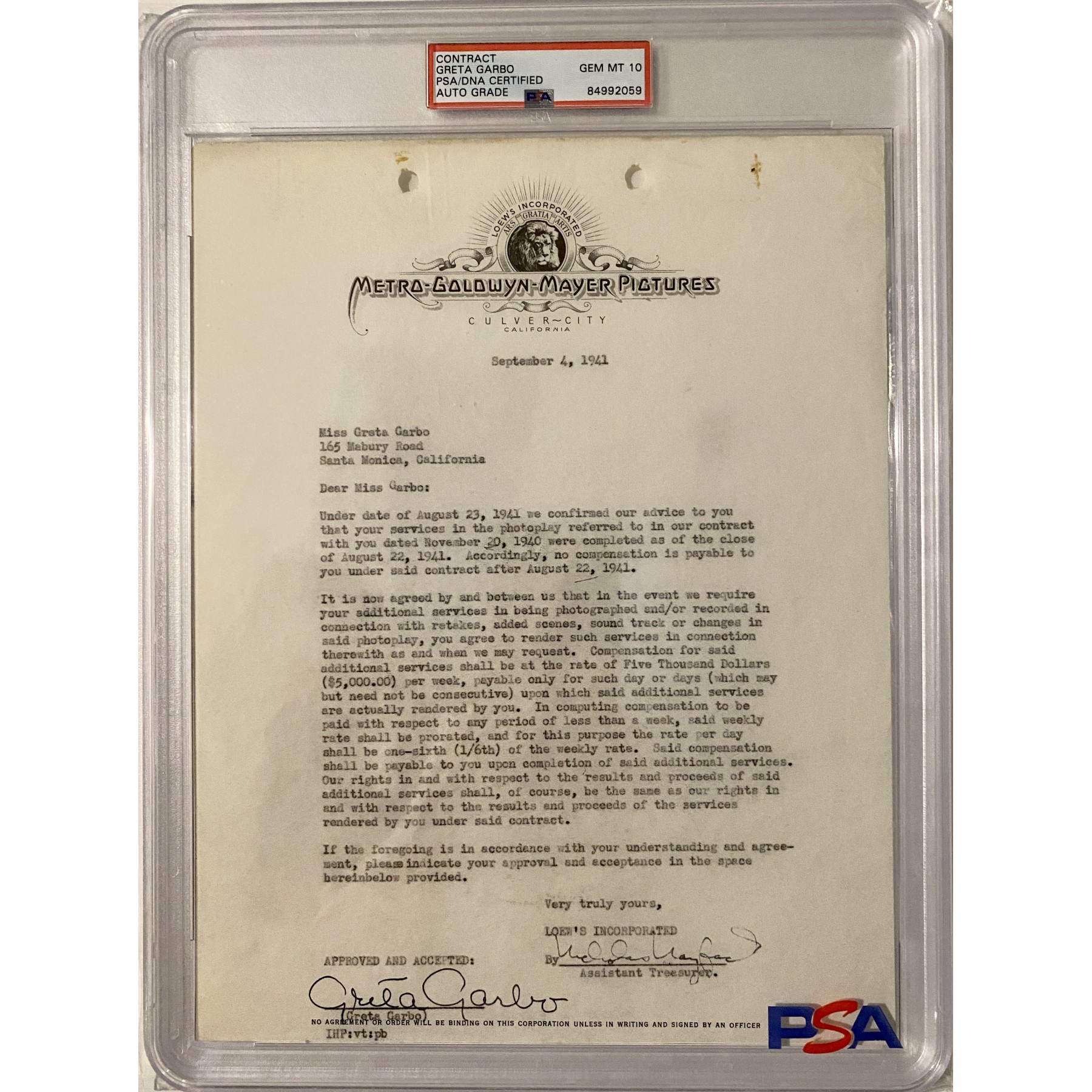 This 1941 MGM Pictures contract is signed boldly by the enigmatic Greta Garbo, one of classic Hollywood’s most celebrated stars. Known for her performances in films like "Camille" and "Grand Hotel", Garbo’s mystique and talent made her a screen legend. The contract, on official MGM letterhead, outlines payment terms for any additional services beyond her initial agreement. Encapsulated with a PSA letter of authenticity & Gem Mint 10 auto grade.