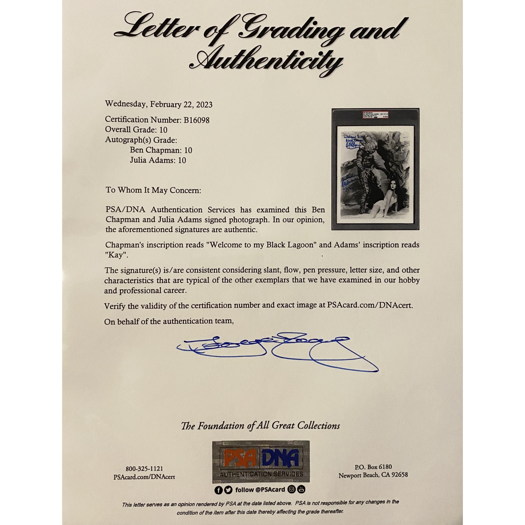 Dive into horror history with this signed 8" x 10" photo from the classic 1954 Universal monster film, Creature from the Black Lagoon. Ben Chapman, who portrayed the Gill-Man on land, inscribes, "Welcome to my Black Lagoon," while Julie Adams, who played Kay Lawrence, adds her character’s name. The film remains one of the most iconic monster movies, blending horror and adventure in the depths of the Amazon. Boldly signed in blue marker, this piece is encapsulated with Gem Mint 10 auto grades and comes with a PSA letter of authenticity - a true treasure for horror fans!