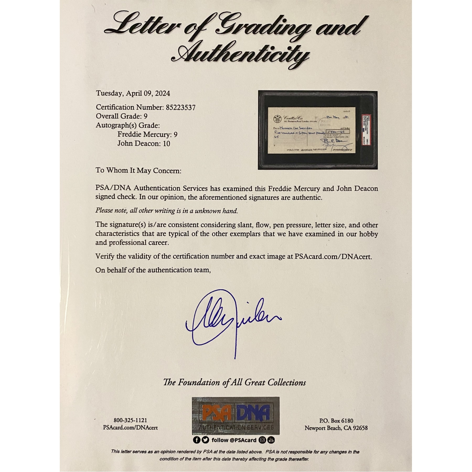 This set of three Coutts & Co bank checks features brilliantly bold, high grade signatures from all four members of Queen - Freddie Mercury, Brian May, Roger Taylor, and John Deacon. These historic documents, drawn on London banks between 1978-1981, include payments related to Raincloud Productions, Nightjar Productions, and Queen’s publicist Tony Brainsby. Each check is boldly signed in various inks, with autograph grades ranging from 8 to Gem Mint 10. All three are encapsulated and come with PSA letters of authenticity. A rare piece of Queen history!