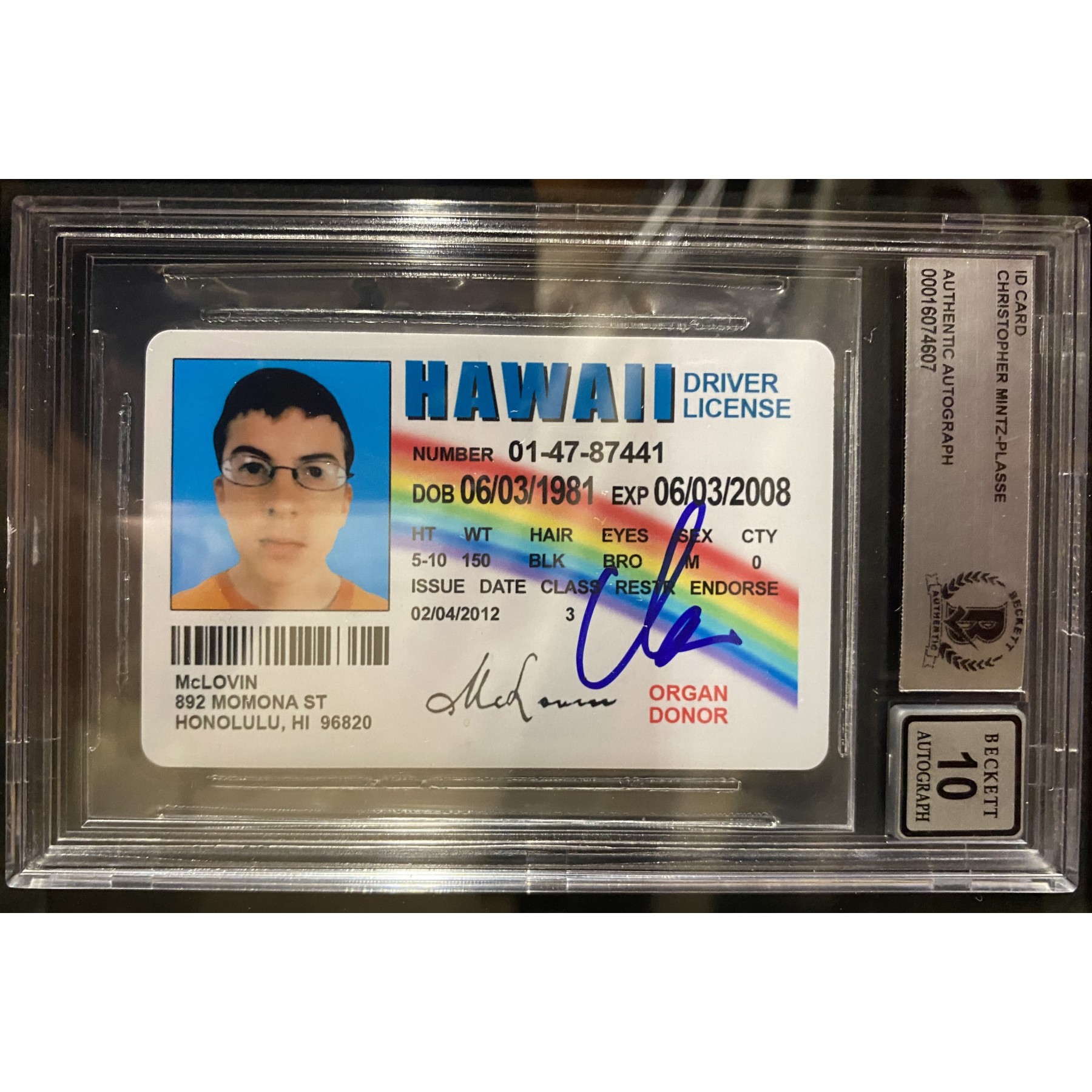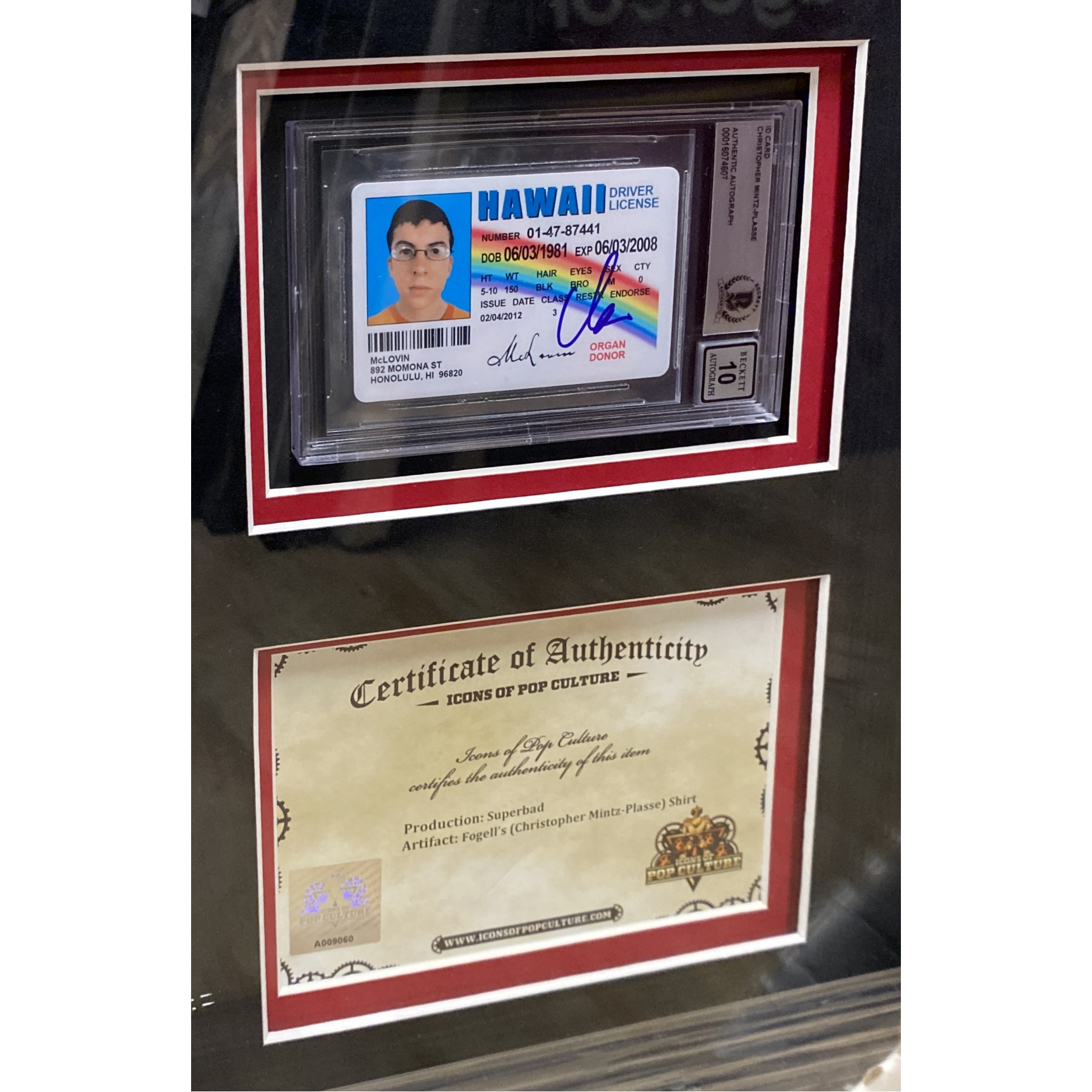 Own a piece of comedy history with this original screen-worn Spamalot T-shirt worn by Christopher Mintz-Plasse as “Fogell”, aka “McLovin”, in the movie Superbad (2007). This exact shirt appears in the film’s flashback sequence and is showcased in a professionally framed 34” x 42” display. Comes with a Certificate of Authenticity from Icons of Pop Culture, who brokers screen-used props for several movie studios in Hollywood. Also included is a replica "McLovin" driver’s license boldly signed by Mintz-Plasse in blue felt tip, encapsulated by Beckett with a perfect autograph grade of 10. A rare, iconic set for any Superbad or film collector!