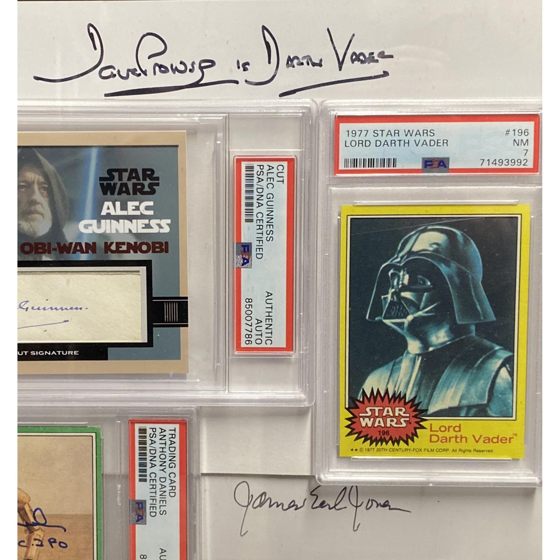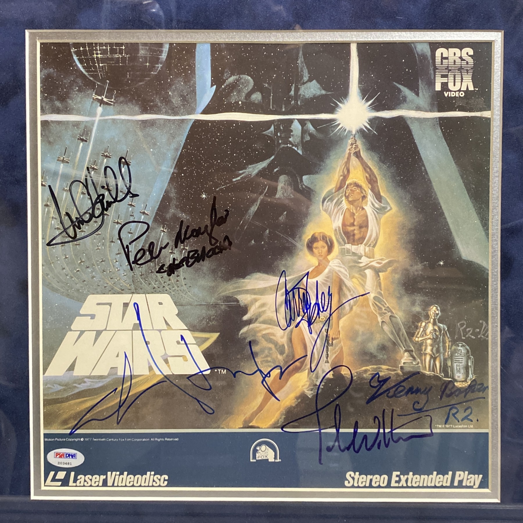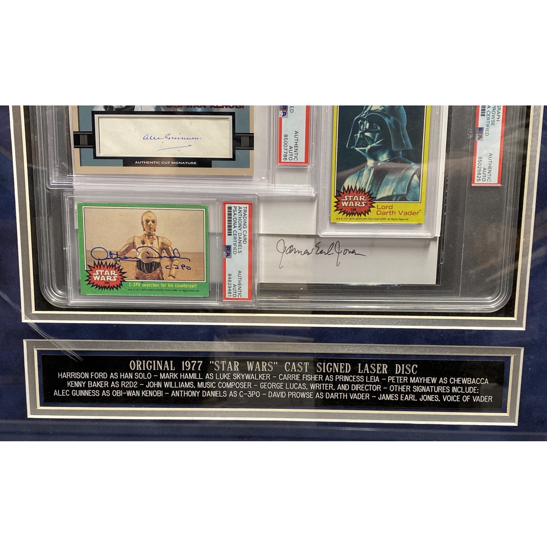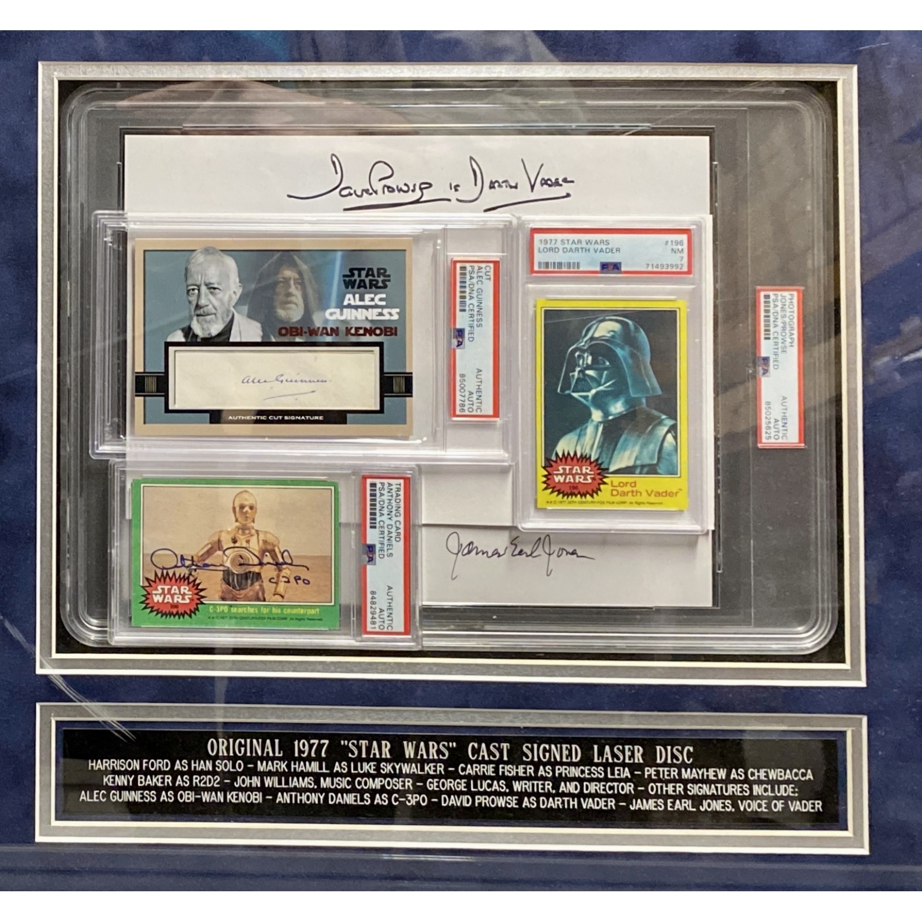 The Force is strong with this one! This incredible Star Wars framed display features a 1977 Star Wars laserdisc signed boldly in blue & black felt tip by the legendary full cast of the original 1977 "Star Wars": Mark Hamill, Harrison Ford, Carrie Fisher, Peter Mayhew, Kenny Baker; director George Lucas, and composer John Williams. This item comes with a PSA letter of authenticity. Also included are four PSA-encapsulated Star Wars memorabilia items: 2 trading cards featuring signatures from Alec Guinness & Anthony Daniels, a 1977 Star Wars Darth Vader trading card, & a photo featuring David Prowse & James Earl Jones’ signatures. This epic piece unites the saga’s most iconic names in one stunning 32" x 18" framed presentation!