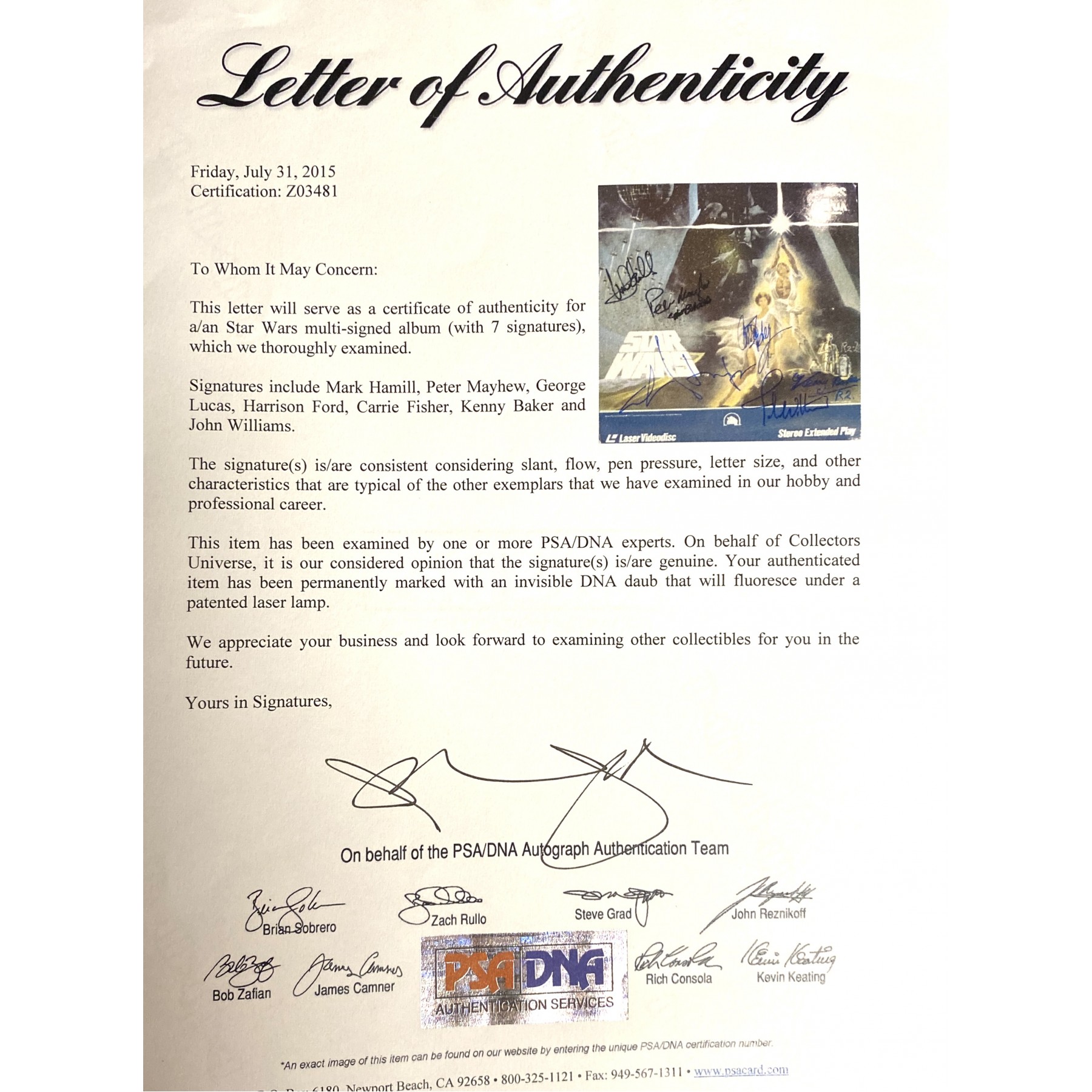 Authentication: PSA/DNA Letter of Authenticity