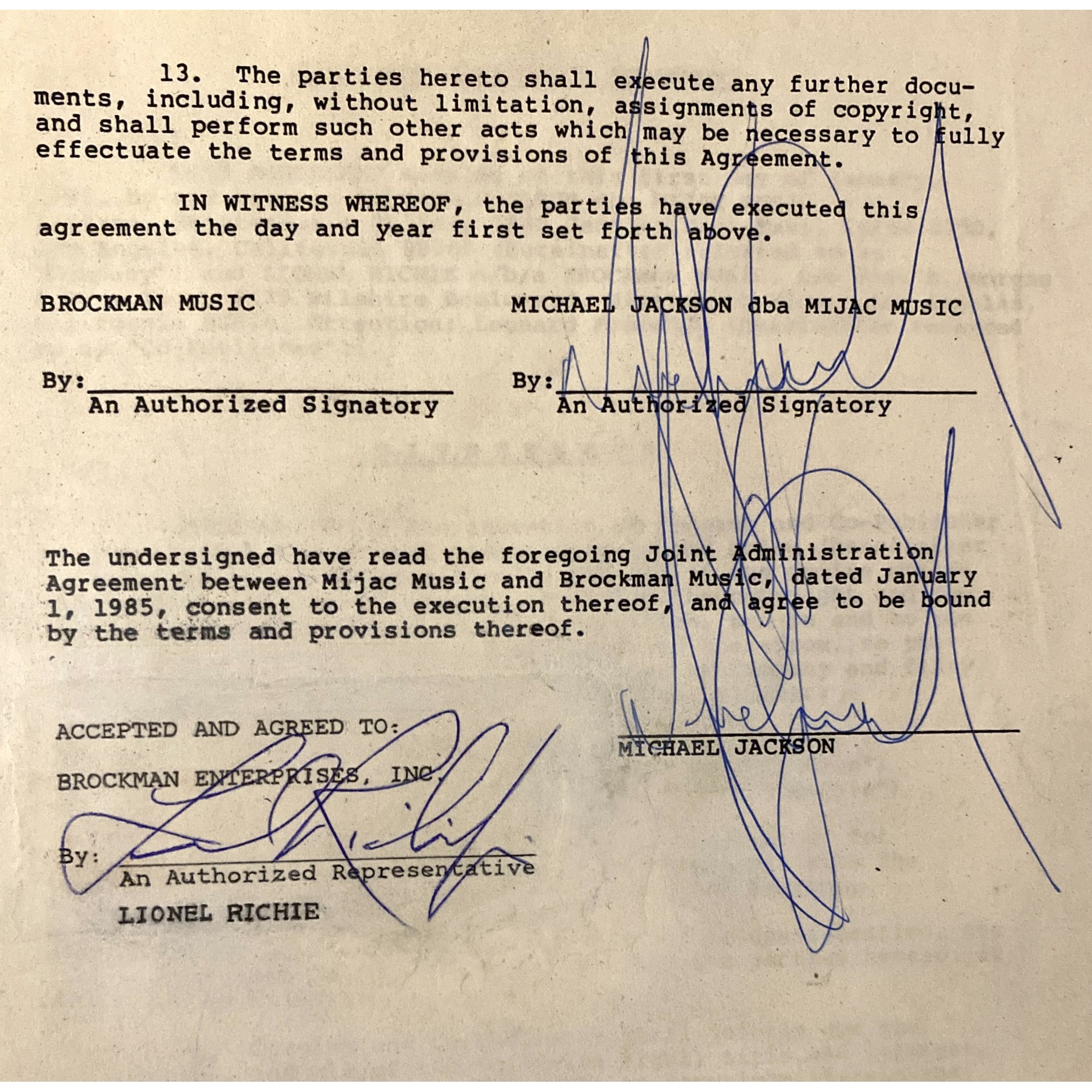 This amazing one-of-a-kind contract concerning the recording and promotion of the historic "We are the World" charity single is signed by co-writers Michael Jackson - twice - and Lionel Richie. Dated January 1, 1985, this document is the origin of the fundraising anthem recorded by the USA for Africa super group of more than 40 legendary musicians, including Michael Jackson, Bruce Springsteen, Bob Dylan, Stevie Wonder, Paul Simon, Billy Joel, Ray Charles, Diana Ross, Tina Turner, Steve Perry, and many more.