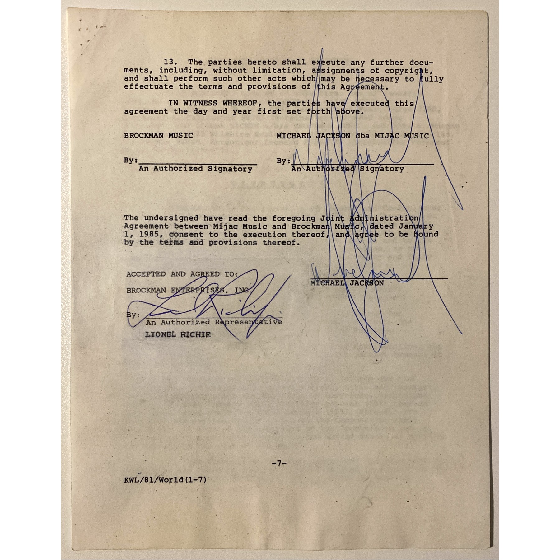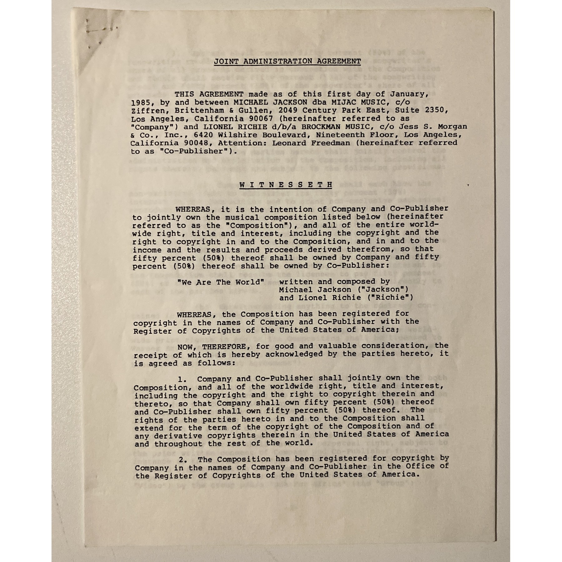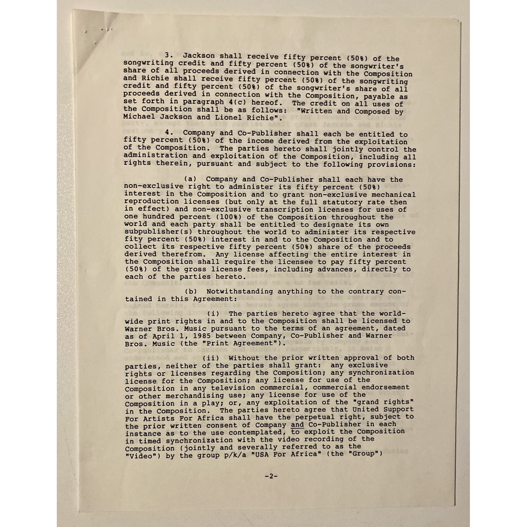 This 8.5" x 11", seven-page document is a joint agreement between Michael Jackson and Lionel Richie splitting the credit for songwriting 50/50, and directing all royalties and proceeds received from "We Are The World" are to be donated 100% to victims of the famine in Africa.