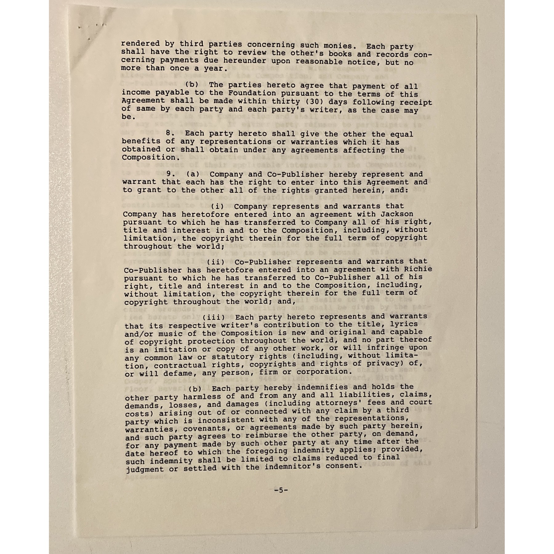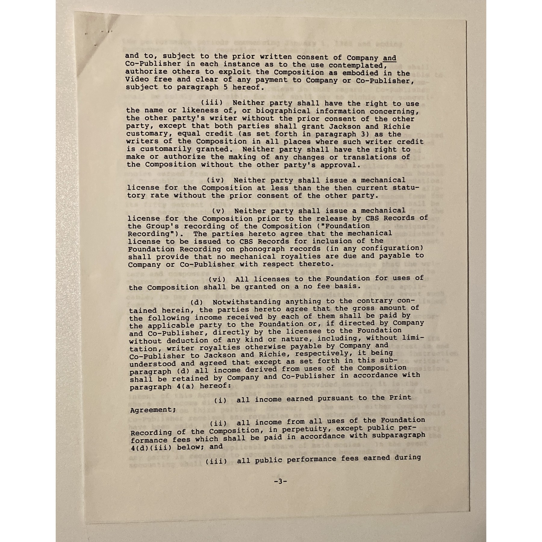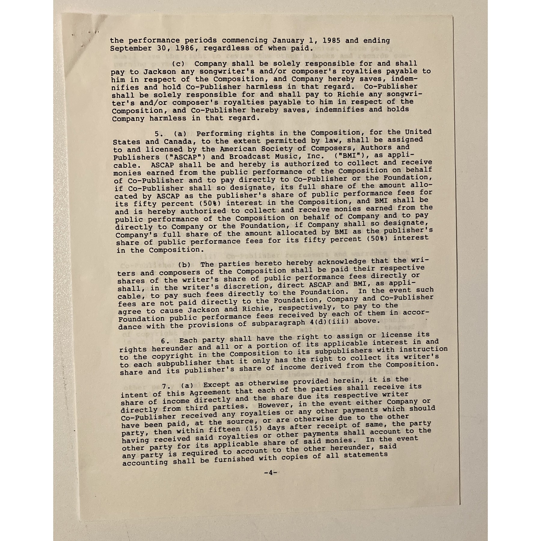 This 8.5" x 11", seven-page document is a joint agreement between Michael Jackson and Lionel Richie splitting the credit for songwriting 50/50, and directing all royalties and proceeds received from "We Are The World" are to be donated 100% to victims of the famine in Africa.