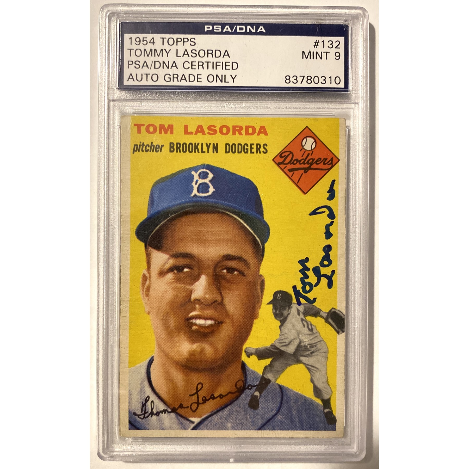 This 1954 Topps #132 Tommy Lasorda card features a bold blue ink signature. PSA authenticated and encapsulated with a mint 9 autograph grade.