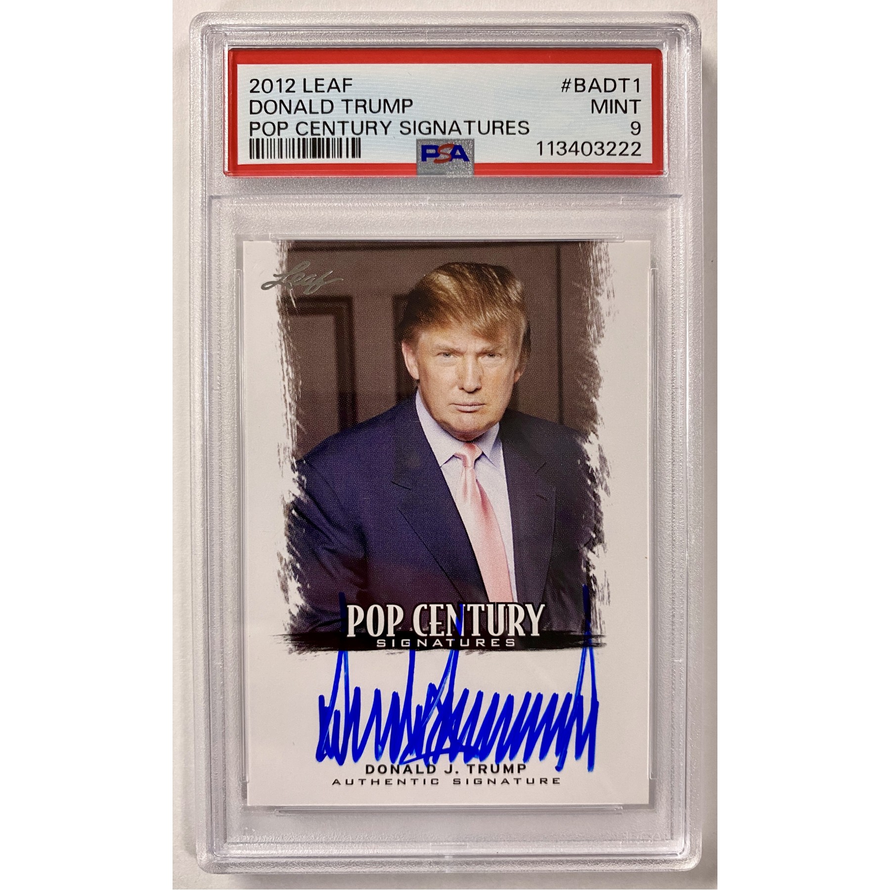 This Donald Trump signed 2012 Leaf Pop Century Signatures #BA-DT1 has been authenticated & PSA encapsulated with a Mint 9 grade. The card features a perfect & extremely bold signature in blue ink.