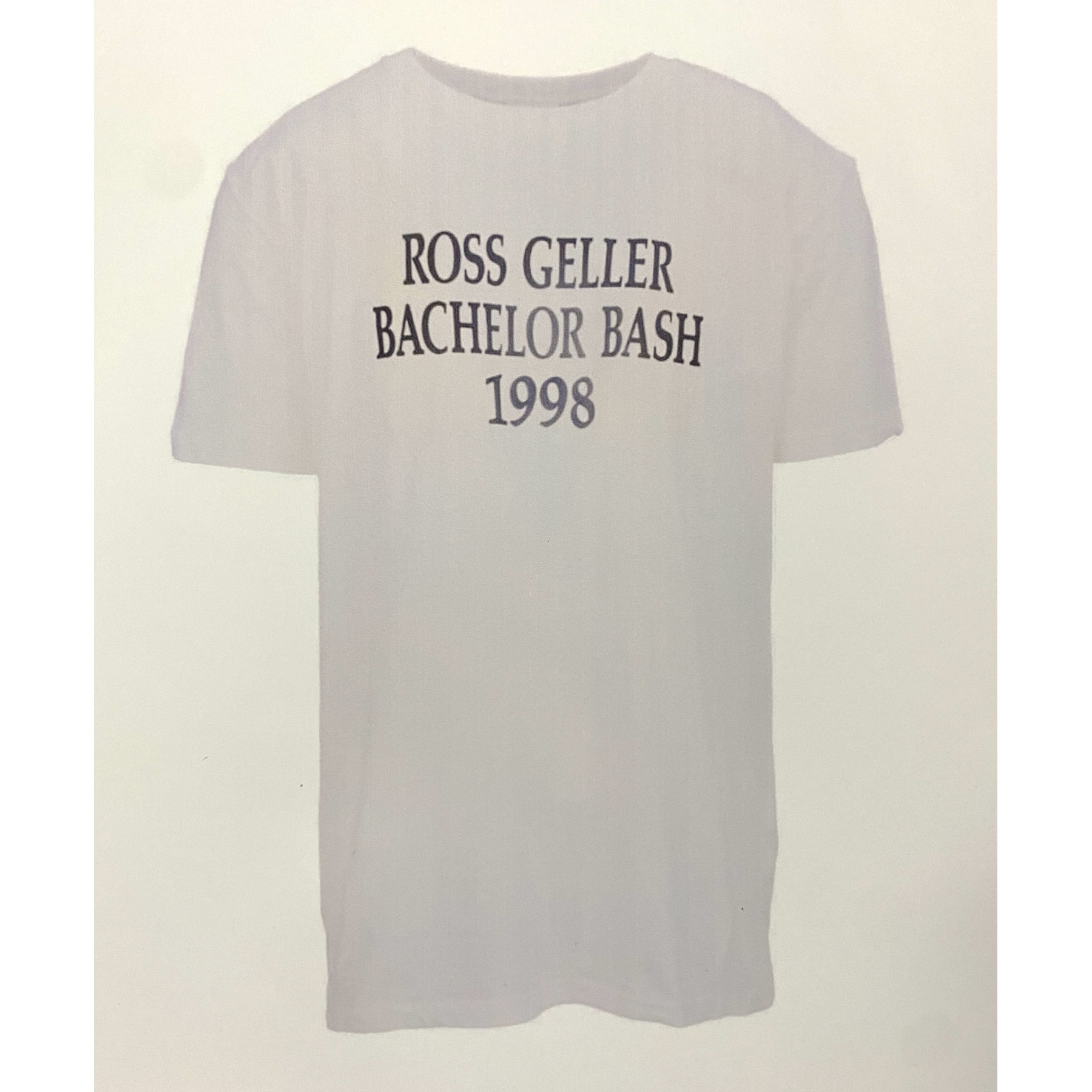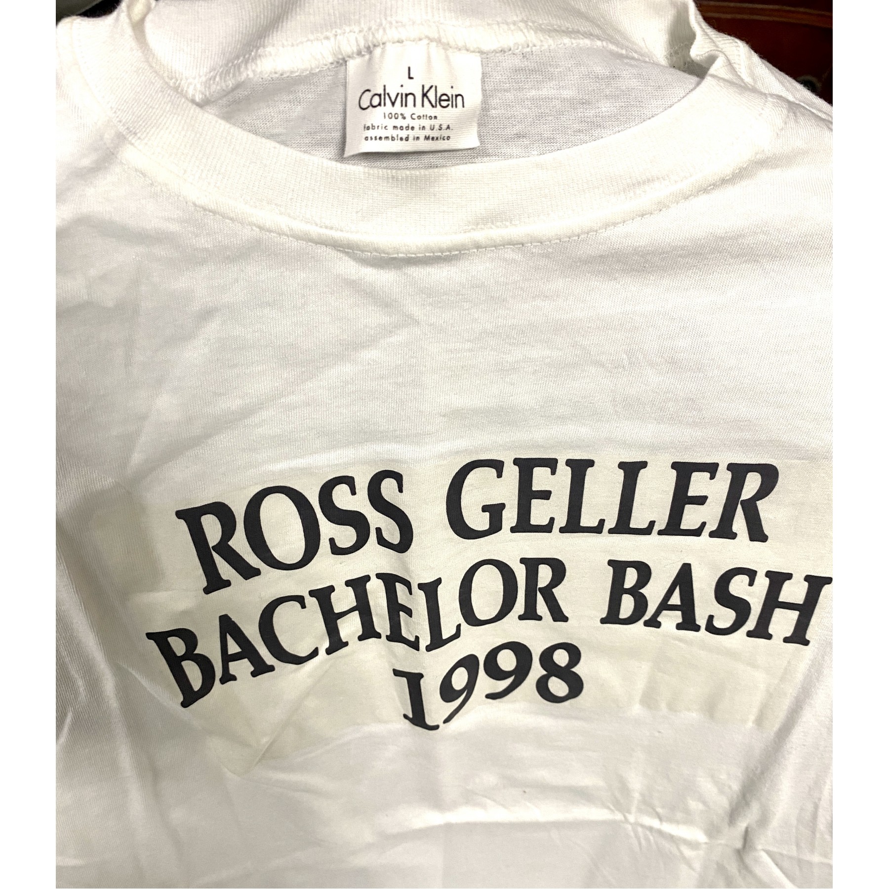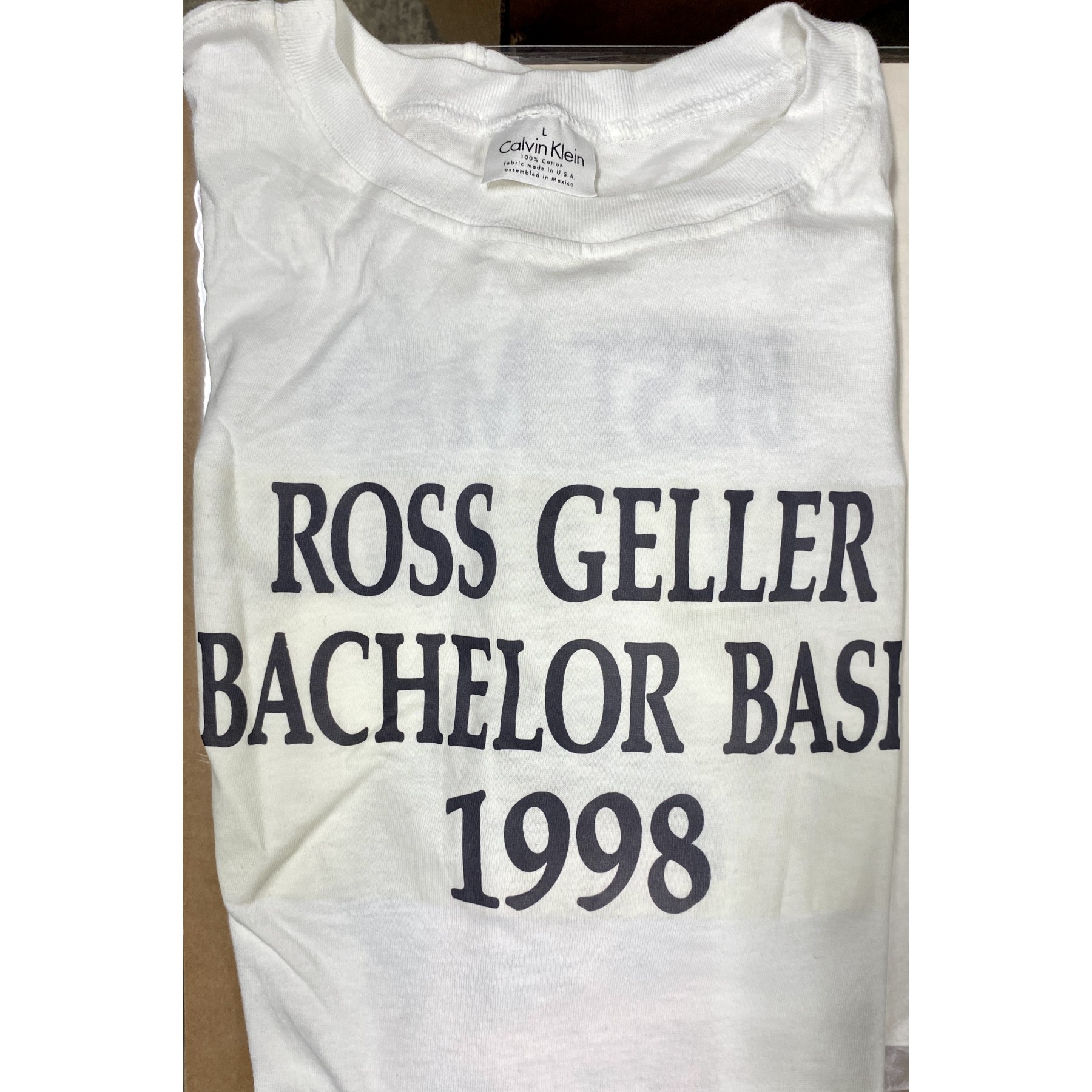 This original Calvin Klein bachelor party t-shirt from the production of the "Friends" episode "The One with the Worst Best Man Ever", "ROSS GELLER / BACHELOR BASH / 1998" is silk-screened in black on the front, and an image of Matt LeBlanc as Joey Tribbiani is silk-screened on the back with the words "BEST MAN / JOEY TRIBBIANI."