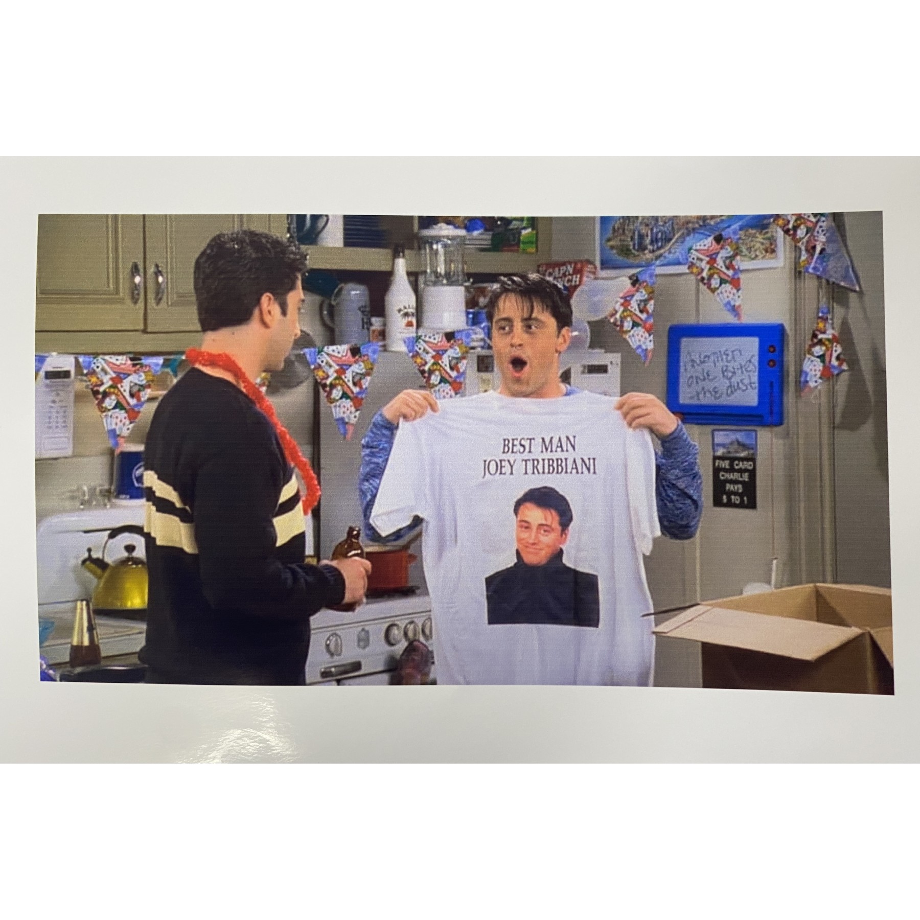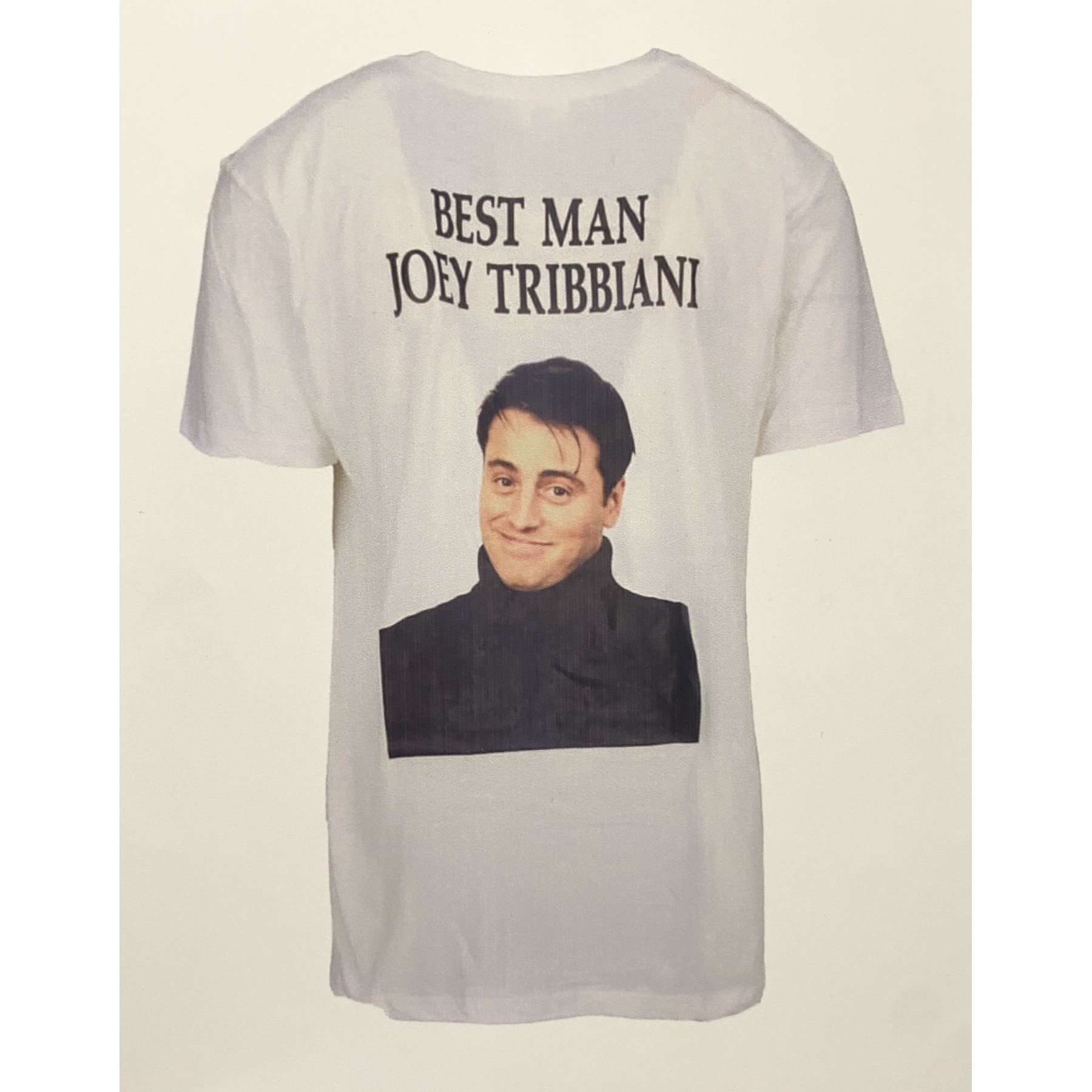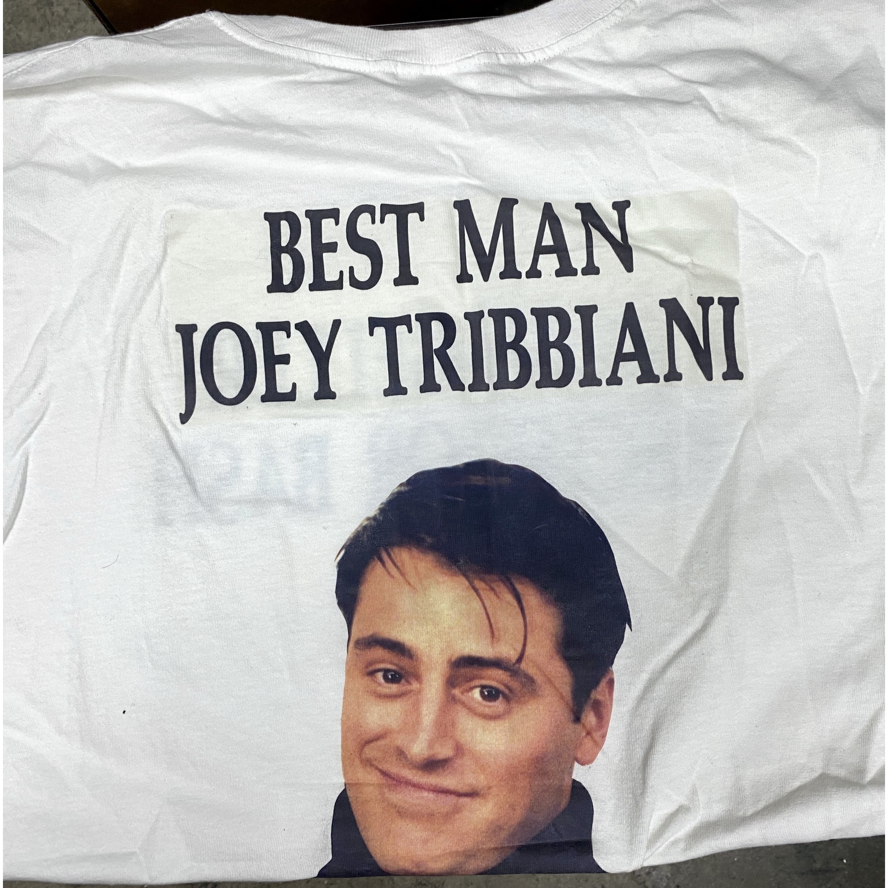 In the season four episode, Joey organizes a bachelor party for Ross before his wedding to fiancé Emily. Ross has selected Joey as his best man, much to Chandler's chagrin. At the party, Joey passes out these t-shirts as party favors. Matt LeBlanc wears one in the next scene, when Joey wakes up in the t-shirt and realizes that he slept with the stripper from the party and lost Ross's wedding ring.